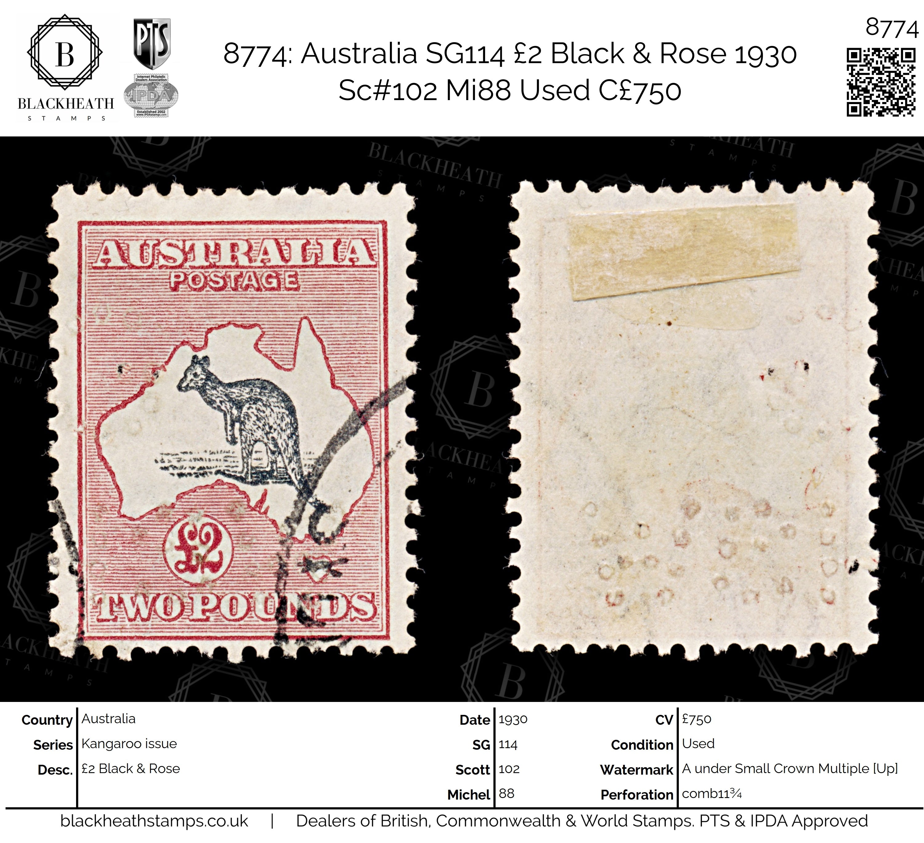 8774: Australia SG114 £2 Black & Rose 1930 Sc#102 Mi88 Uséd C£750