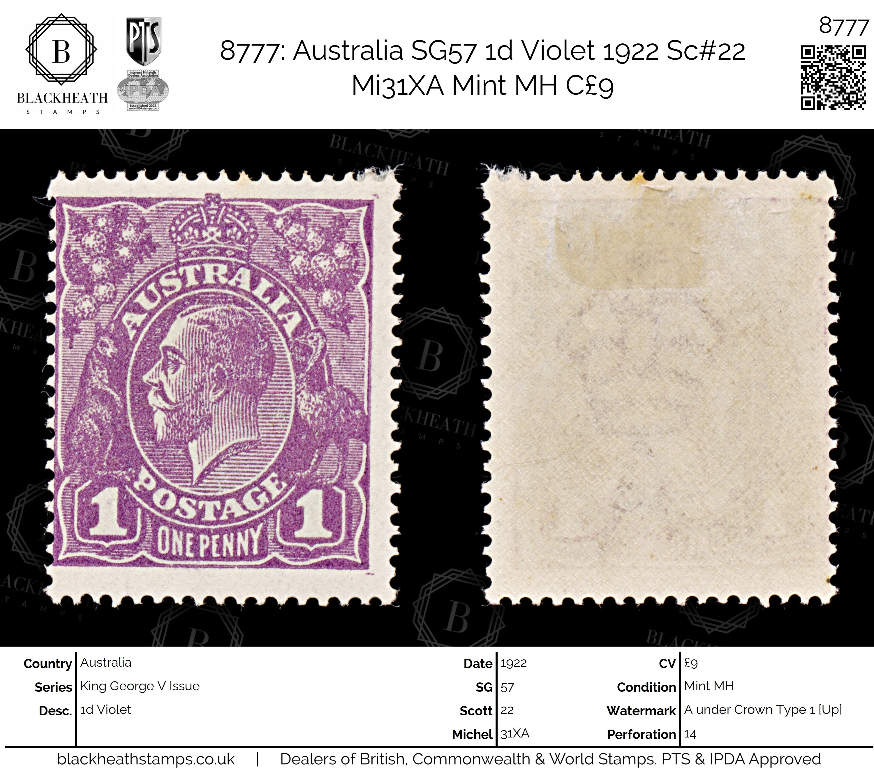 8777: Australia SG57 1d Violet 1922 Sc#22 Mi31XA Mint MH C£9