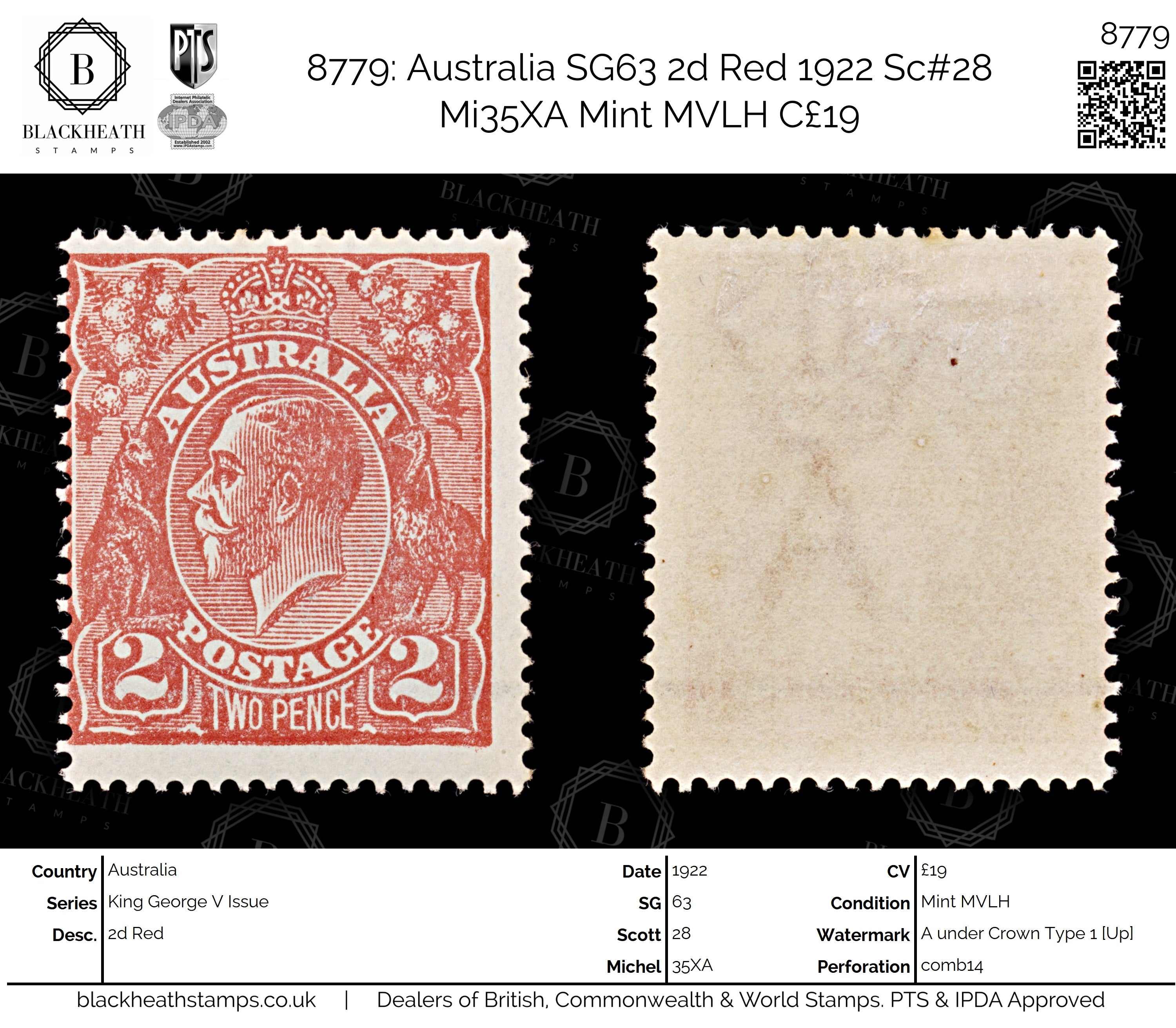 8779: Australia SG63 2d Red 1922 Sc#28 Mi35XA Mint MVLH C£19