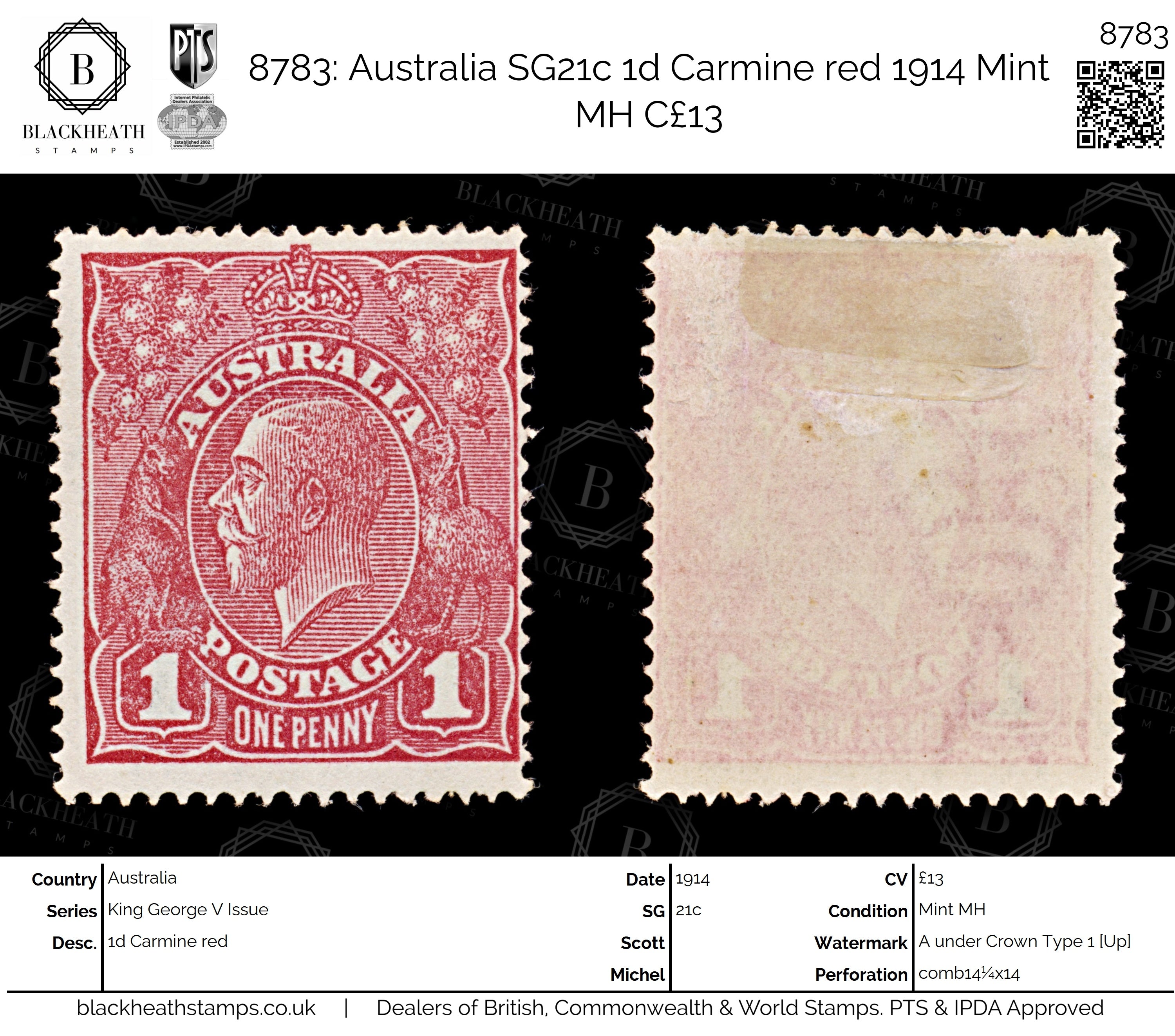 8783: Australia SG21c 1d Carmine red 1914 Mint MH C£13