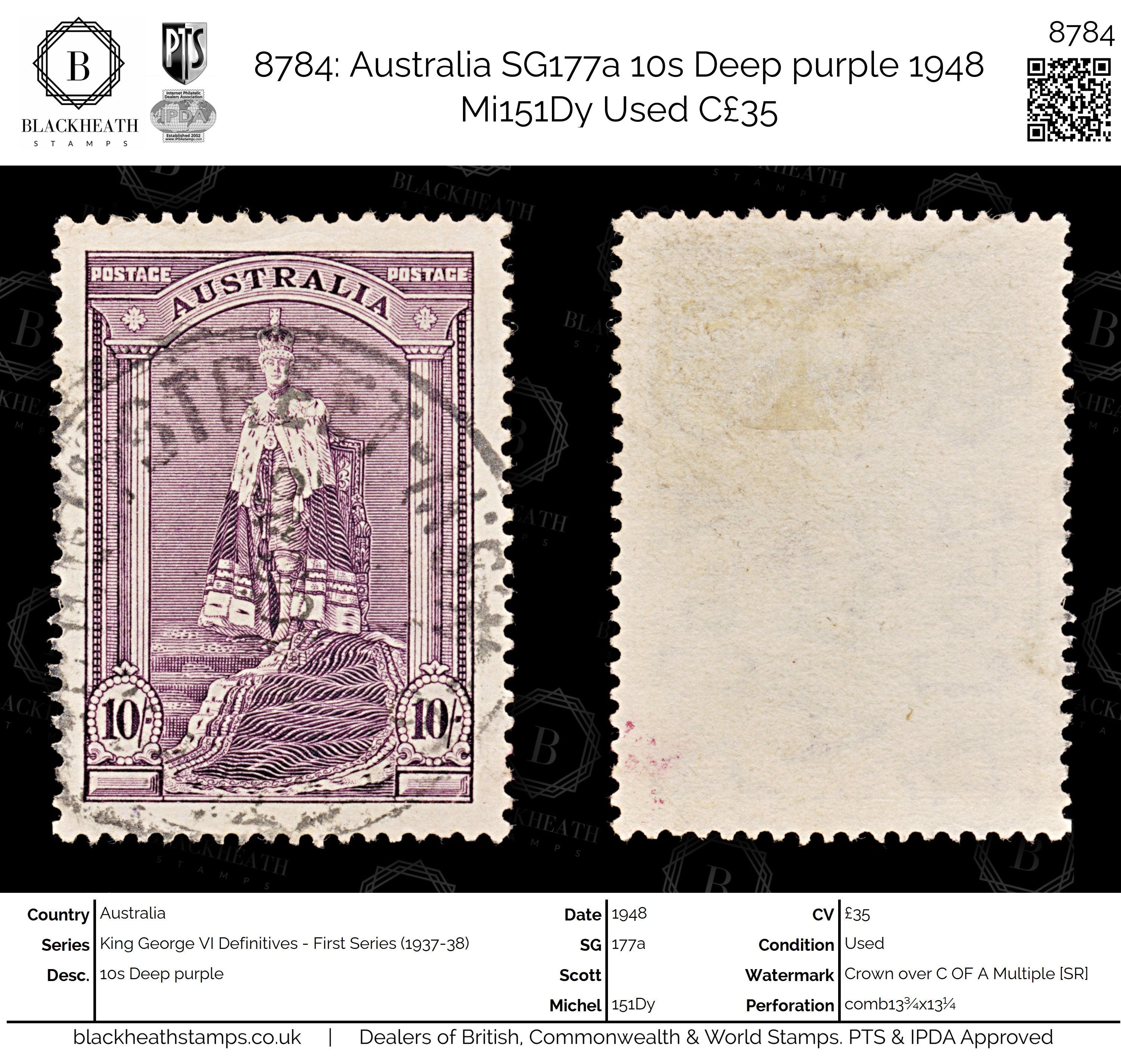 8784: Australia SG177a 10s Deep purple 1948 Mi151Dy Uséd C£35