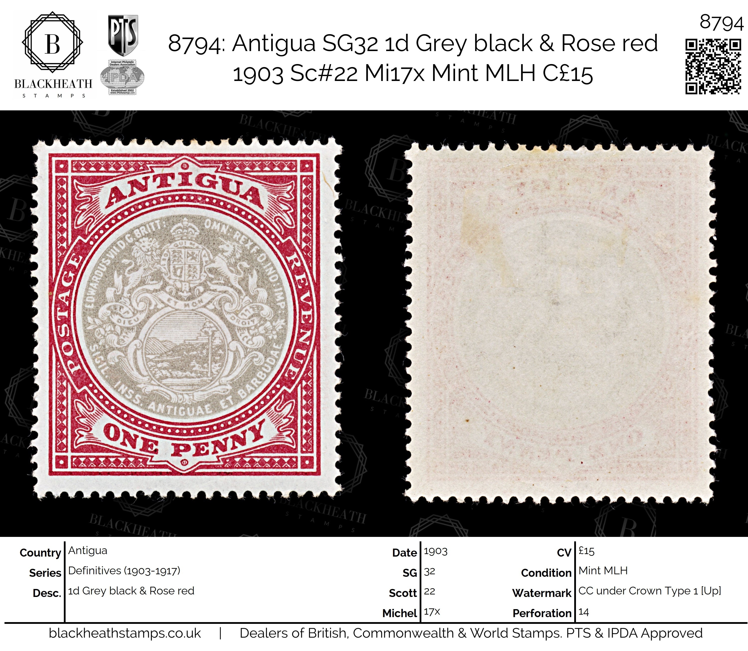 8794: Antigua SG32 1d Grey black & Rose red 1903 Sc#22 Mi17x Mint MLH C£15