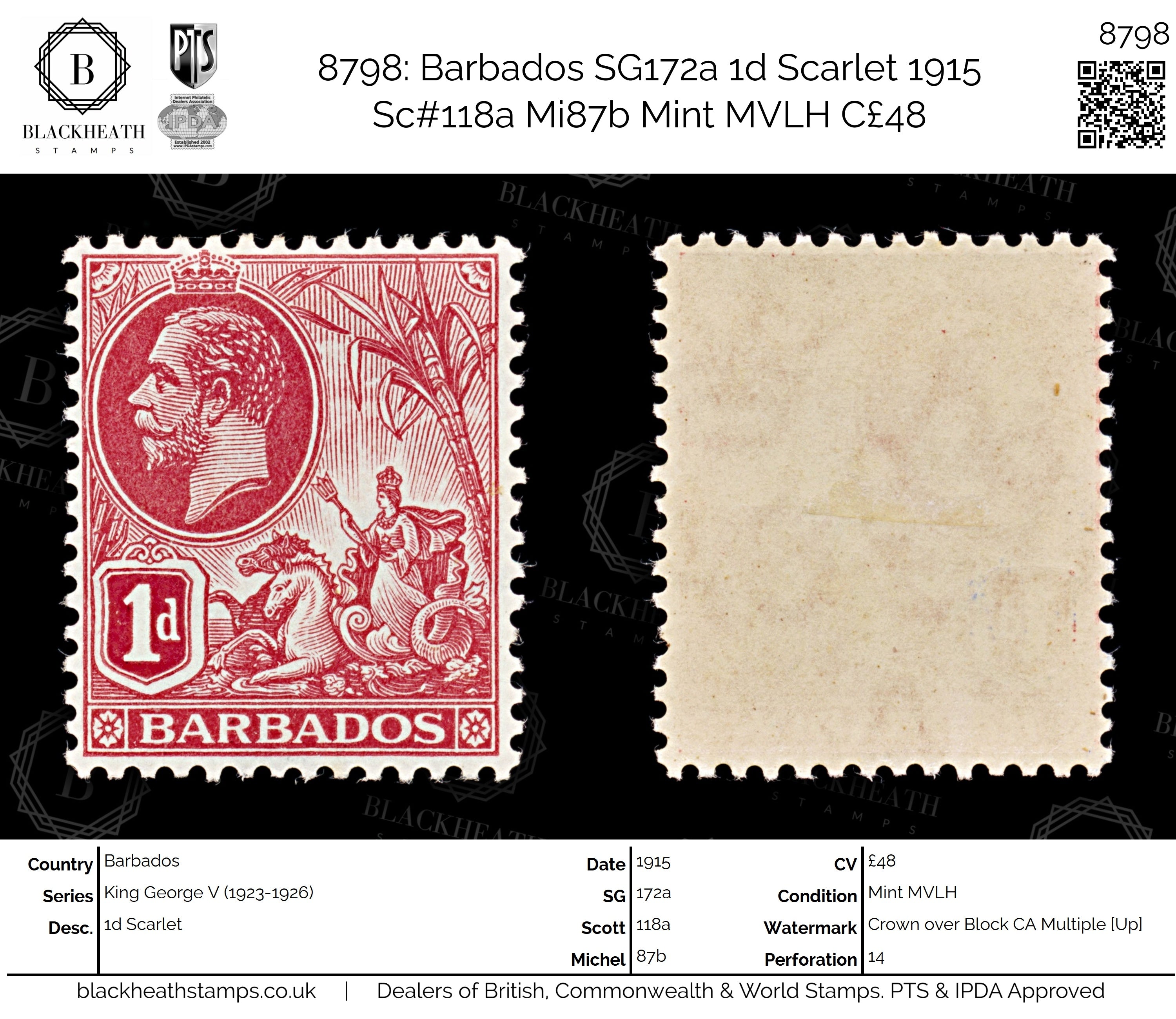 8798: Barbados SG172a 1d Scarlet 1915 Sc#118a Mi87b Mint MVLH C£48