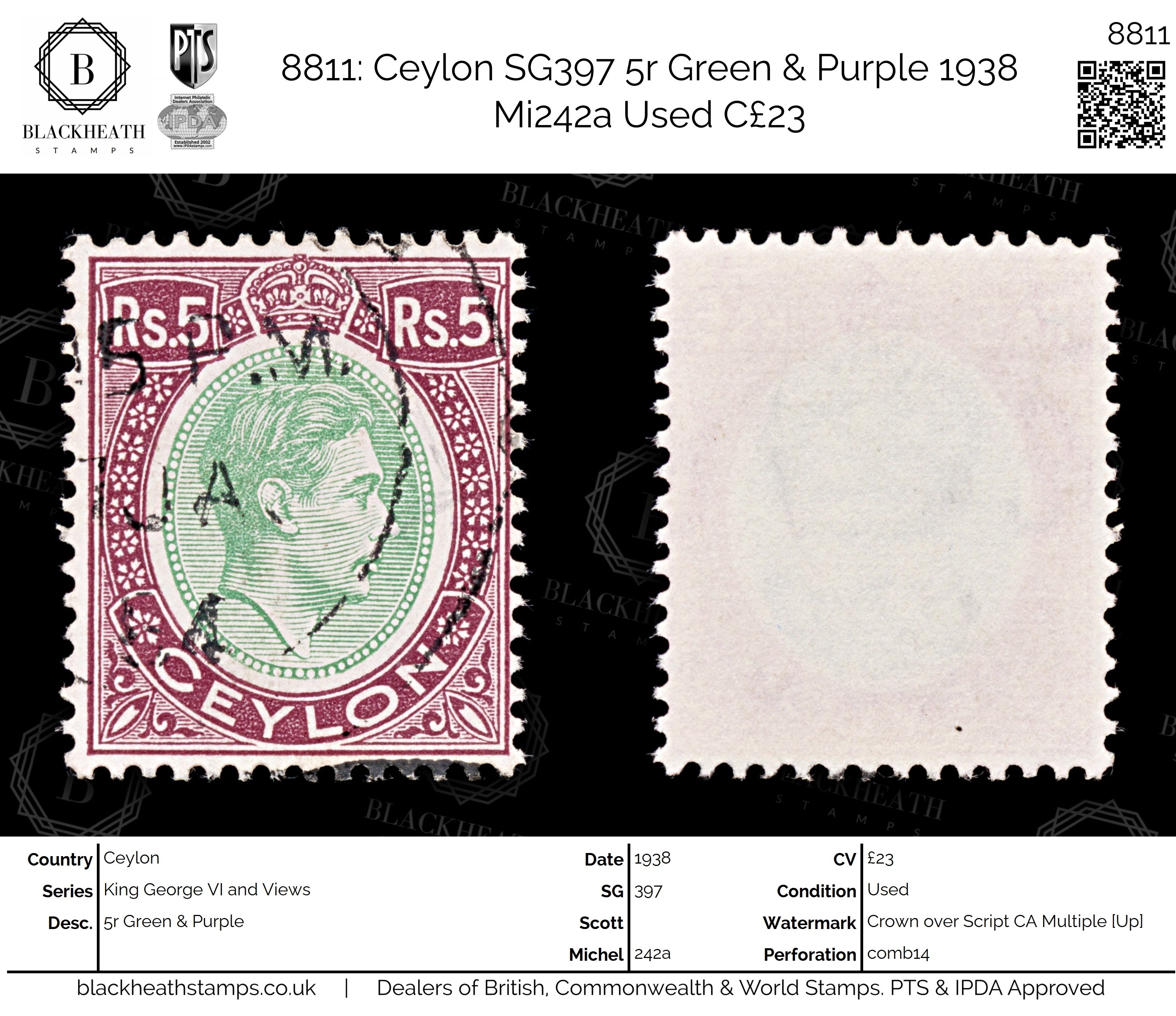 8811: Ceylon SG397 5r Green & Purple 1938 Mi242a Used C£23