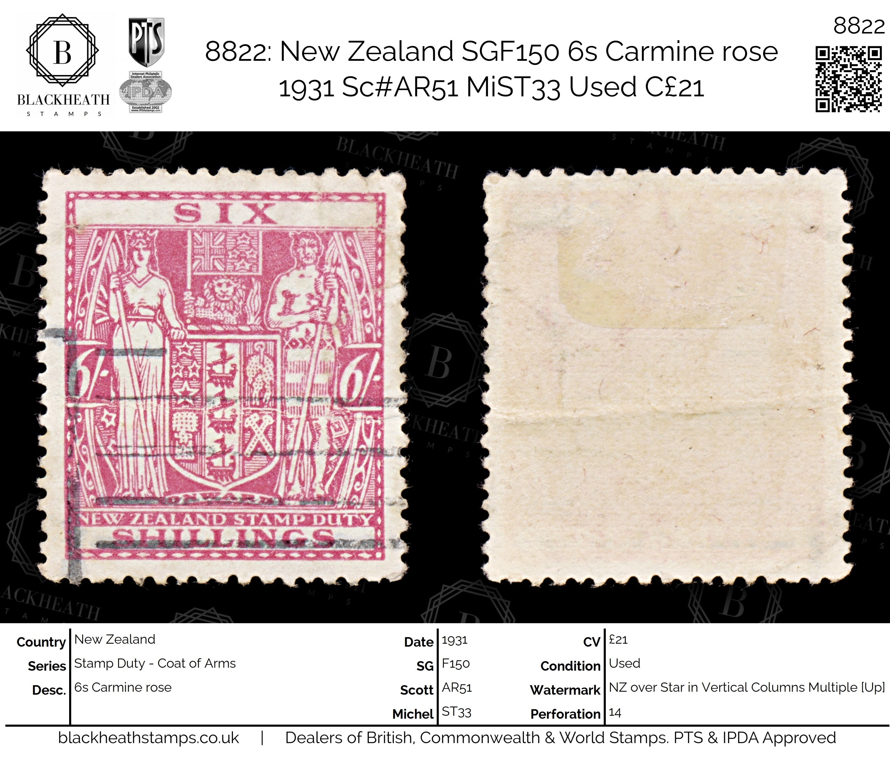8822: New Zealand SGF150 6s Carmine rose 1931 Sc#AR51 MiST33 Used C£21
