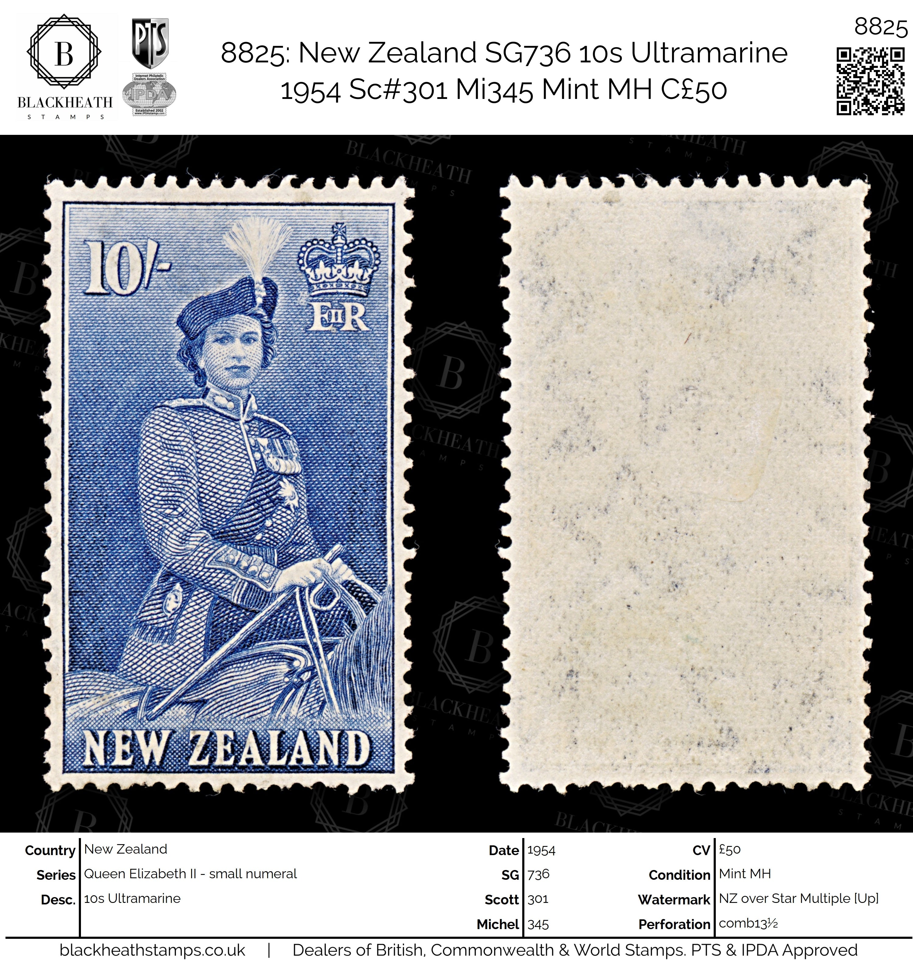8825: New Zealand SG736 10s Ultramarine 1954 Sc#301 Mi345 Mint MH C£50