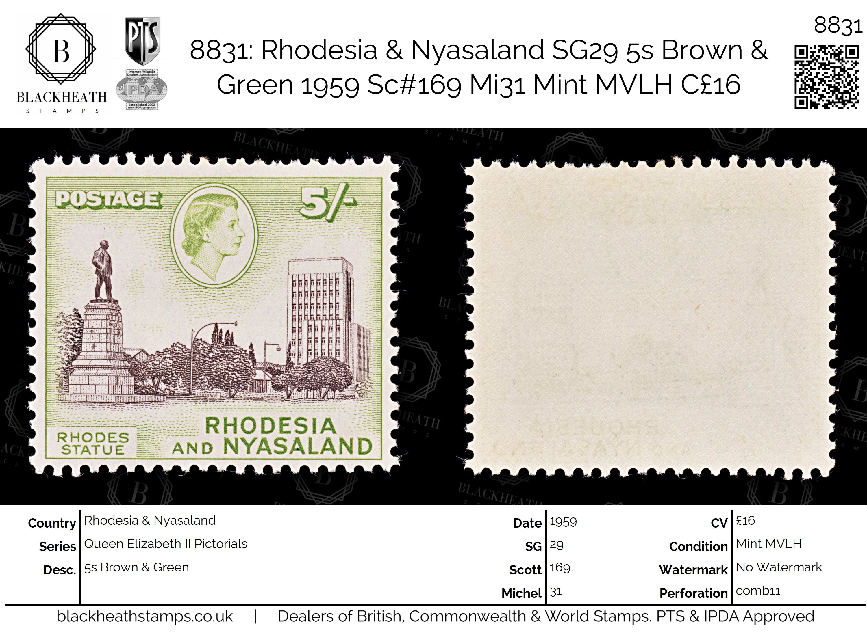 8831: Rhodesia & Nyasaland SG29 5s Brown & Green 1959 Sc#169 Mi31 Mint MVLH C£16