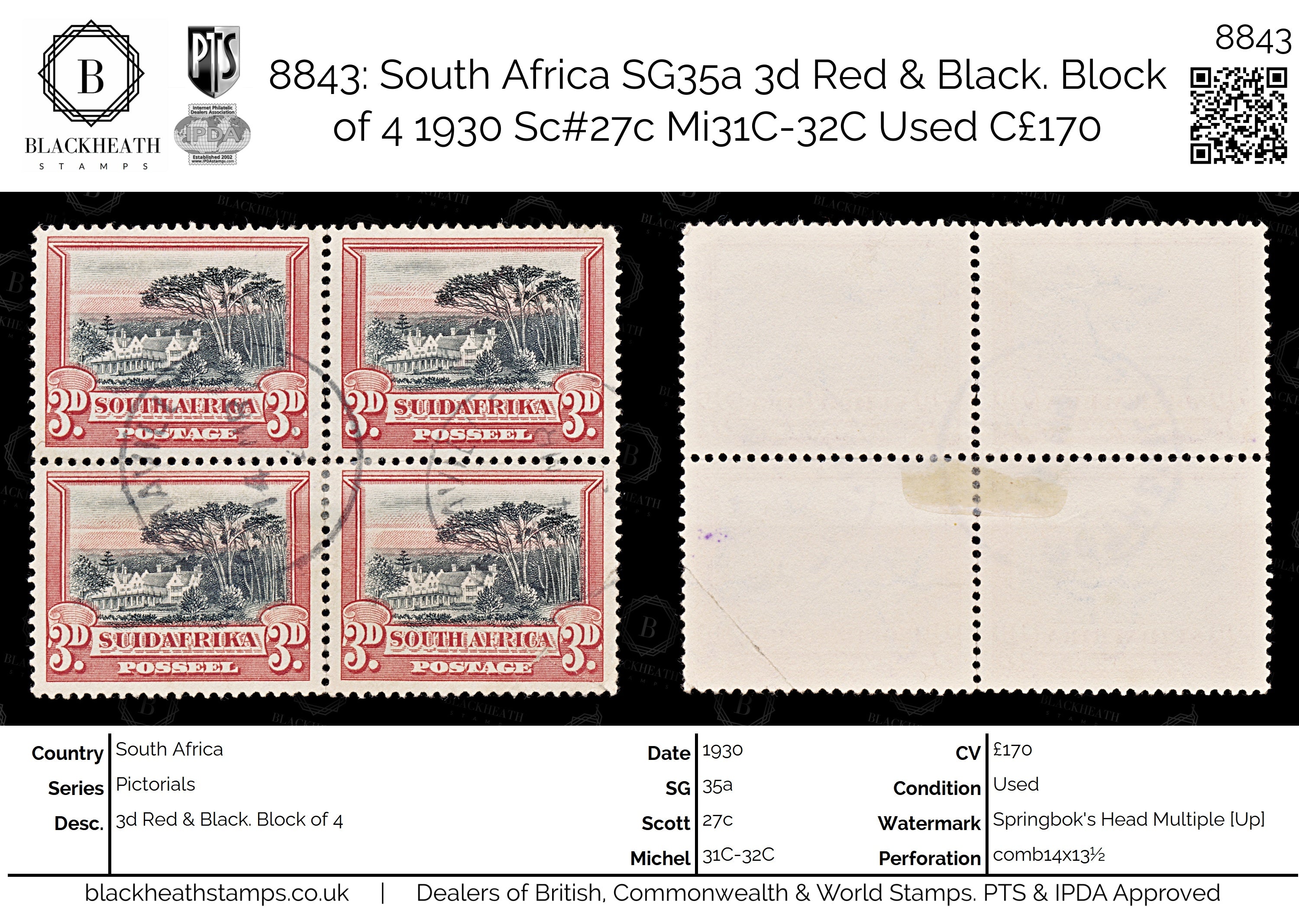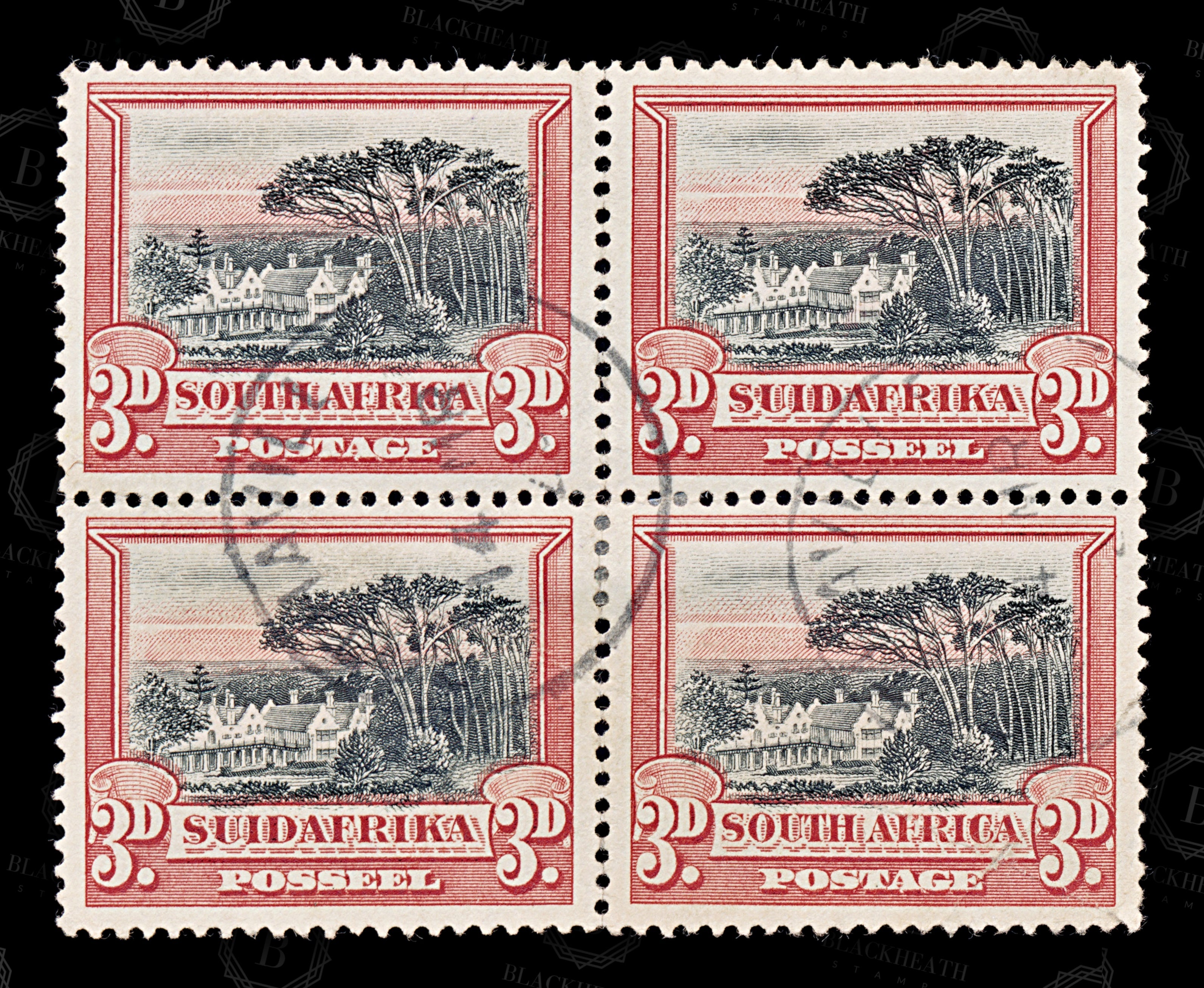 8843: South Africa SG35a 3d Red & Black. Block of 4 1930 Sc#27c Mi31C-32C Used C£170