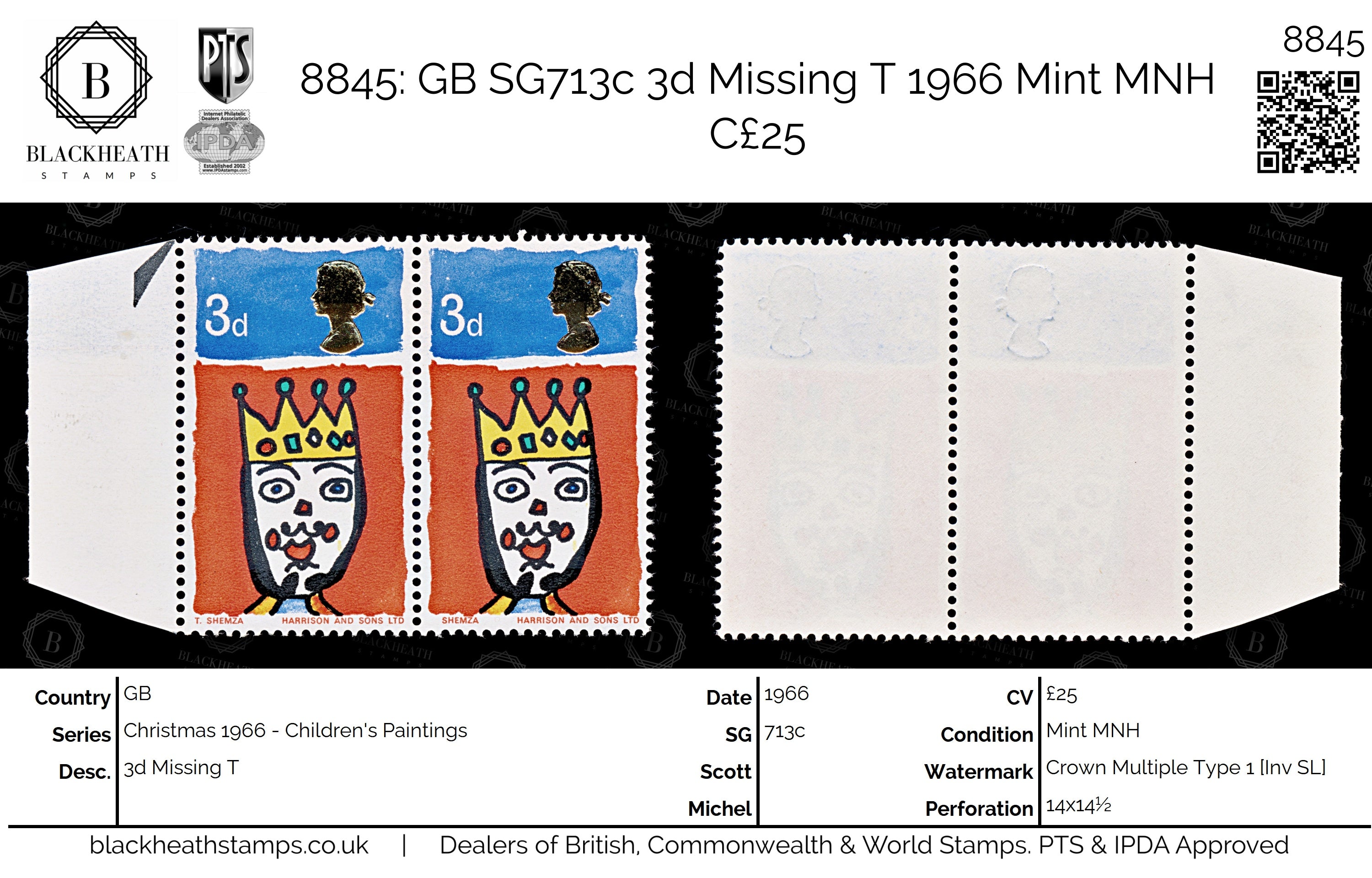 8845: GB SG713c 3d Missing T 1966 Mint MNH C£25
