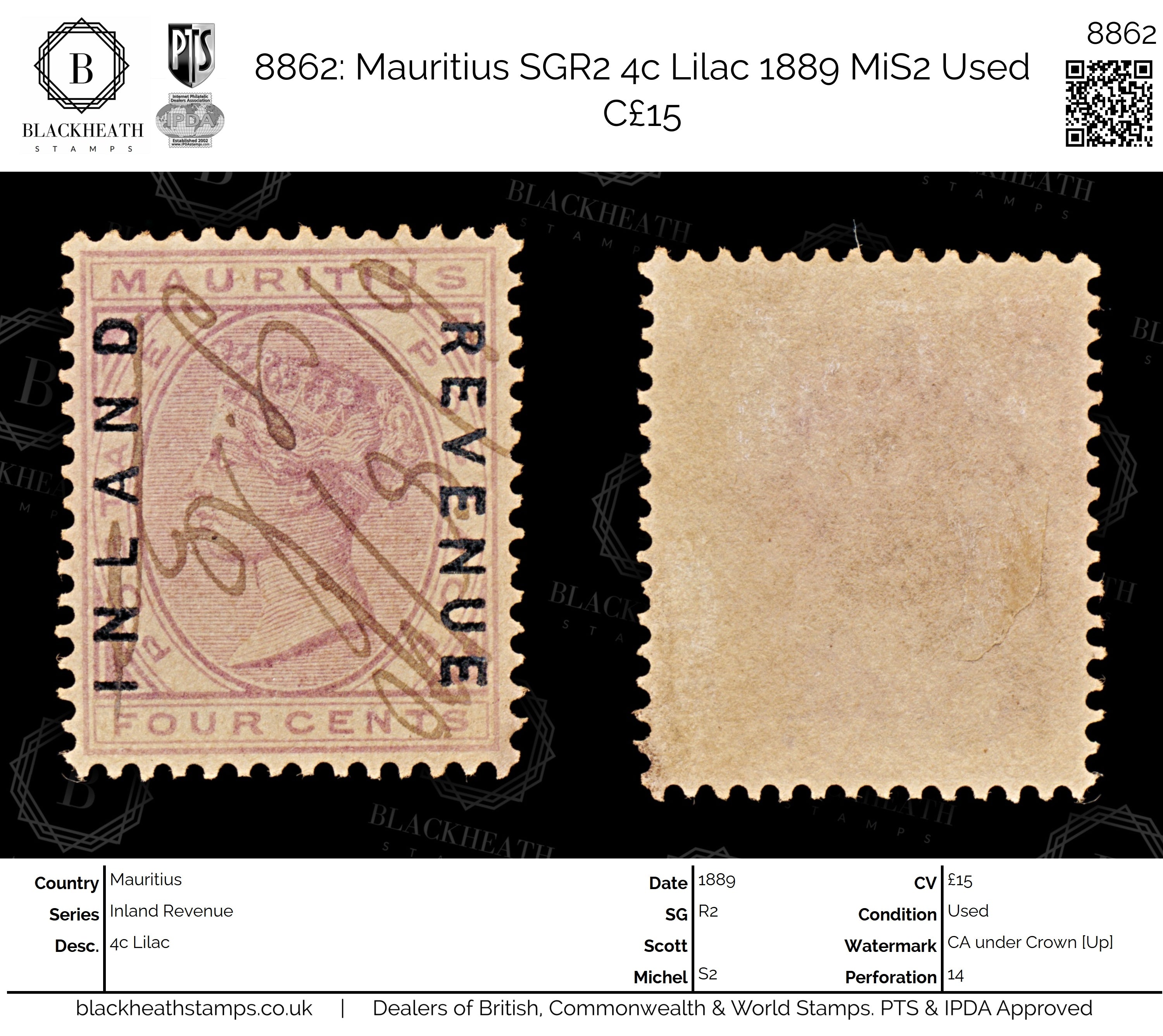 8862: Mauritius SGR2 4c Lilac 1889 MiS2 Uséd C£15