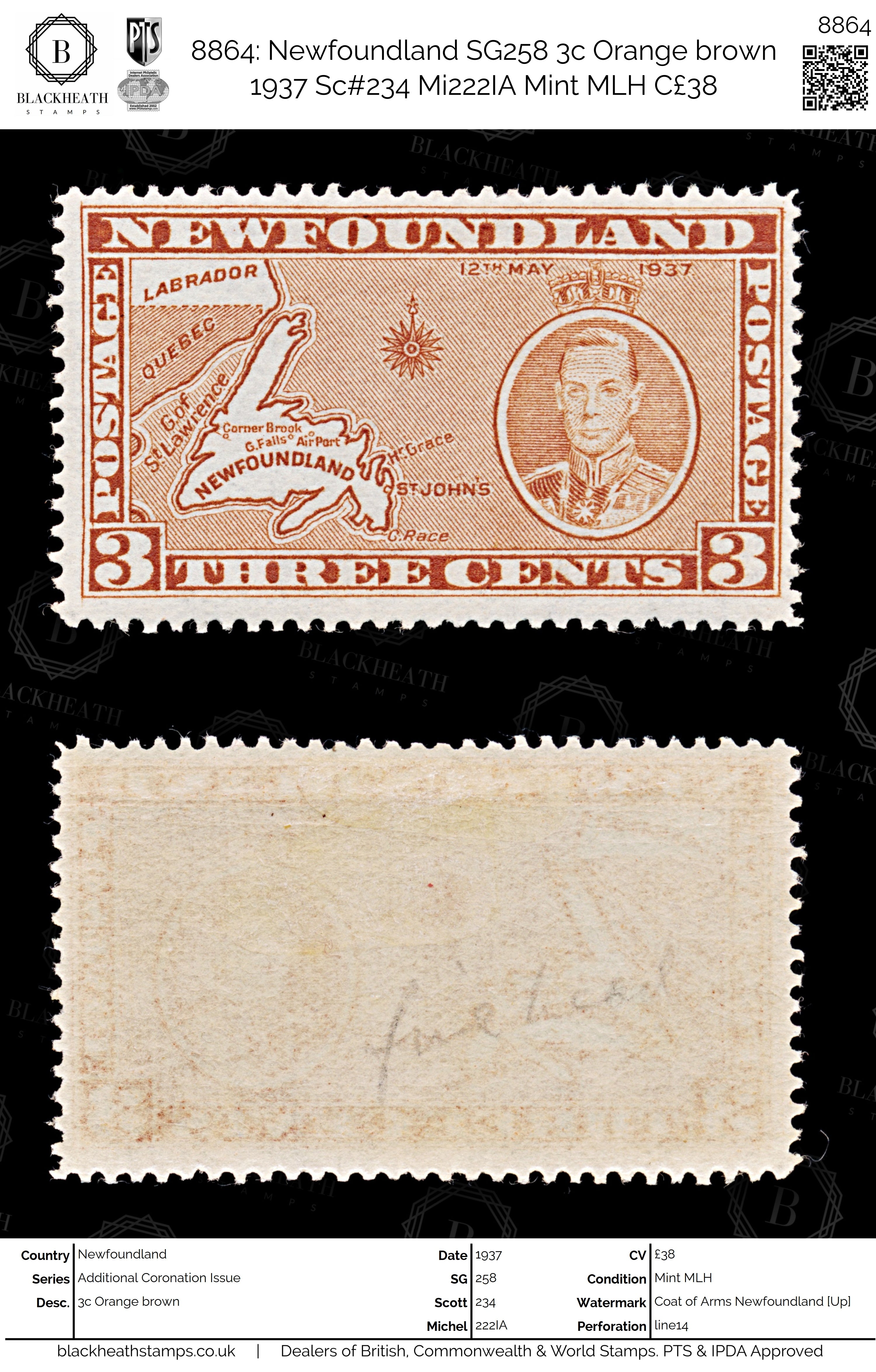 8864: Newfoundland SG258 3c Orange brown 1937 Sc#234 Mi222IA Mint MLH C£38