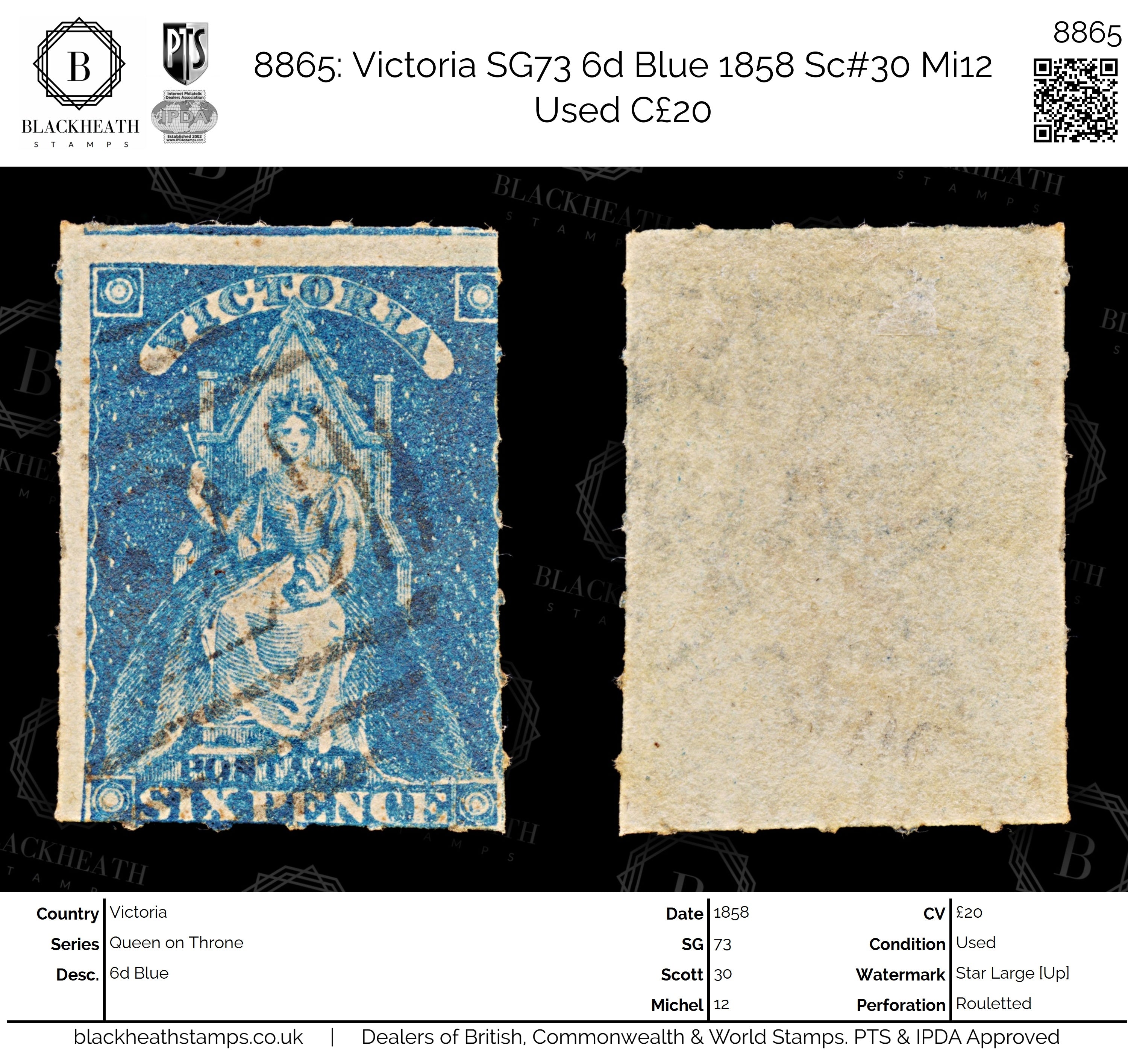 8865: Victoria SG73 6d Blue 1858 Sc#30 Mi12 Used C£20