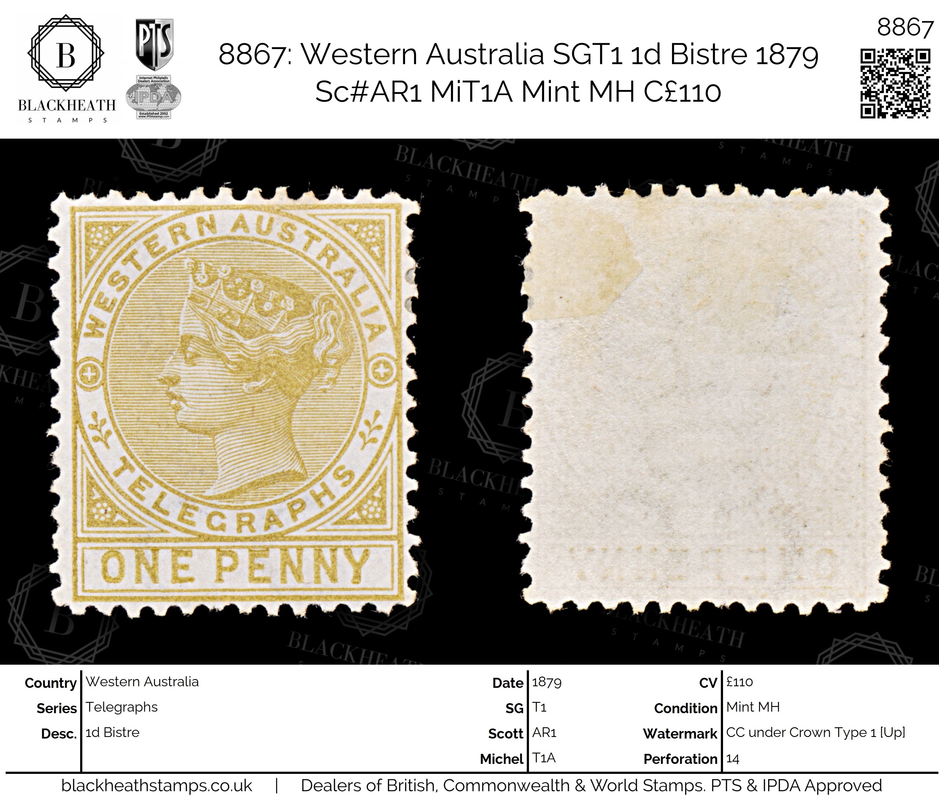8867: Western Australia SGT1 1d Bistre 1879 Sc#AR1 MiT1A Mint MH C£110
