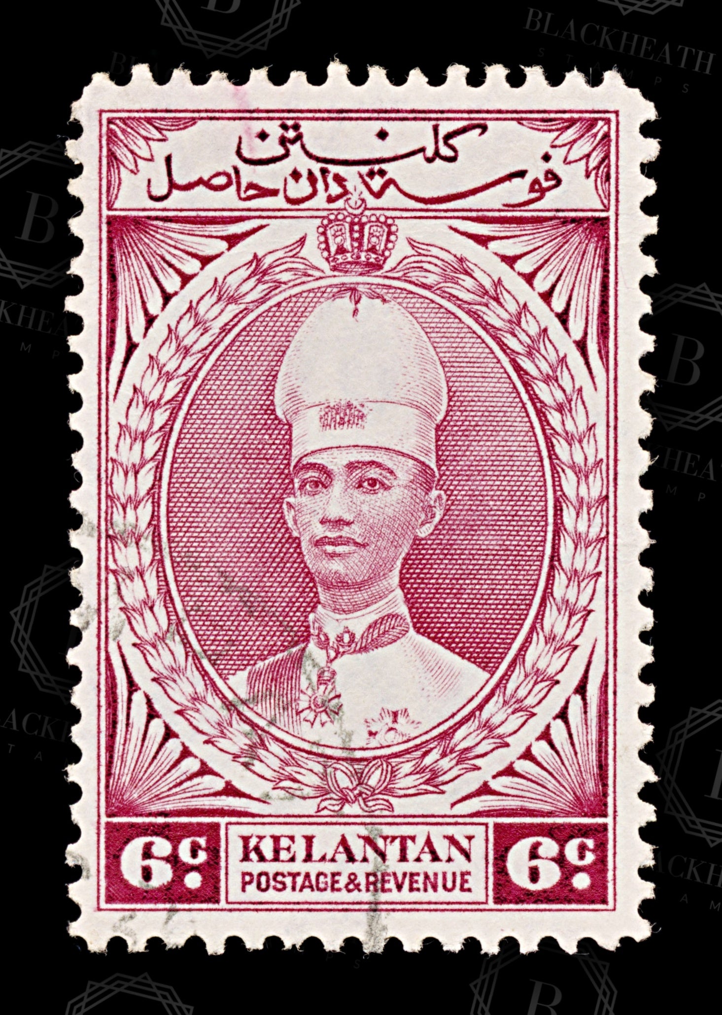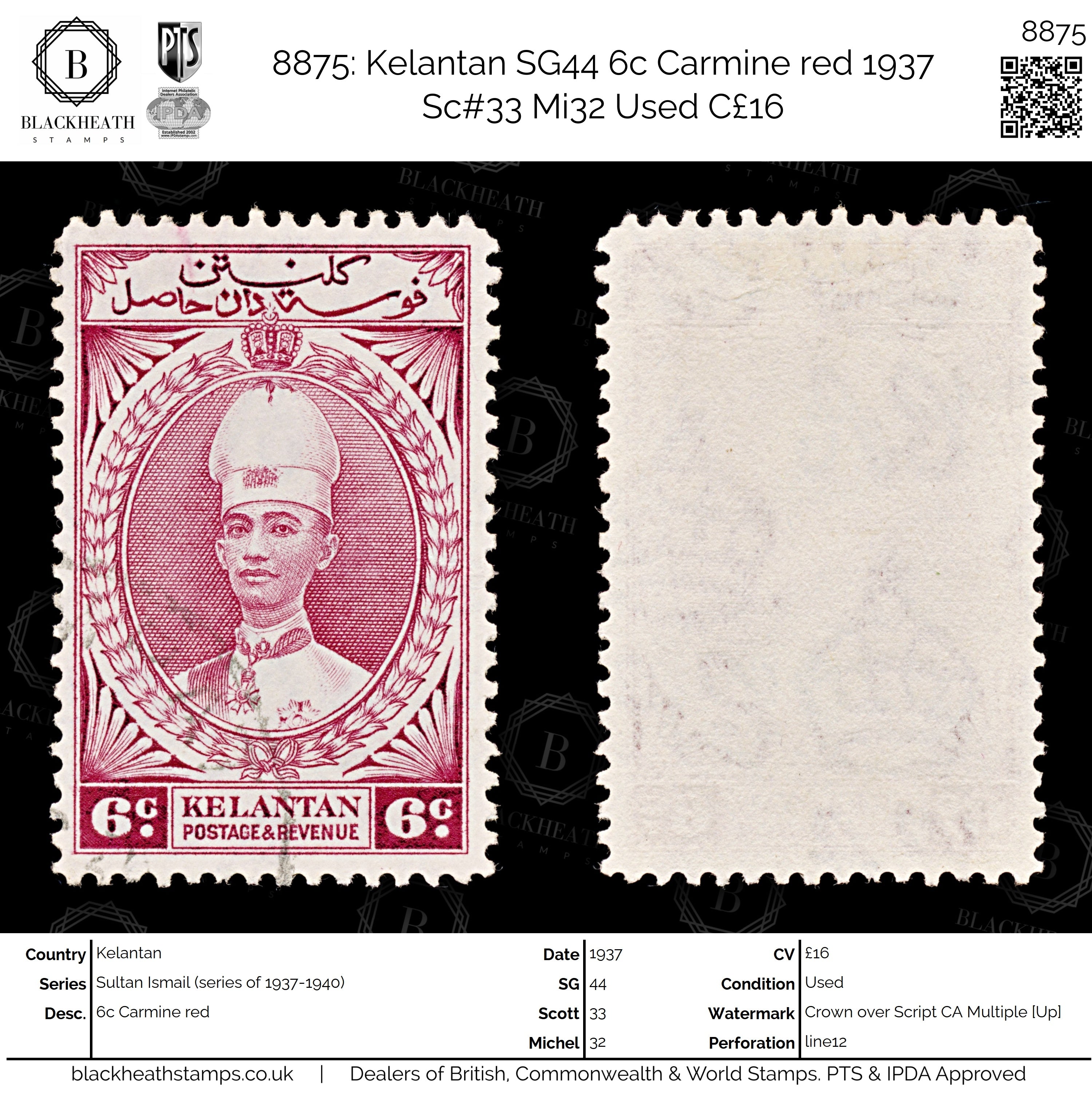 8875: Kelantan SG44 6c Carmine red 1937 Sc#33 Mi32 Used C£16