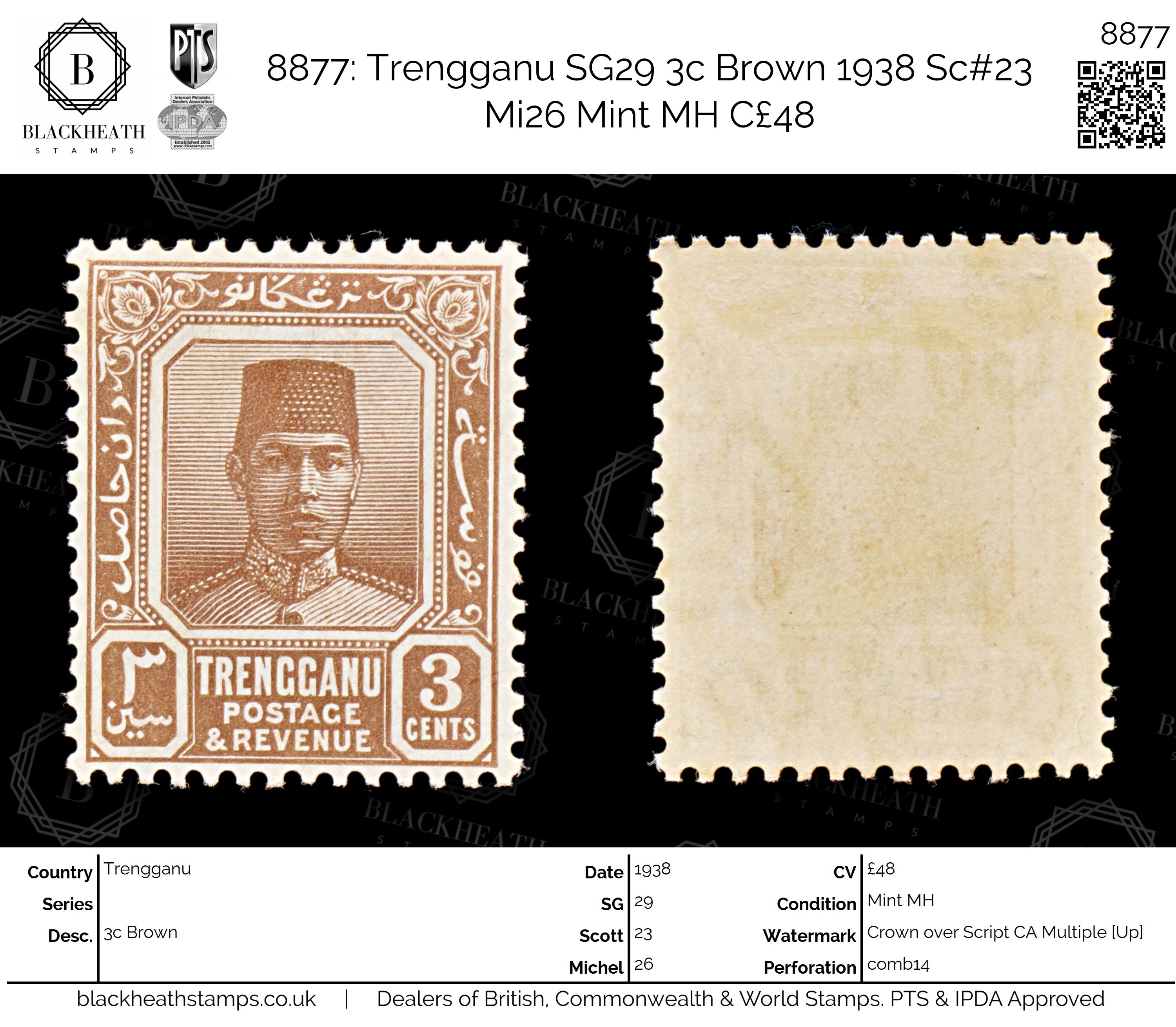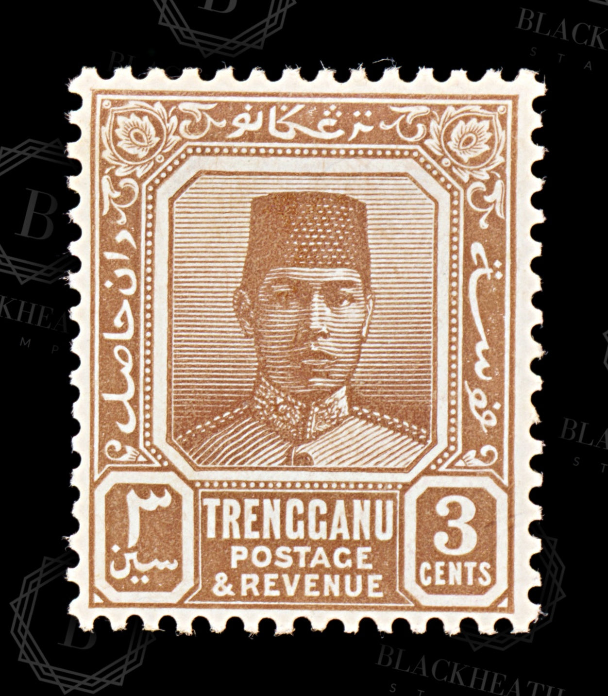 8877: Trengganu SG29 3c Brown 1938 Sc#23 Mi26 Mint MH C£48
