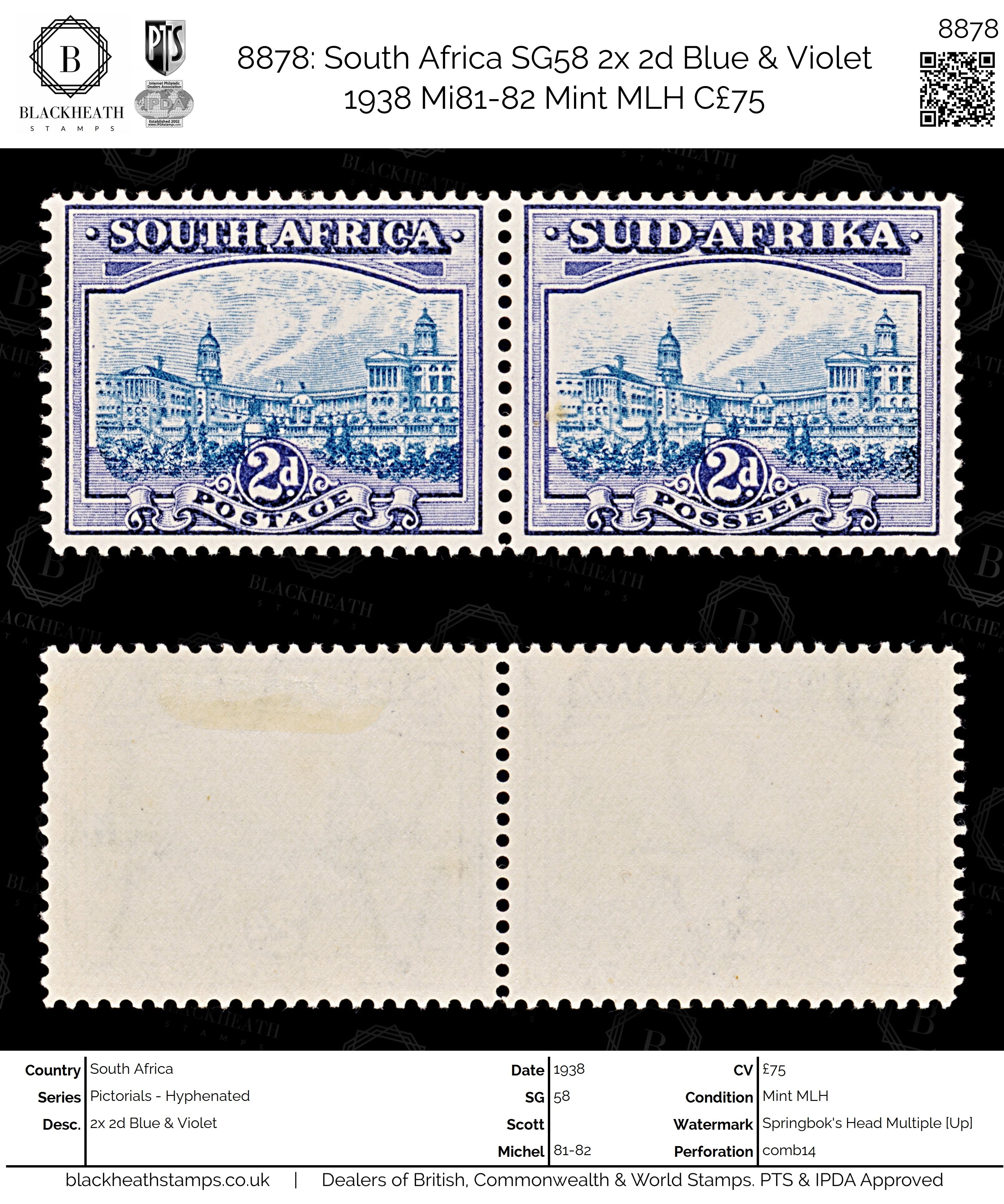 8878: South Africa SG58 2x 2d Blue & Violet 1938 Mi81-82 Mint MLH C£75