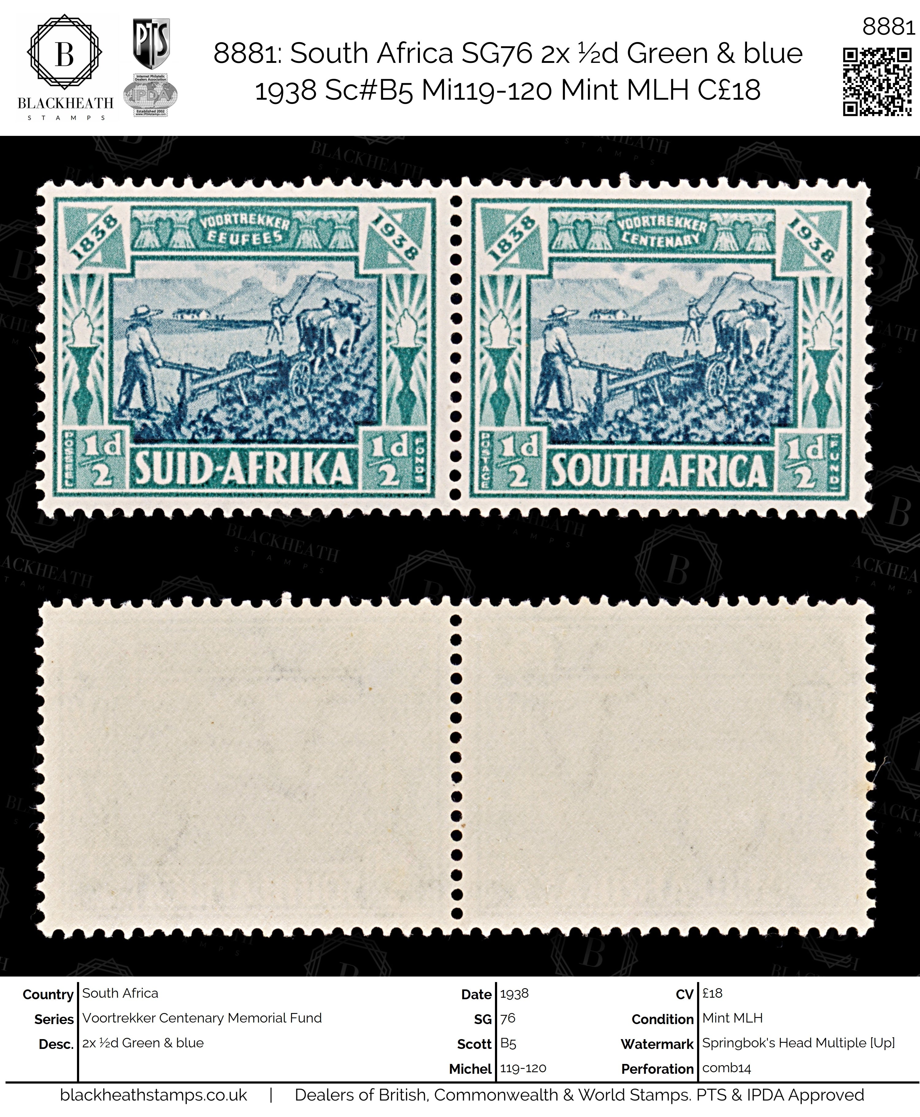 8881: South Africa SG76 2x ½d Green & blue 1938 Sc#B5 Mi119-120 Mint MLH C£18