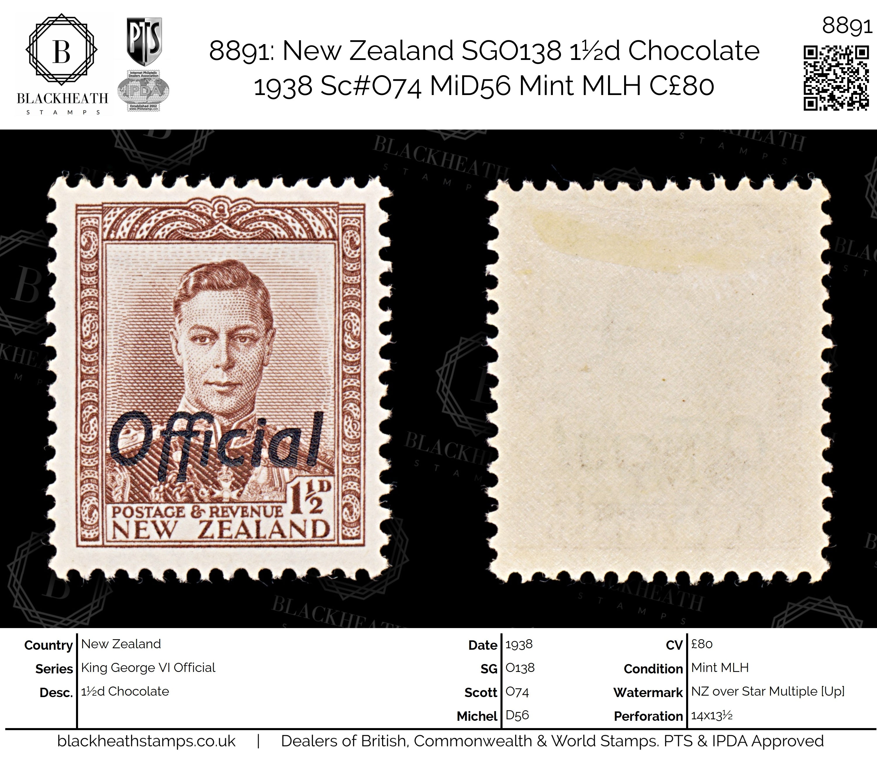 8891: New Zealand SGO138 1½d Chocolate 1938 Sc#O74 MiD56 Mint MLH C£80
