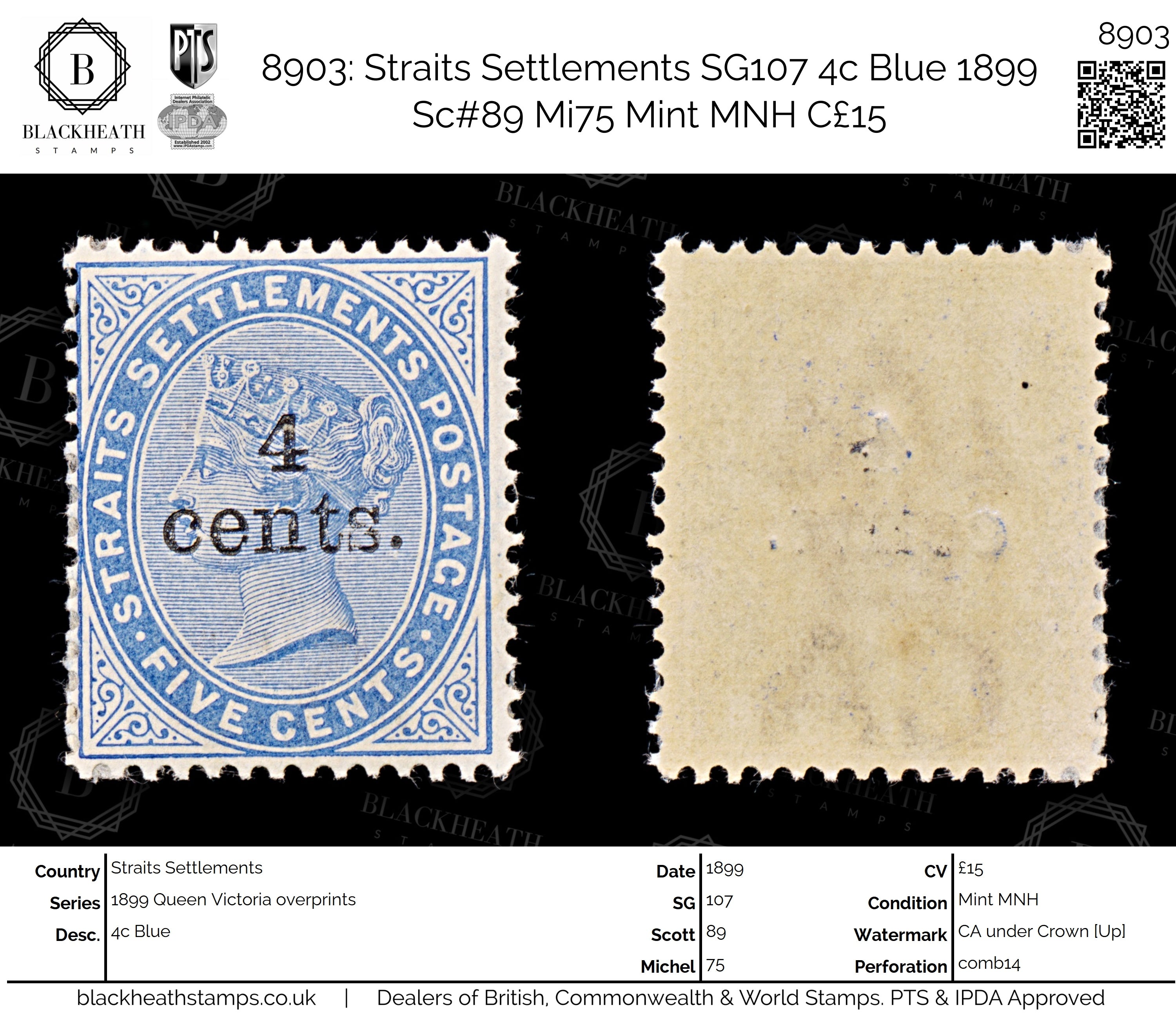 8903: Straits Settlements SG107 4c Blue 1899 Sc#89 Mi75 Mint MNH C£15