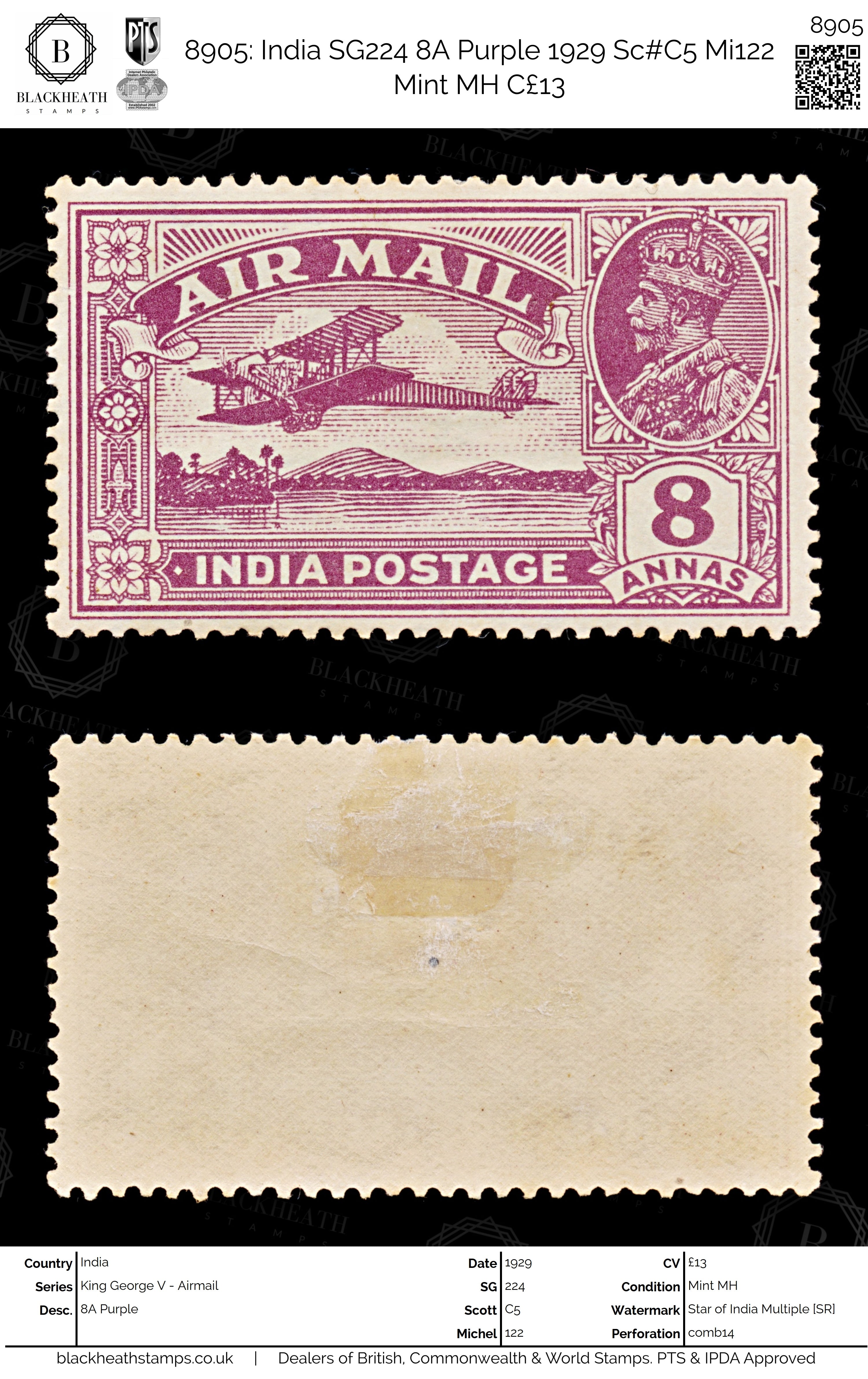 8905: India SG224 8A Purple 1929 Sc#C5 Mi122 Mint MH C£13