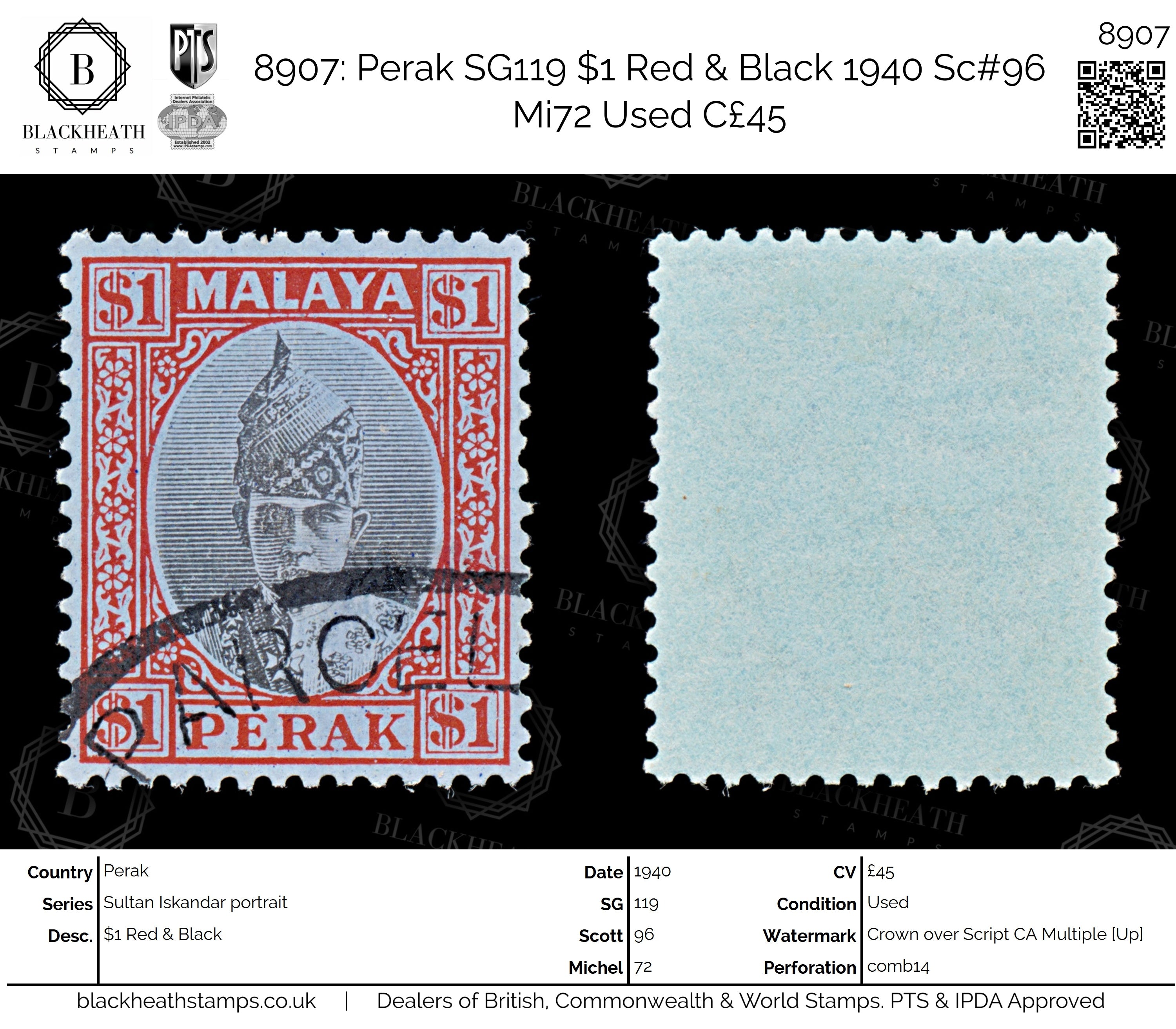 8907: Perak SG119 $1 Red & Black 1940 Sc#96 Mi72 Uséd C£45