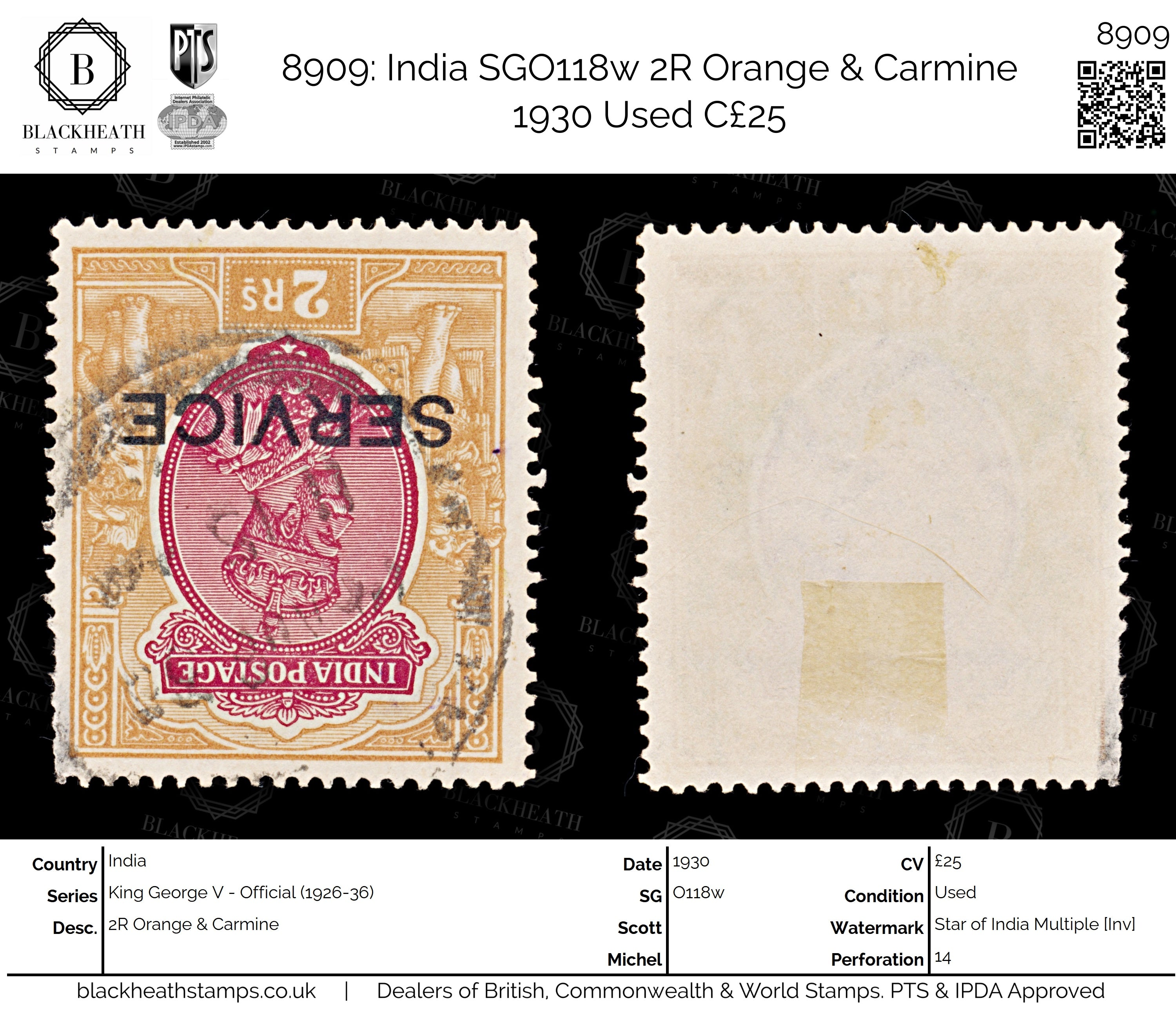 8909: India SGO118w 2R Orange & Carmine 1930 Uséd C£25