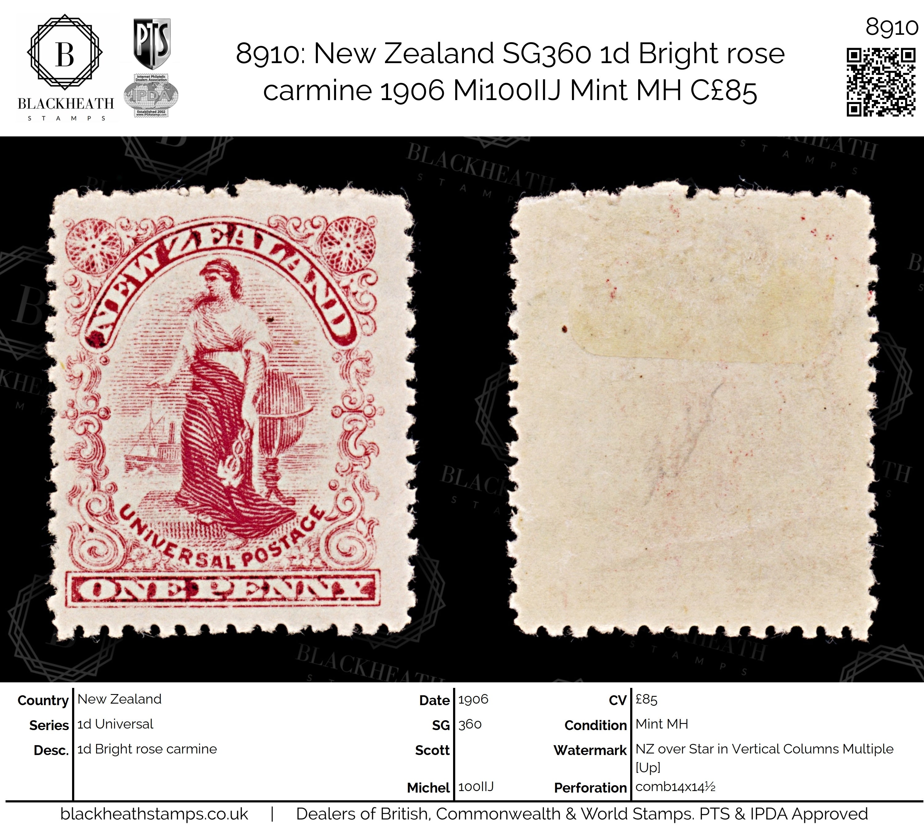 8910: New Zealand SG360 1d Bright rose carmine 1906 Mi100IIJ Mint MH C£85