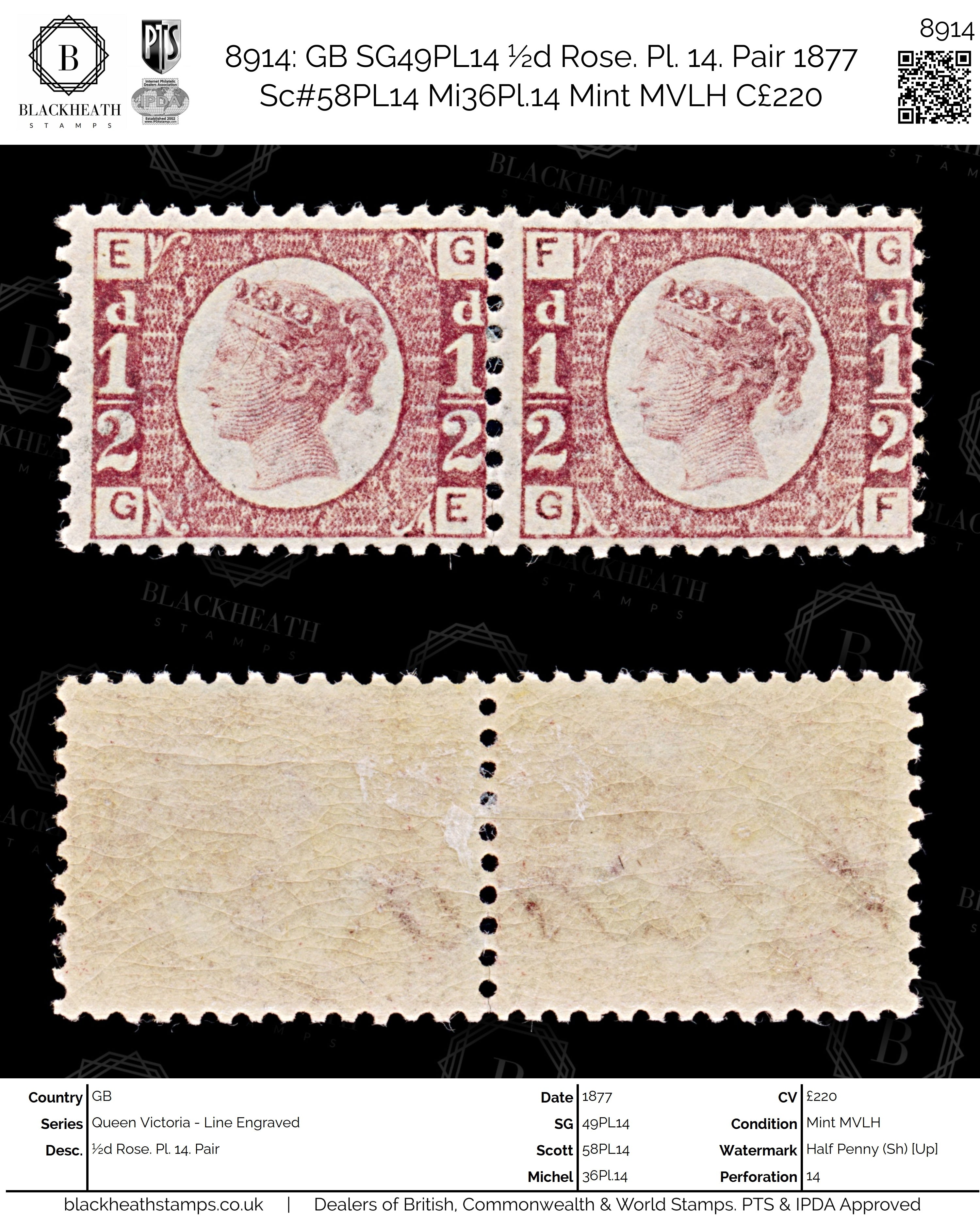 8914: GB SG49PL14 ½d Rose. Pl. 14. Pair 1877 Sc#58PL14 Mi36Pl.14 Mint MVLH C£220