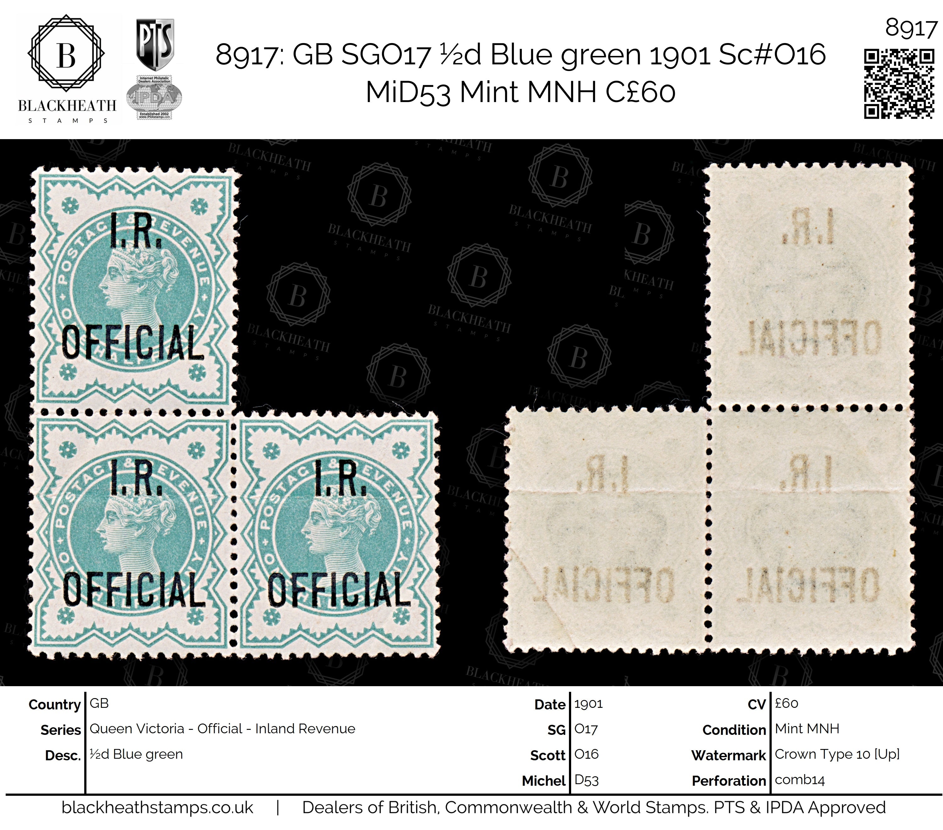 8917: GB SGO17 ½d Blue green 1901 Sc#O16 MiD53 Mint MNH C£60