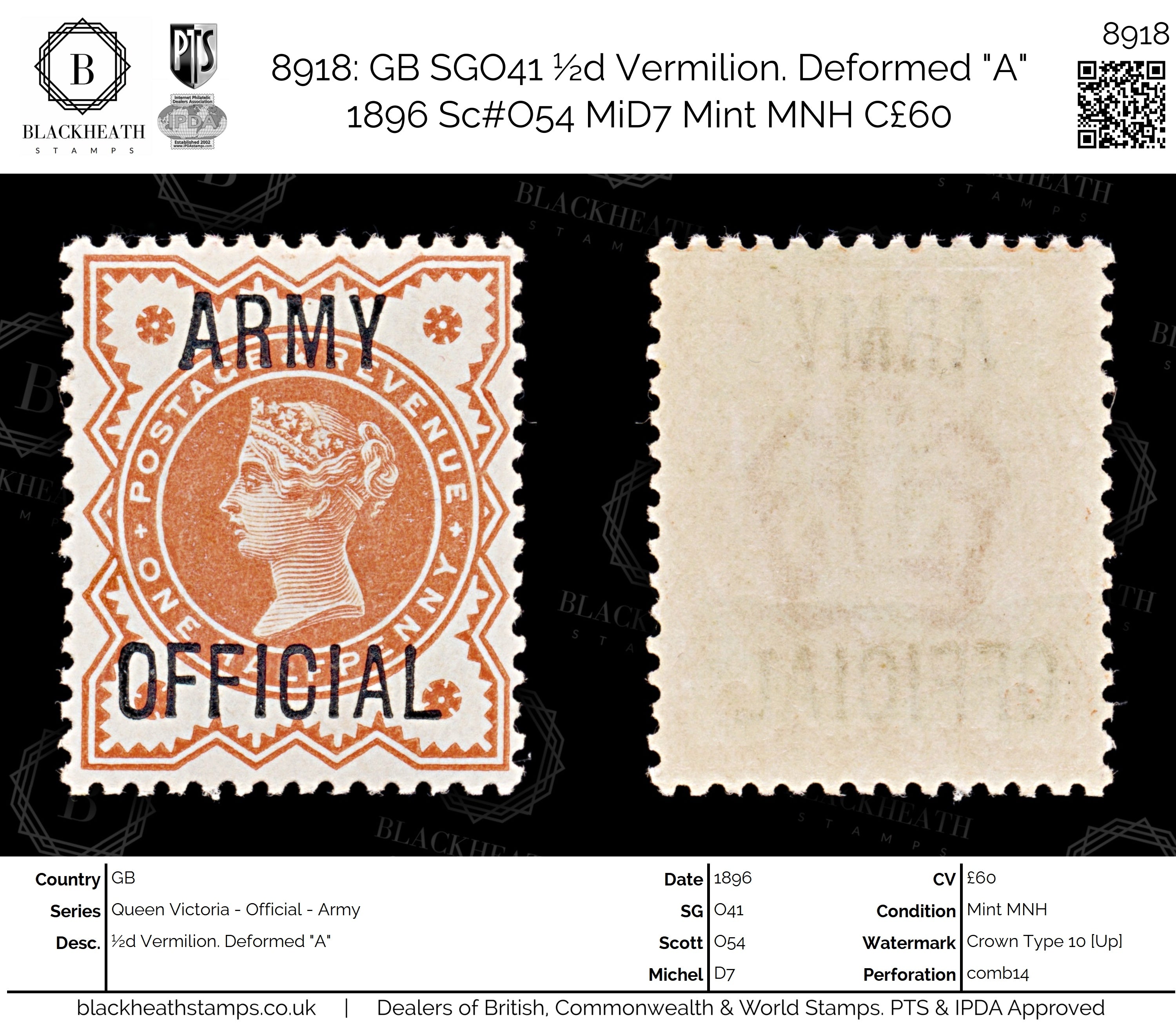 8918: GB SGO41 ½d Vermilion. Deformed "A" 1896 Sc#O54 MiD7 Mint MNH C£60