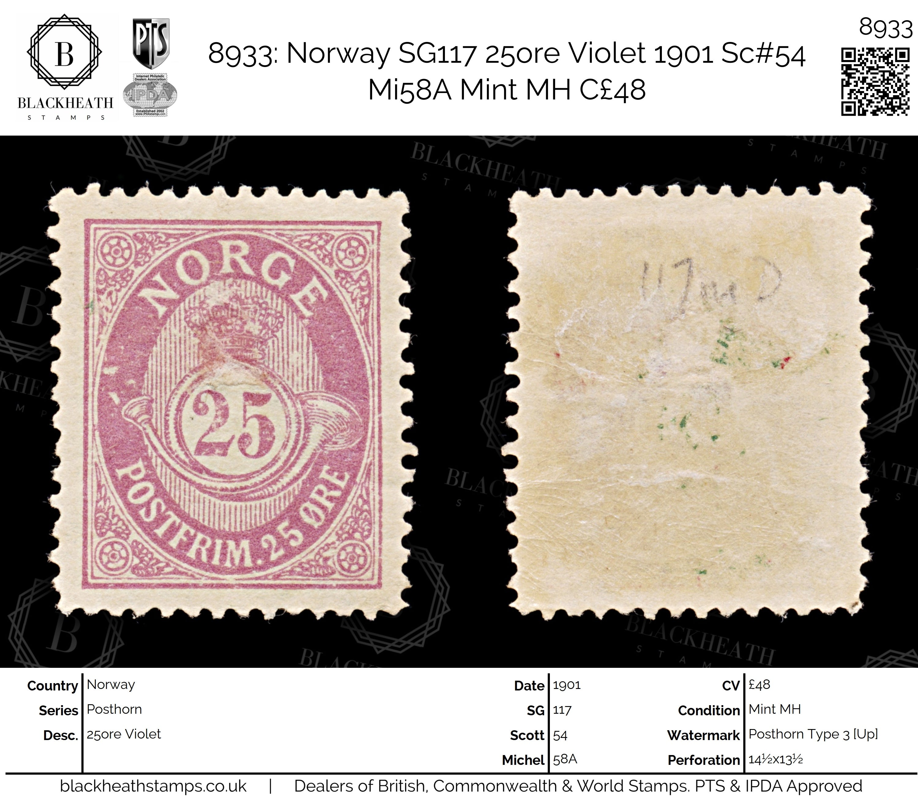 8933: Norway SG117 25ore Violet 1901 Sc#54 Mi58A Mint MH C£48
