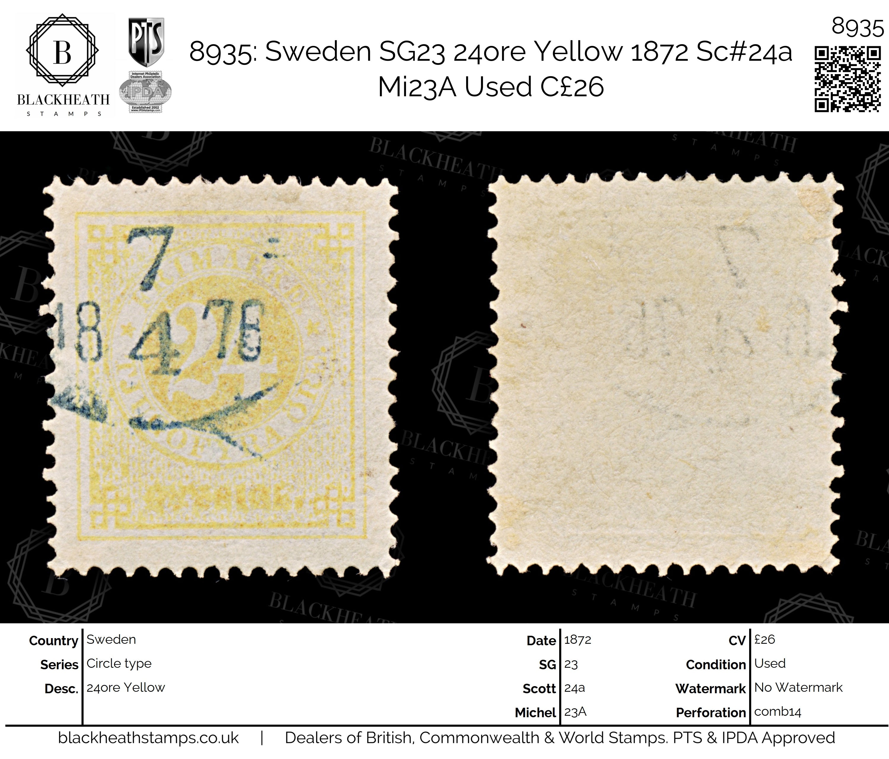 8935: Sweden SG23 24ore Yellow 1872 Sc#24a Mi23A Uséd C£26