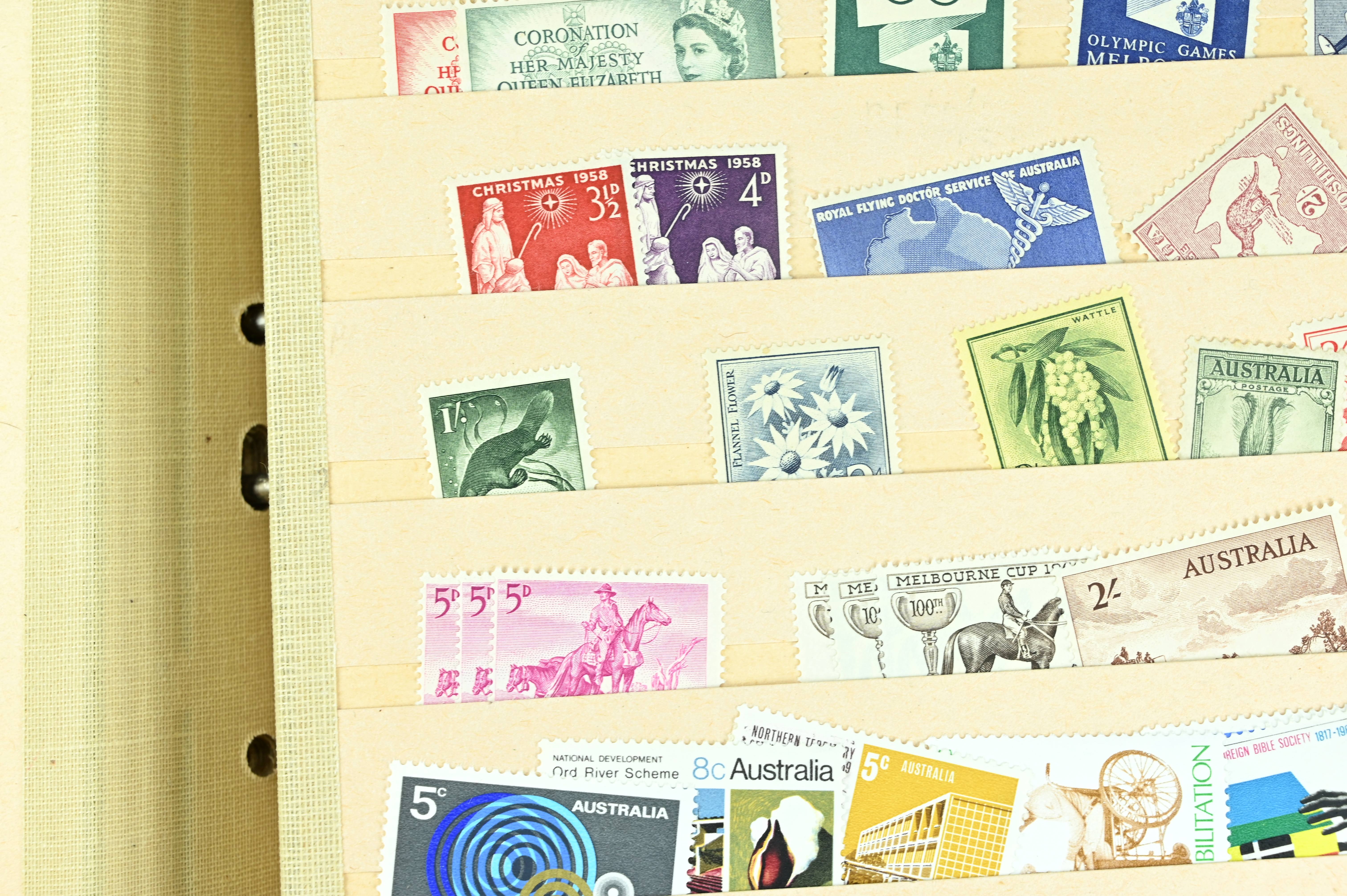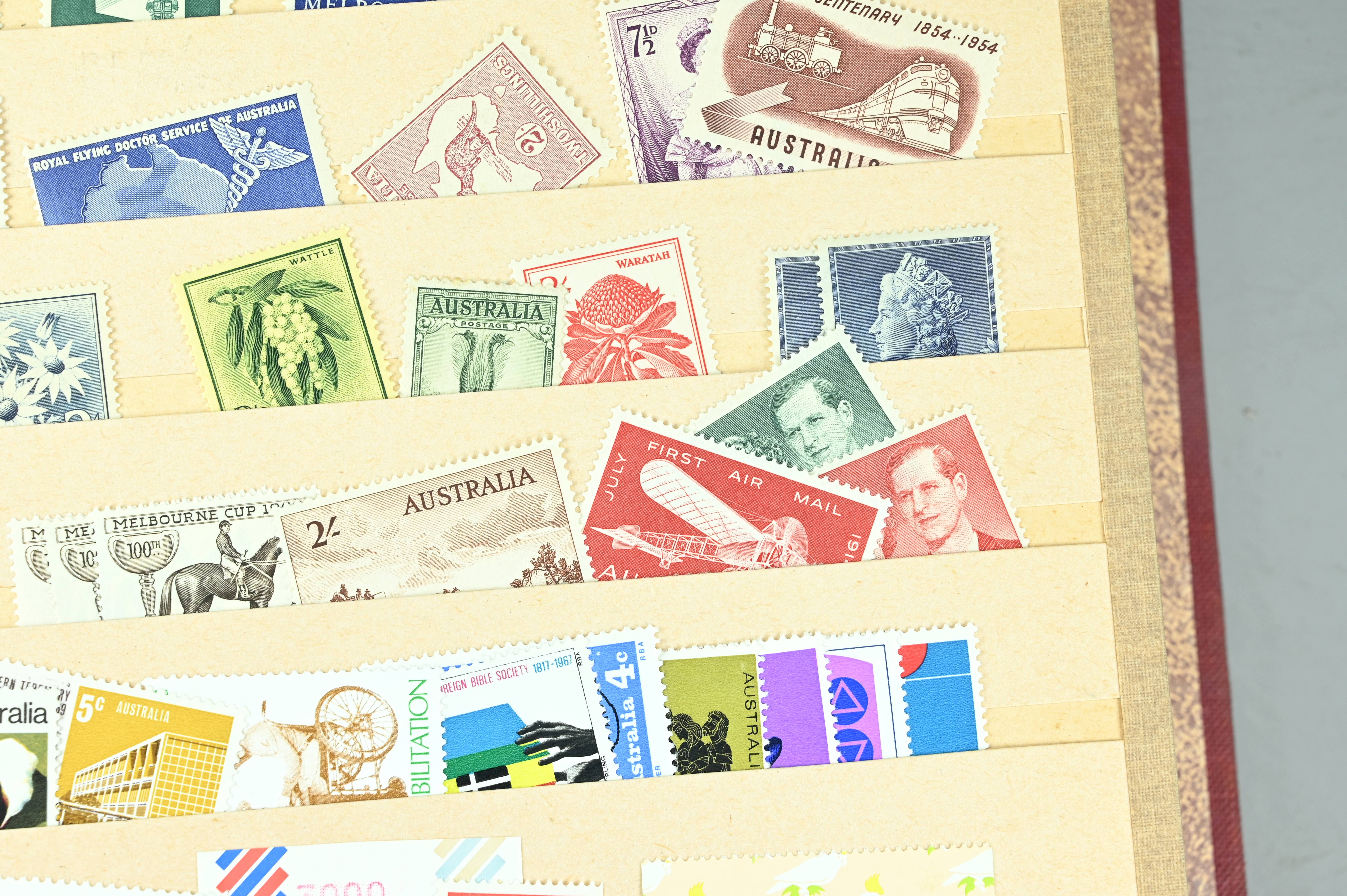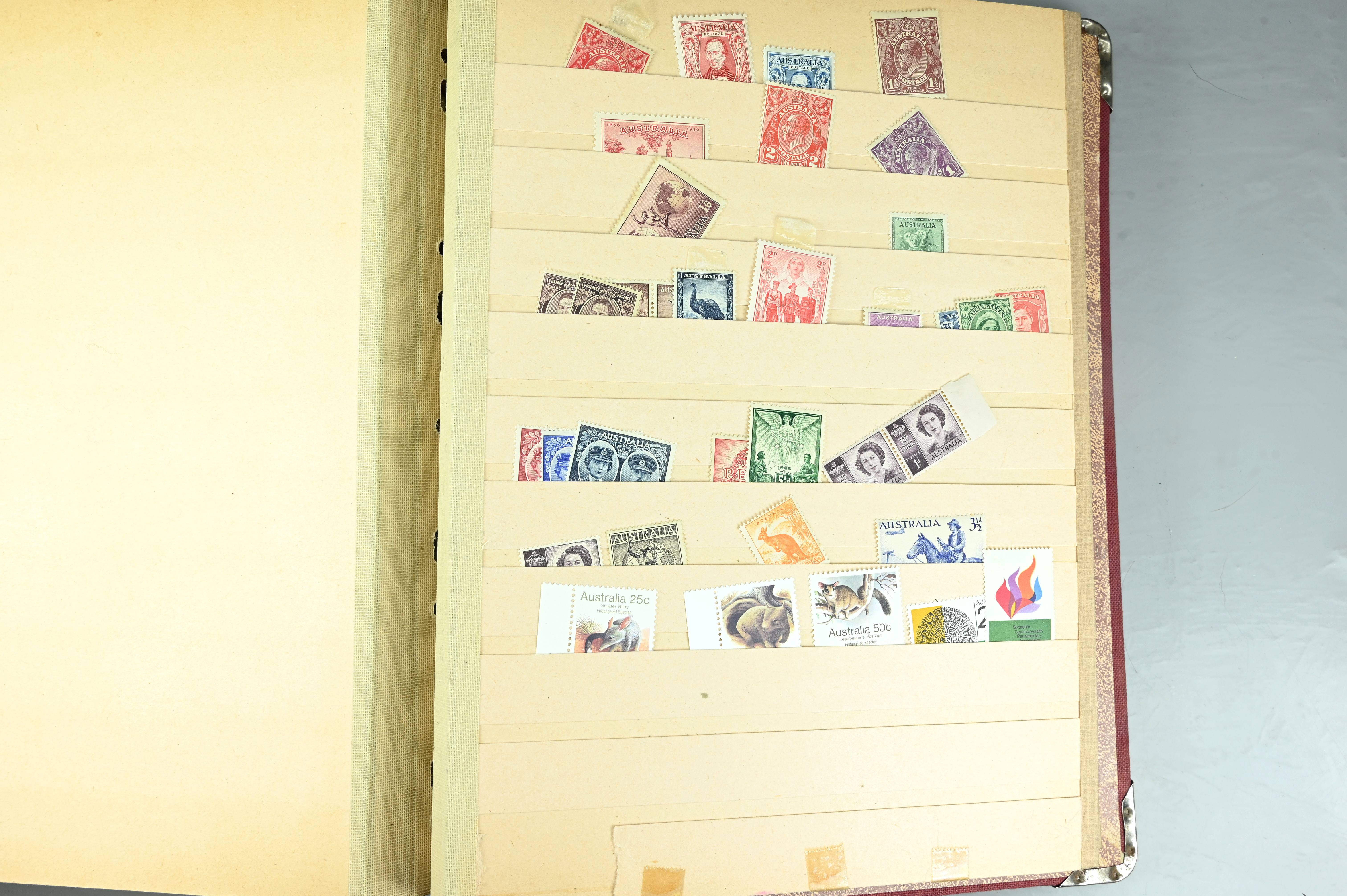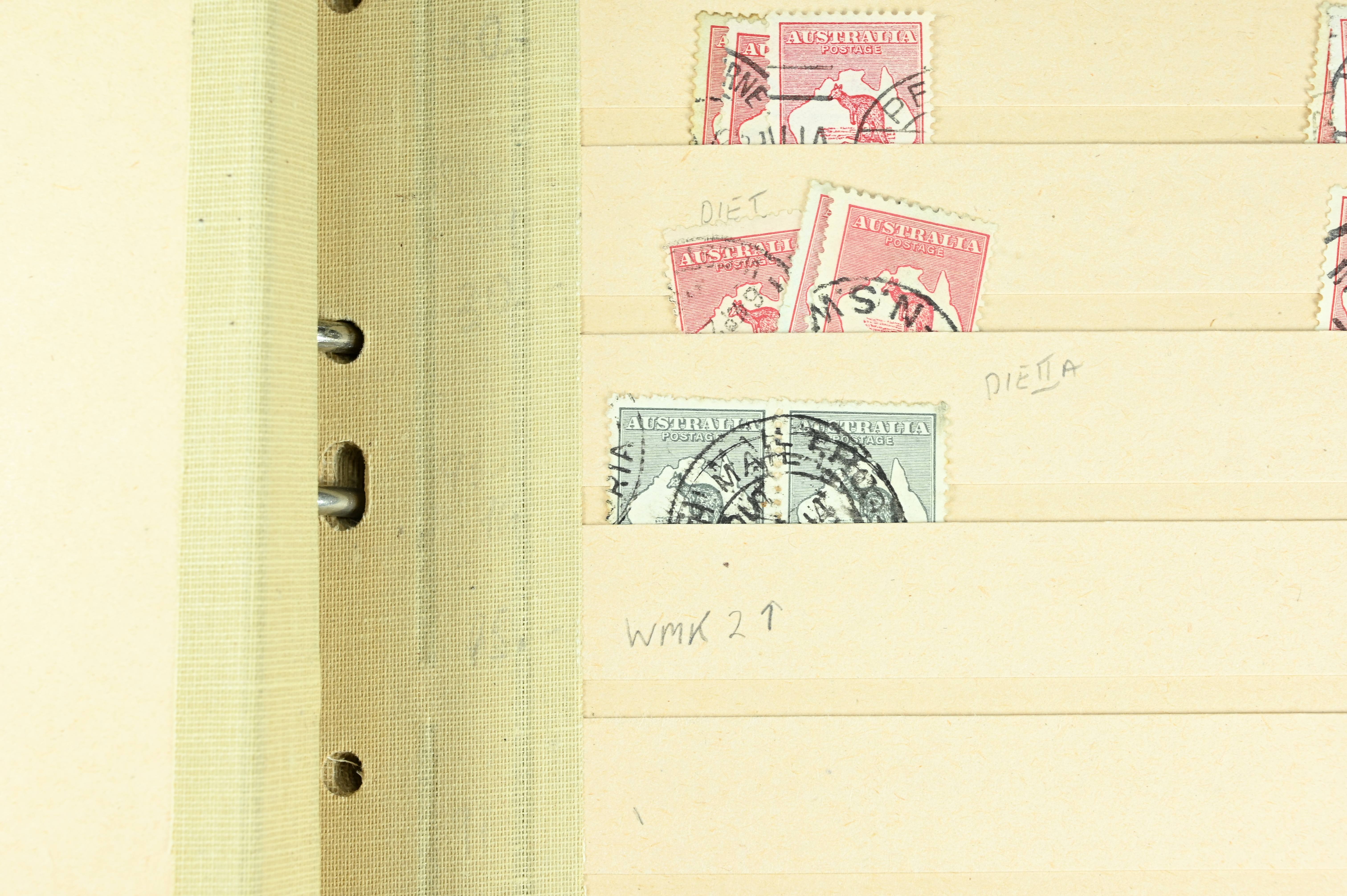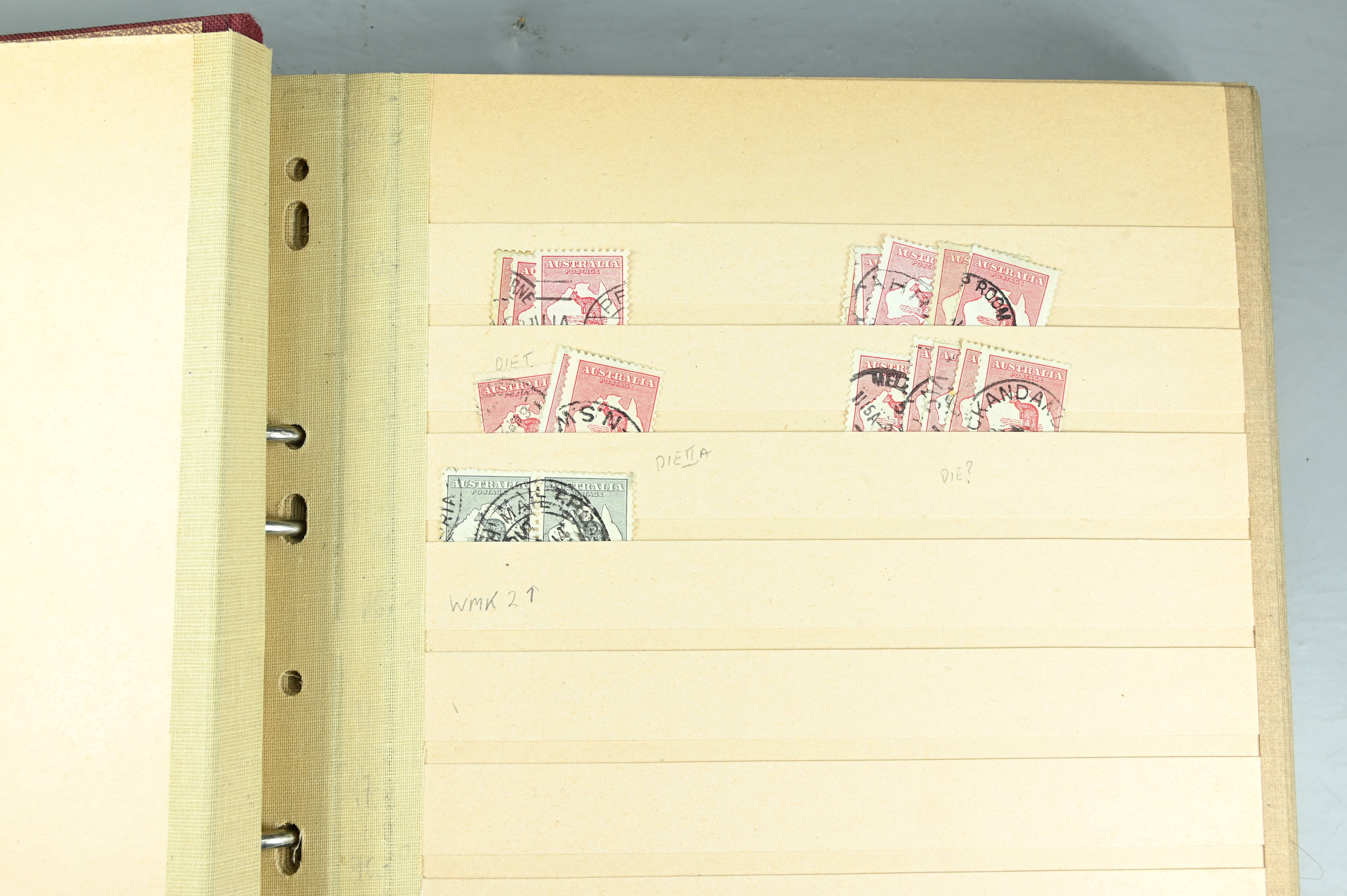 Extensive dealer stock book containing Commonwealth Of Asutralia stamps from SG1 onwards. Many Roos of various types, watermarks and dies. Strong mid range including sets, high values etc. The collection continues through to modern commemoratives, including sets, high values to $10. At the end of the collection contains a strong range of Postage Dues, and Mint stamps from KGV heads onwards, including 2s Roo. This collection has not been checked and is sold as is. |