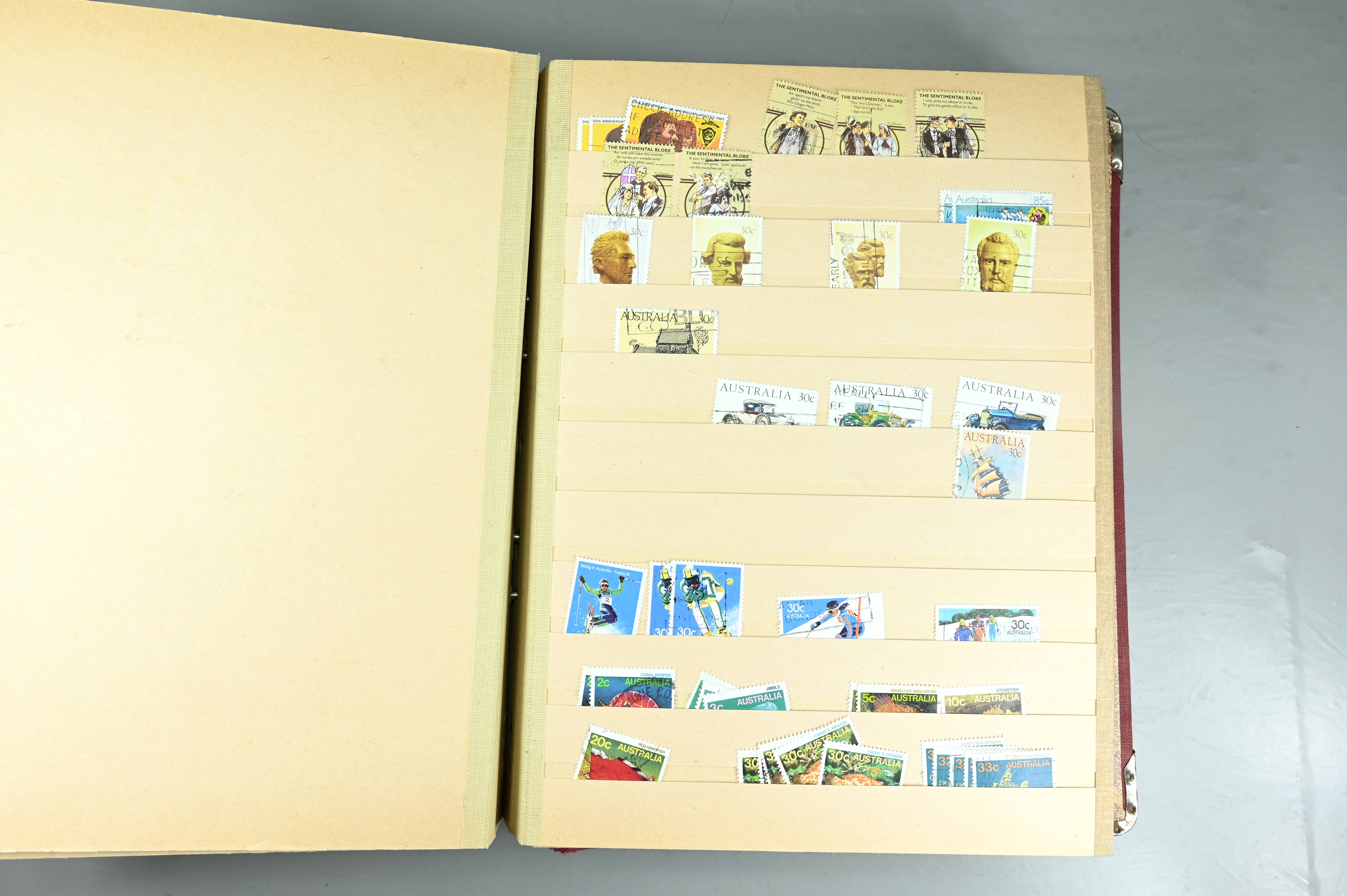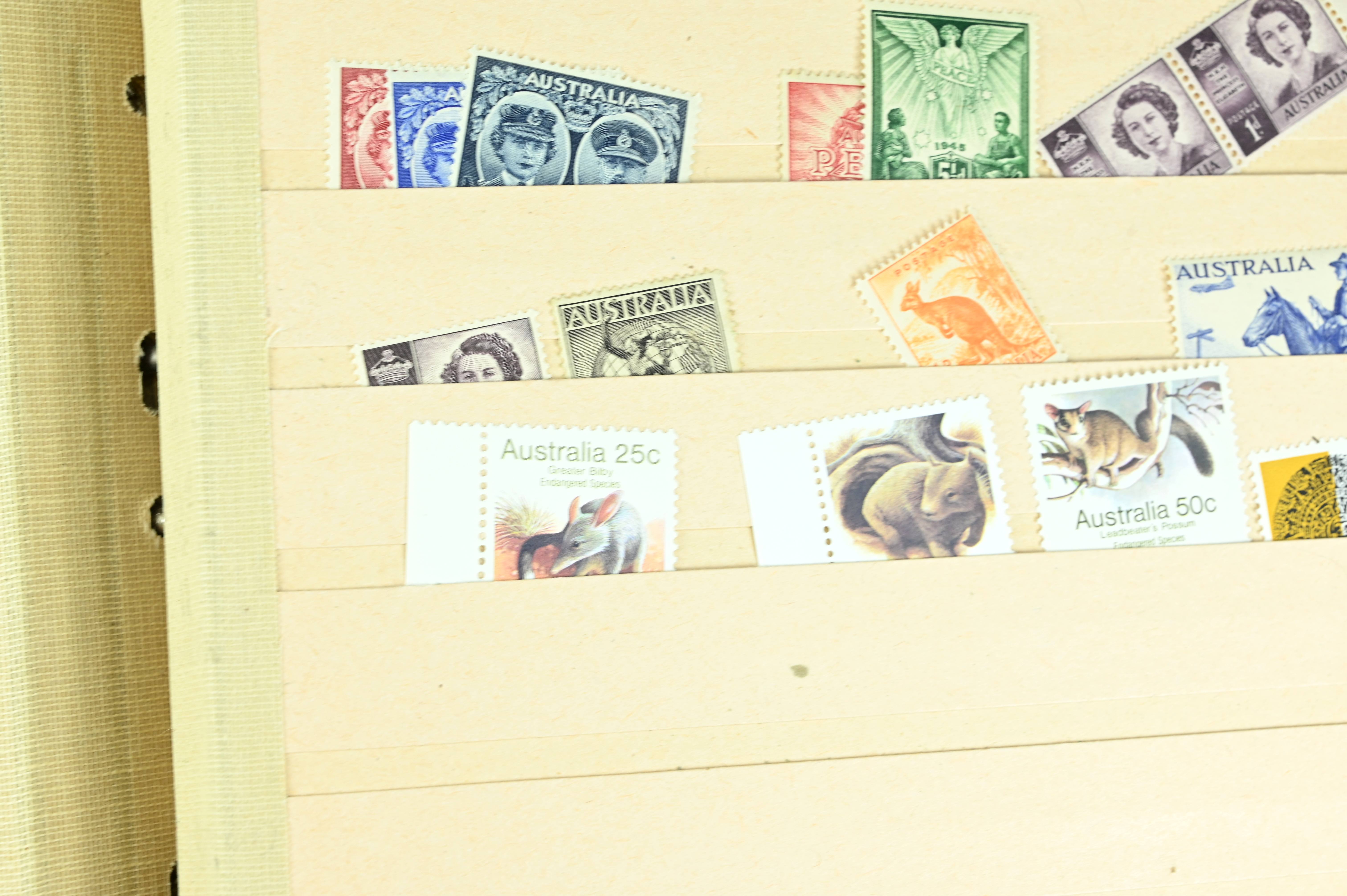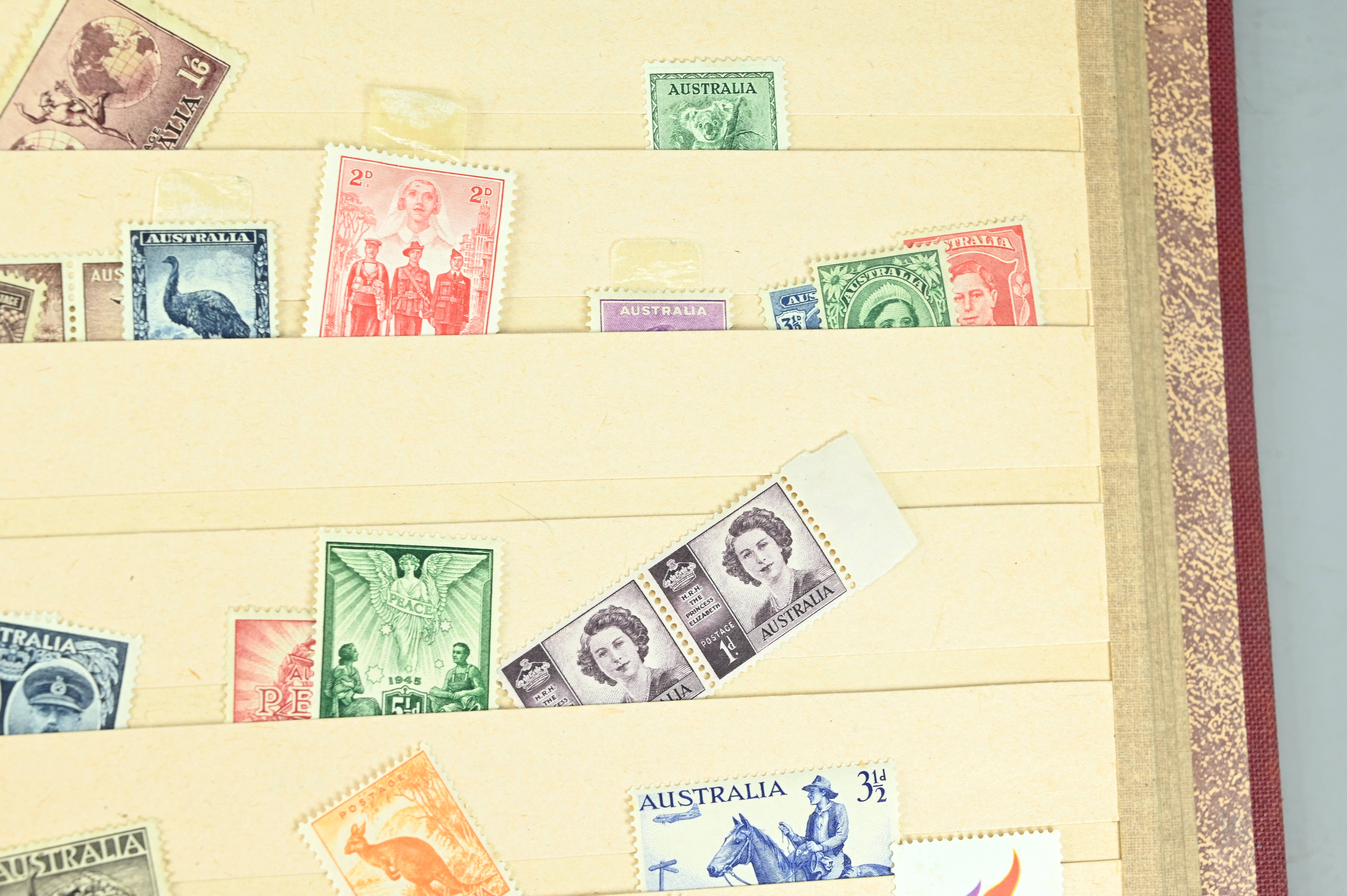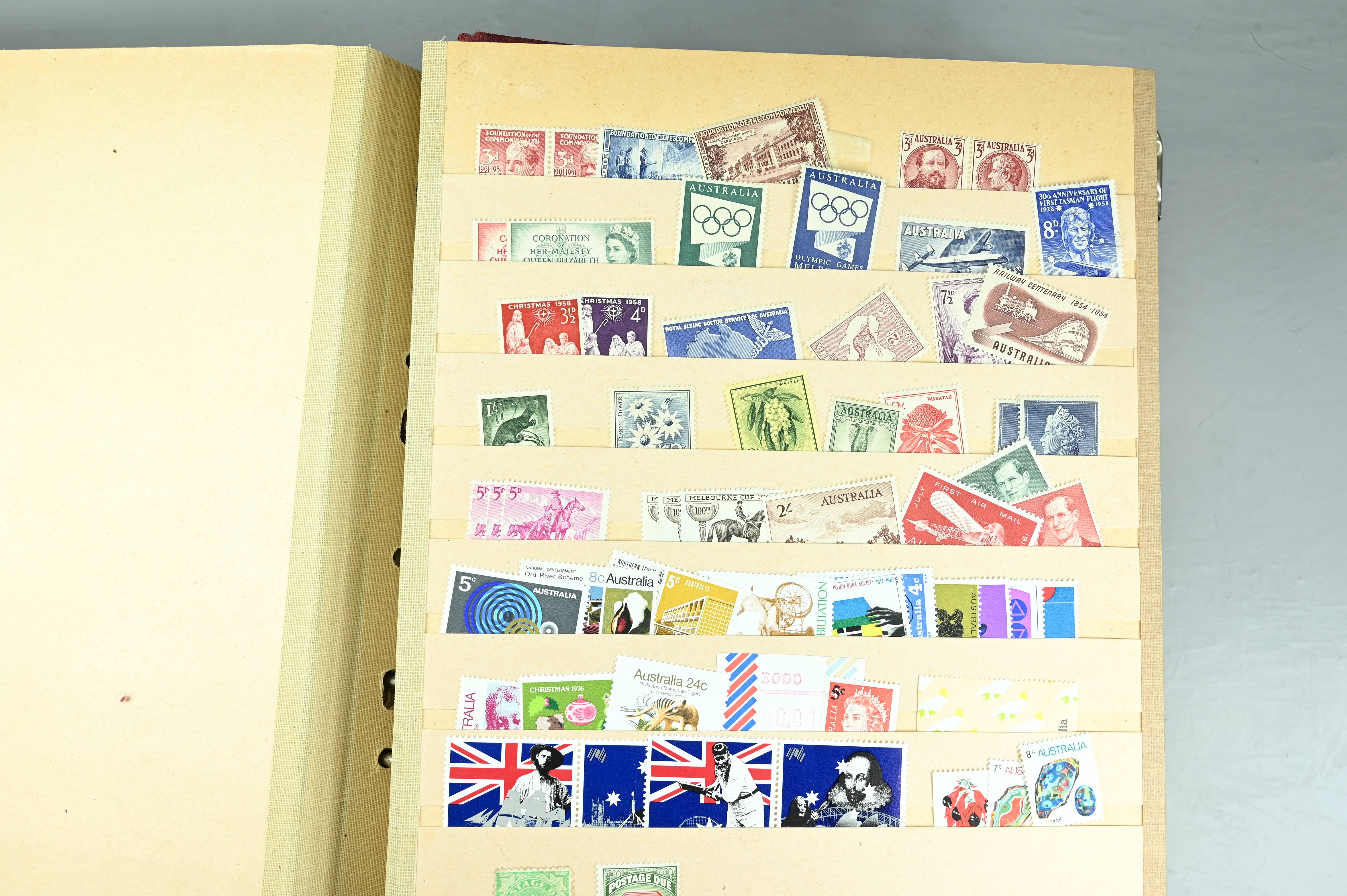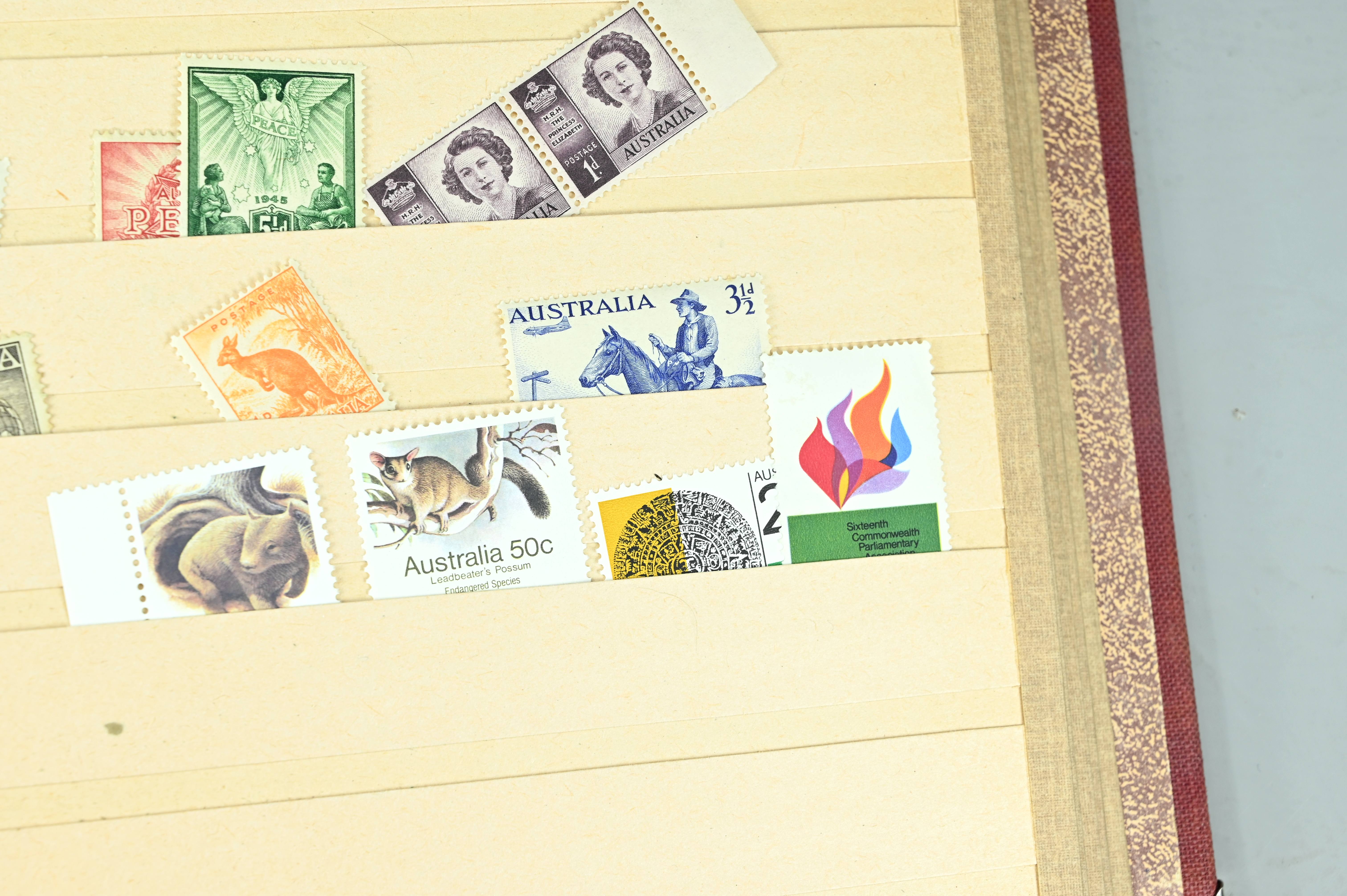 Extensive dealer stock book containing Commonwealth Of Asutralia stamps from SG1 onwards. Many Roos of various types, watermarks and dies. Strong mid range including sets, high values etc. The collection continues through to modern commemoratives, including sets, high values to $10. At the end of the collection contains a strong range of Postage Dues, and Mint stamps from KGV heads onwards, including 2s Roo. This collection has not been checked and is sold as is. |