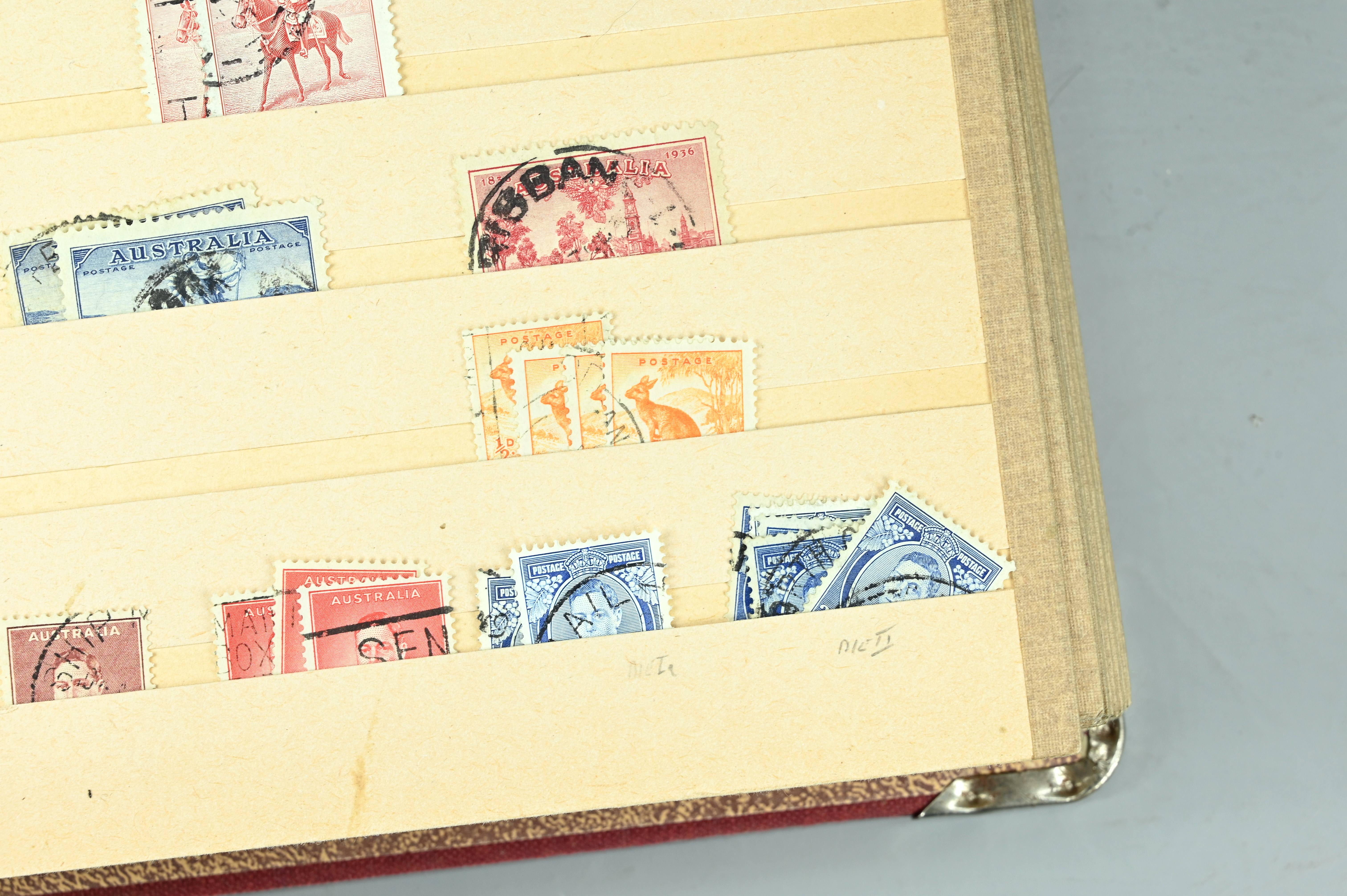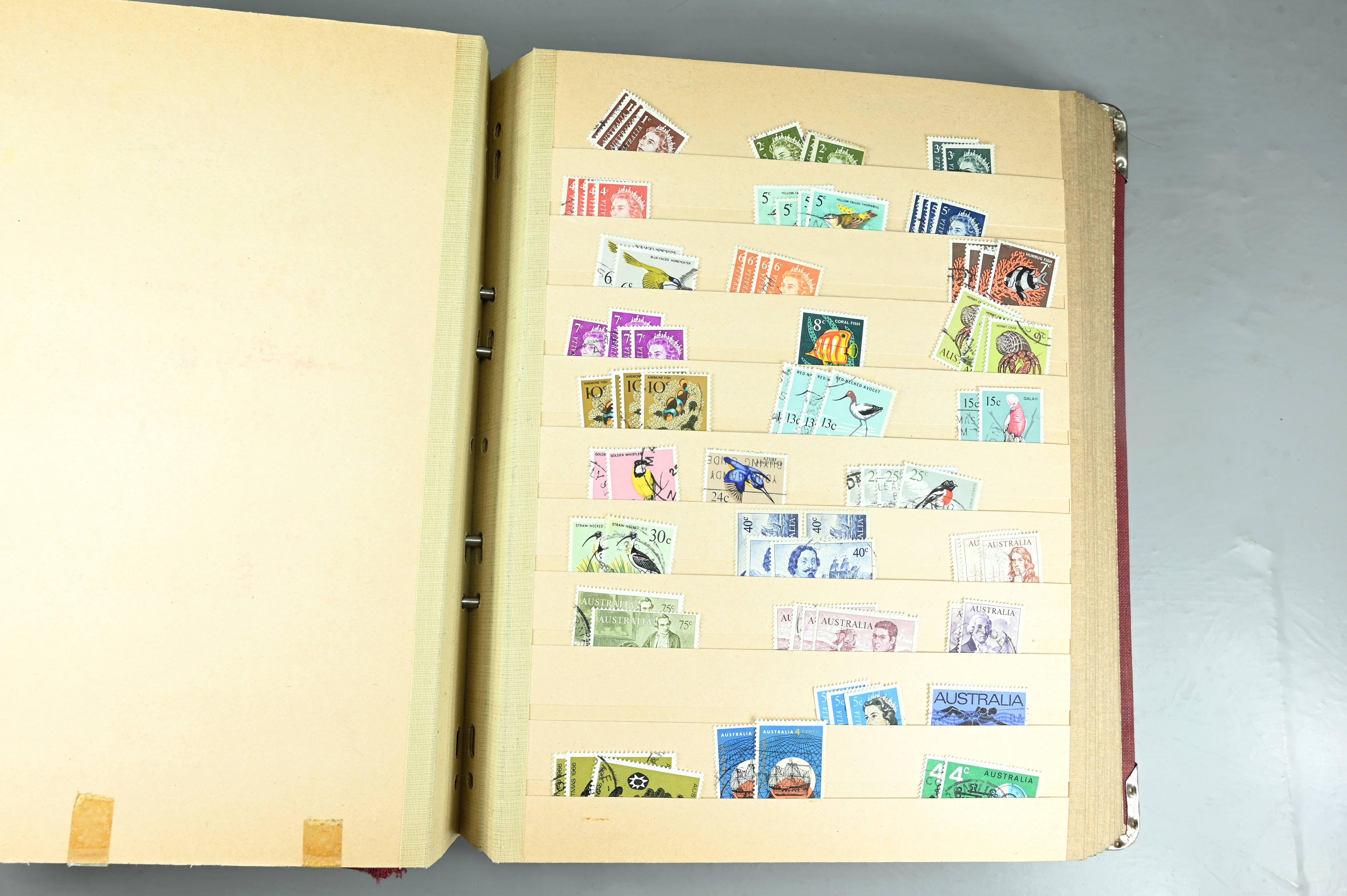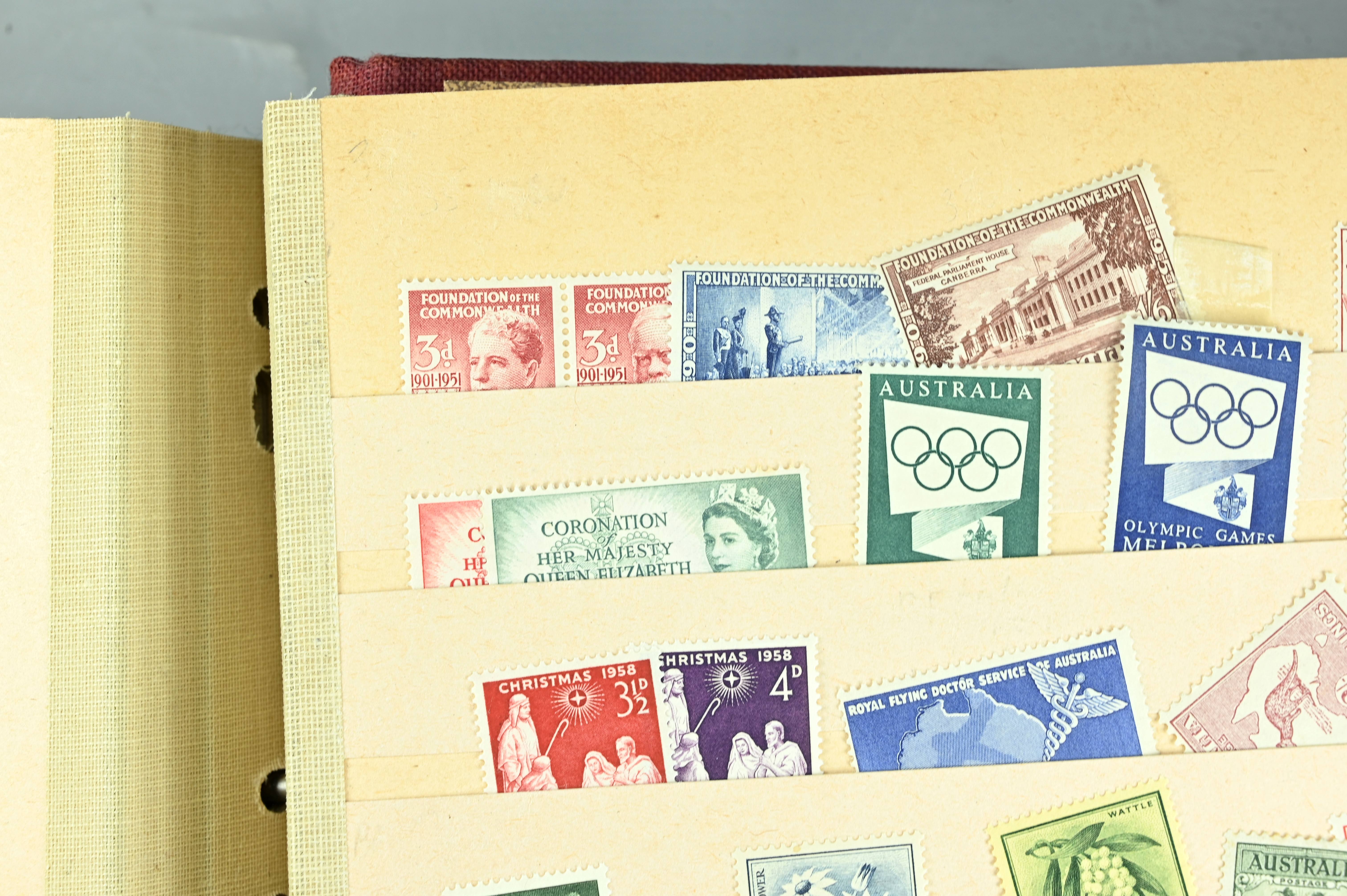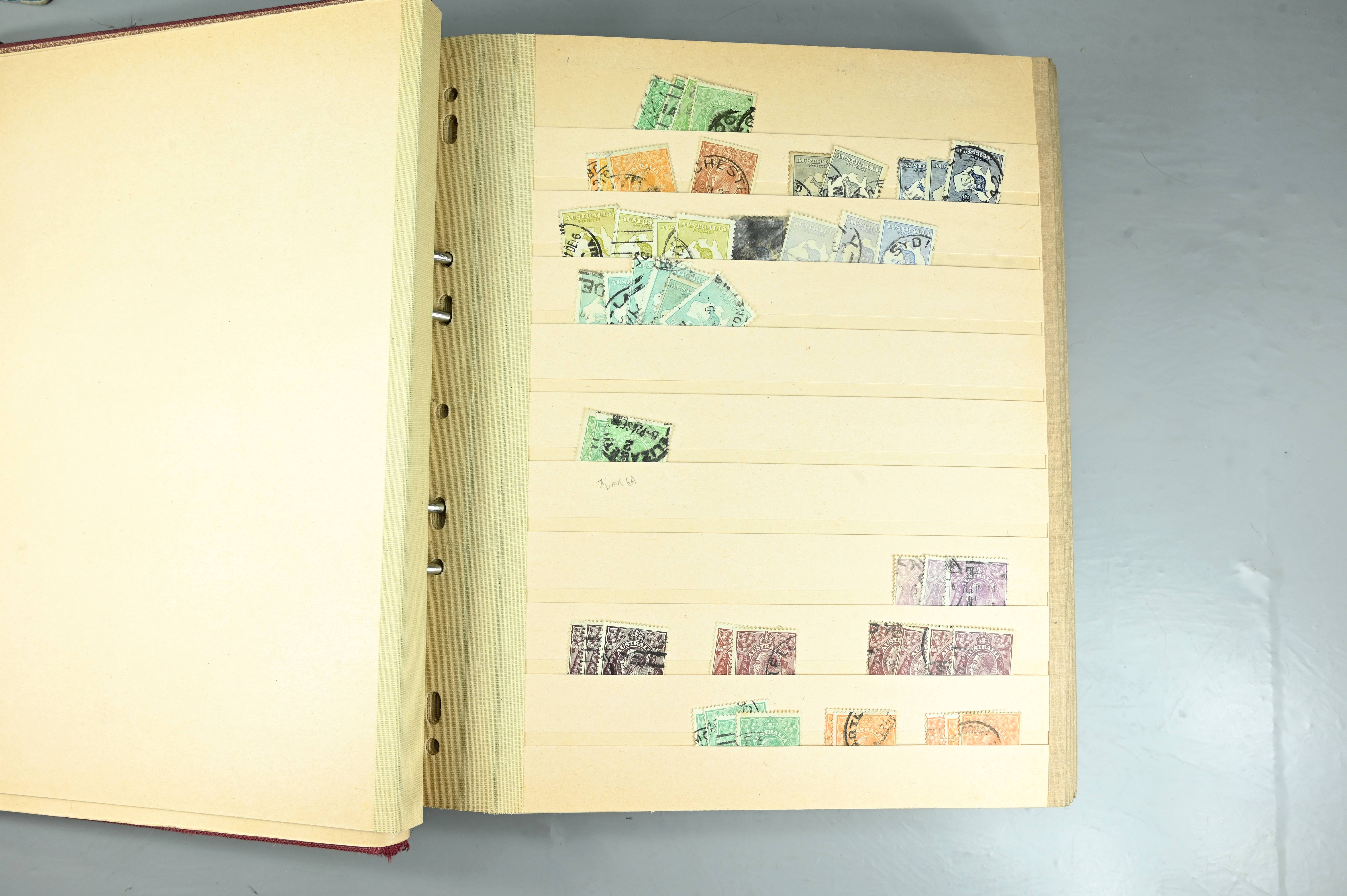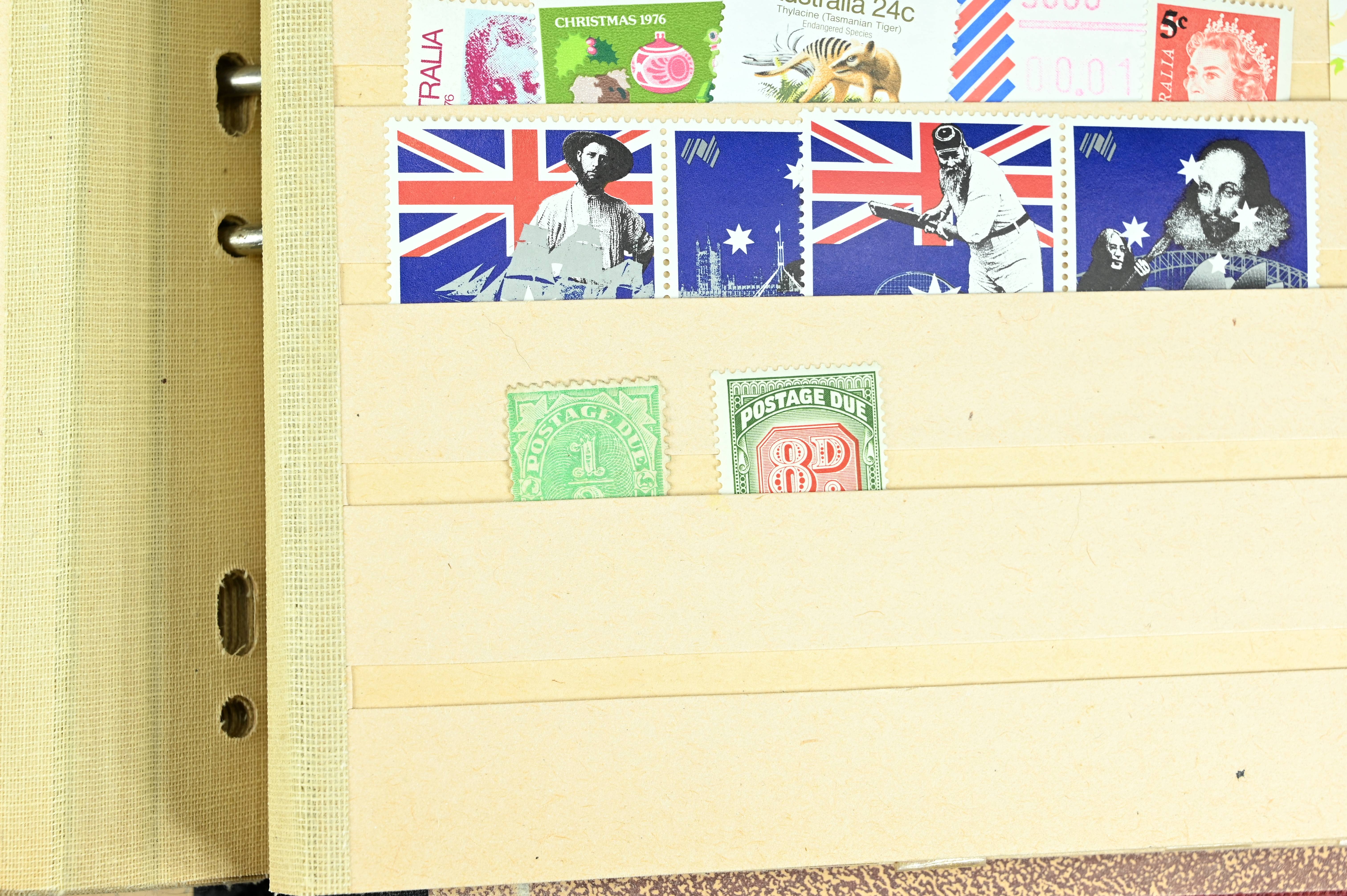 Extensive dealer stock book containing Commonwealth Of Asutralia stamps from SG1 onwards. Many Roos of various types, watermarks and dies. Strong mid range including sets, high values etc. The collection continues through to modern commemoratives, including sets, high values to $10. At the end of the collection contains a strong range of Postage Dues, and Mint stamps from KGV heads onwards, including 2s Roo. This collection has not been checked and is sold as is. |