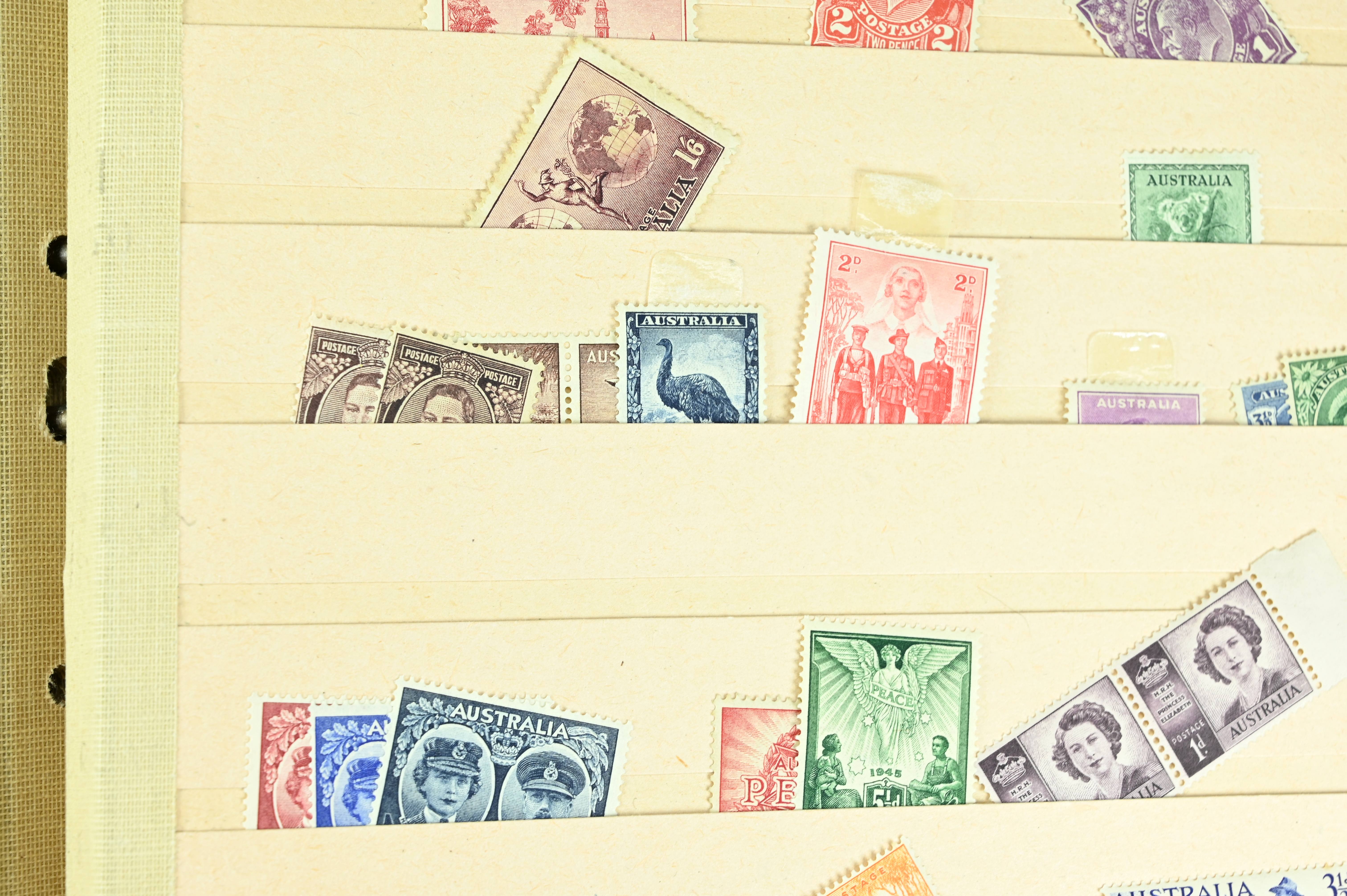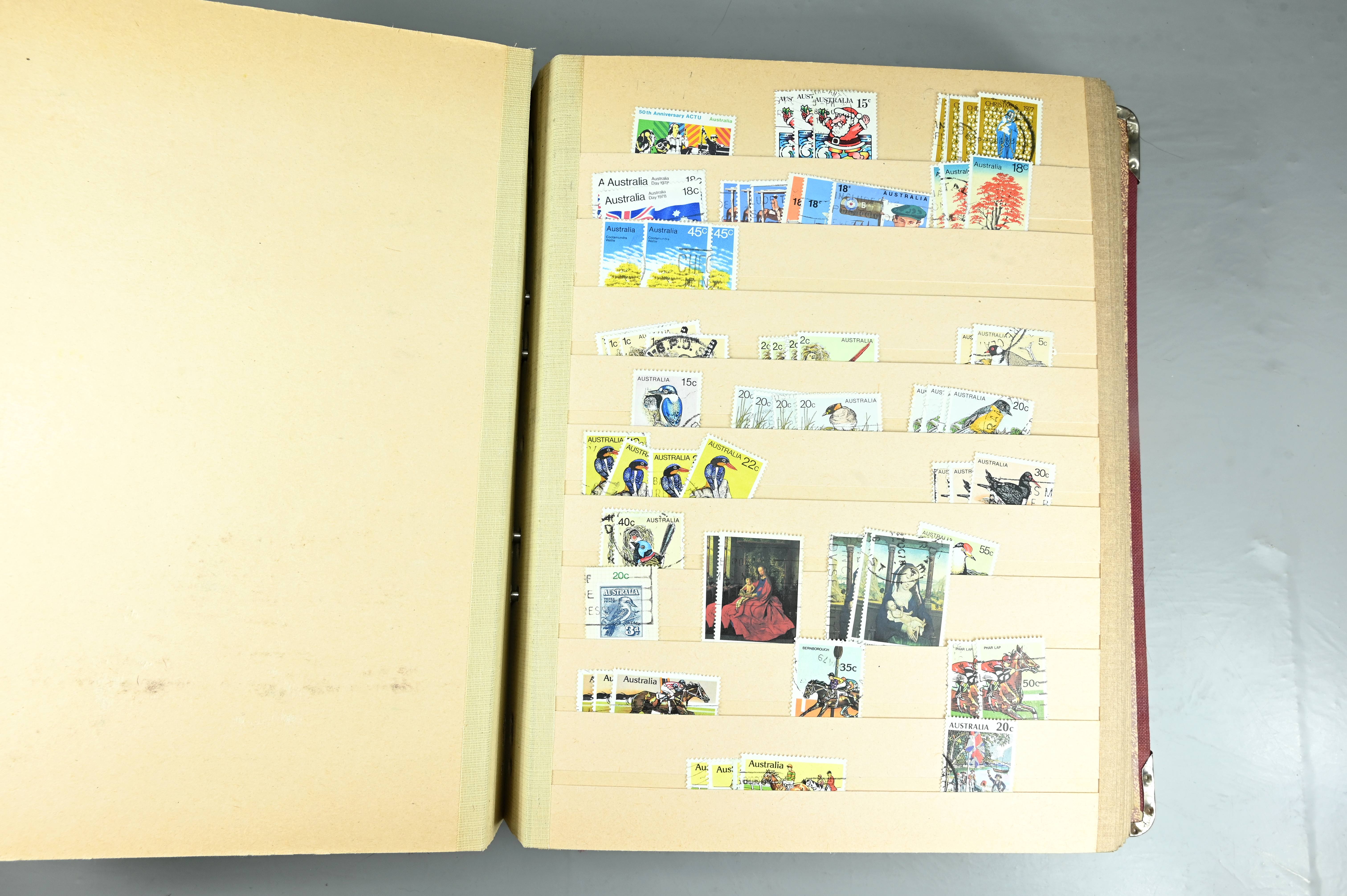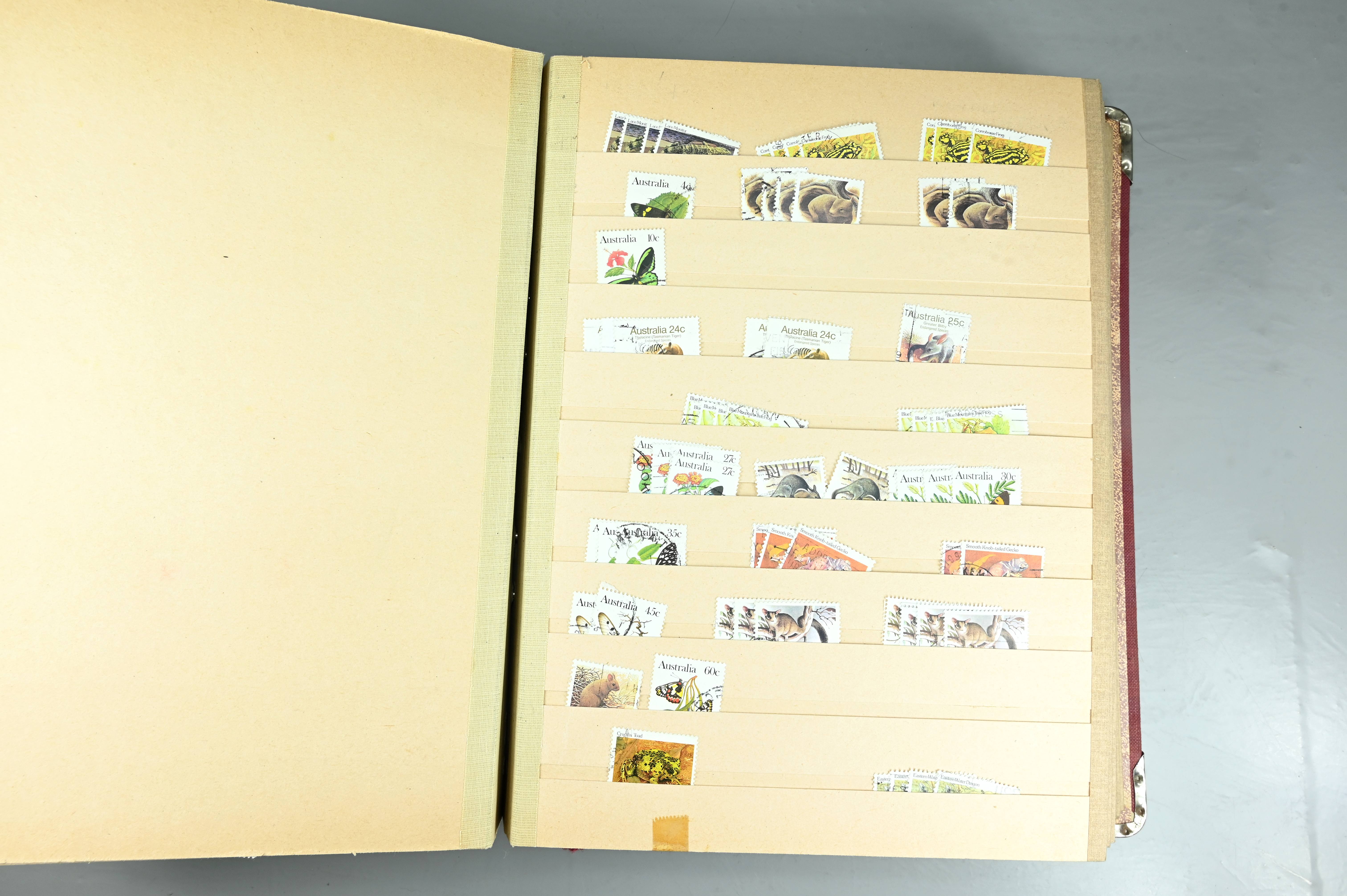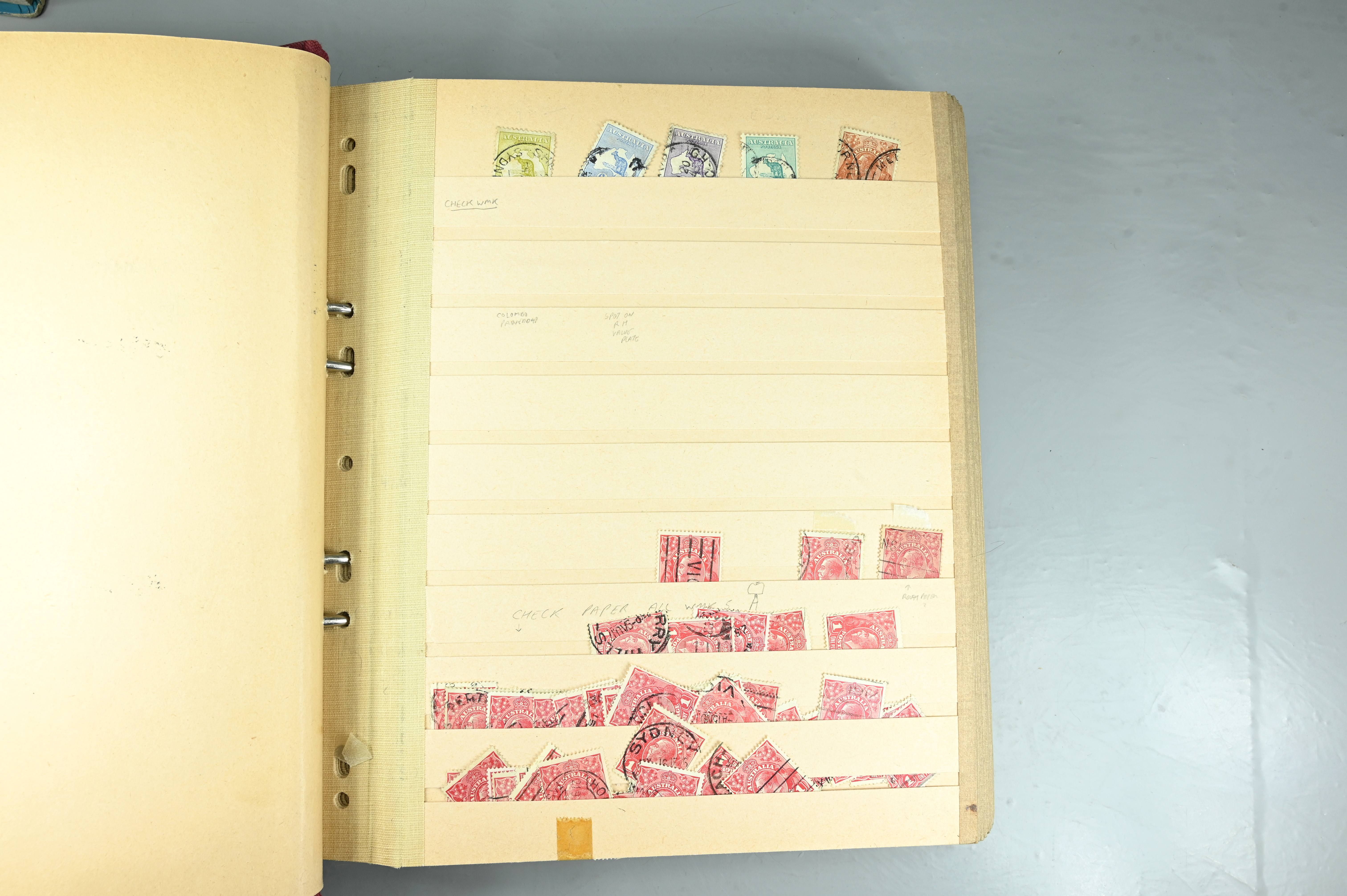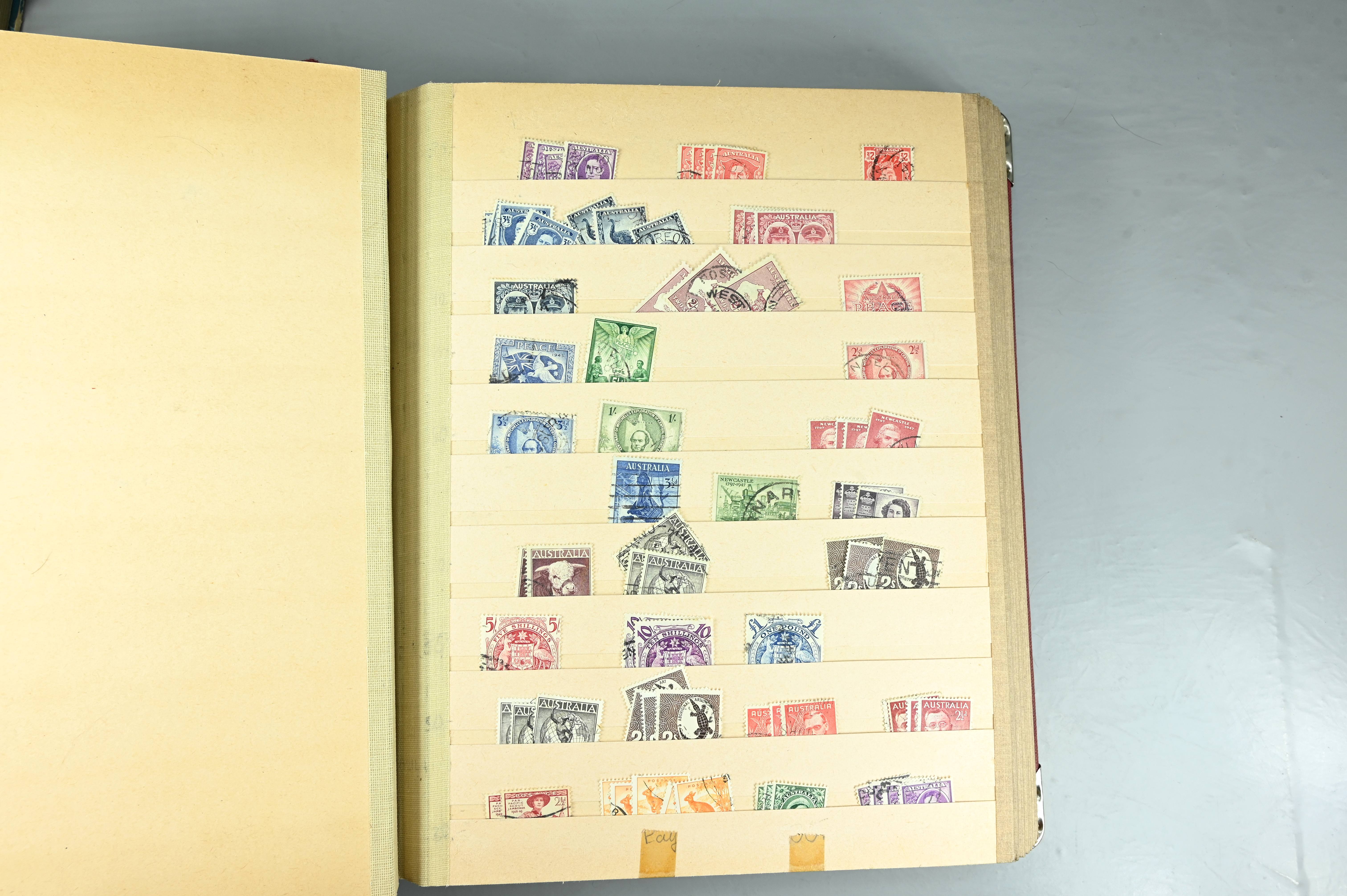 Extensive dealer stock book containing Commonwealth Of Asutralia stamps from SG1 onwards. Many Roos of various types, watermarks and dies. Strong mid range including sets, high values etc. The collection continues through to modern commemoratives, including sets, high values to $10. At the end of the collection contains a strong range of Postage Dues, and Mint stamps from KGV heads onwards, including 2s Roo. This collection has not been checked and is sold as is. |