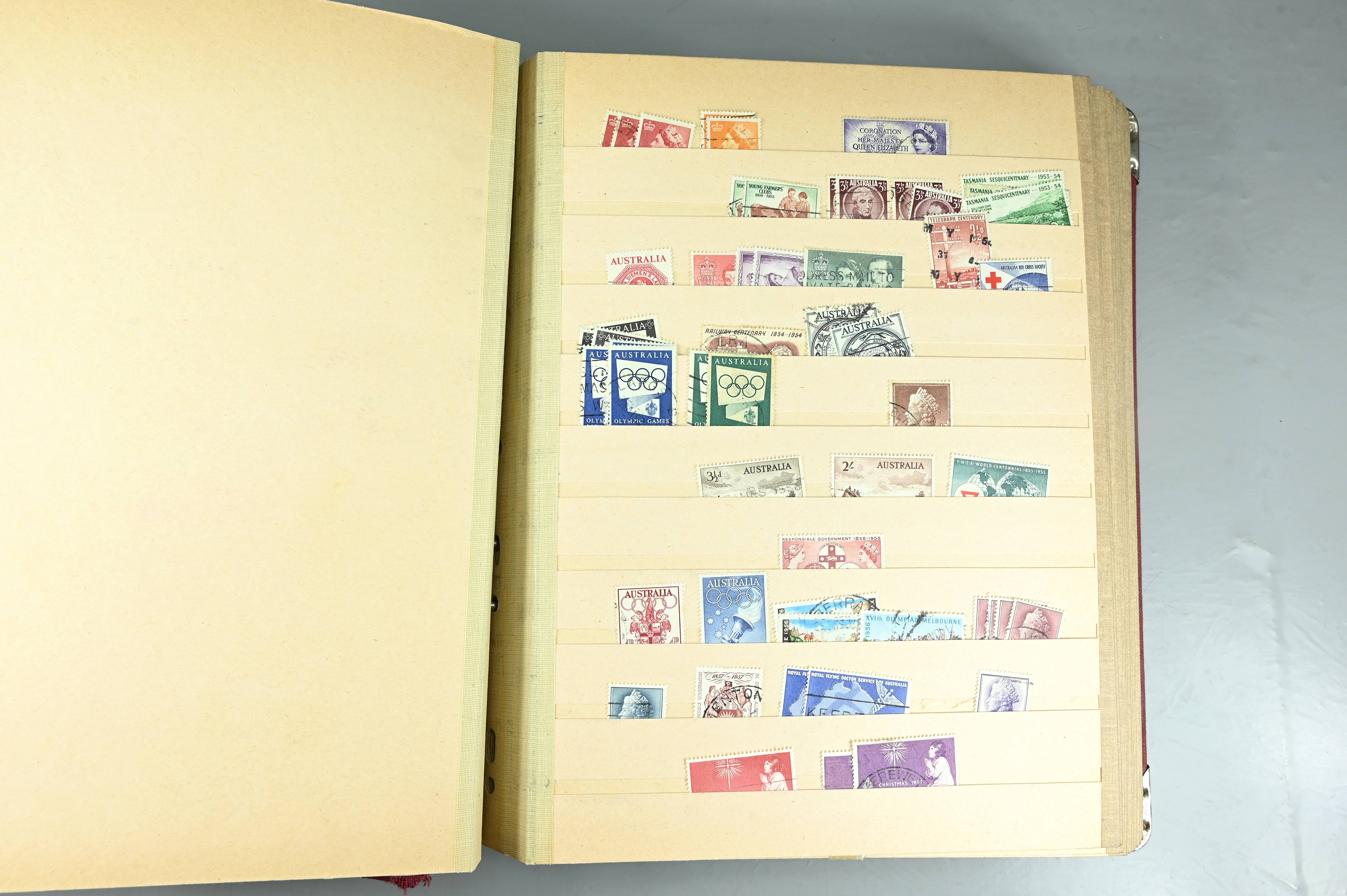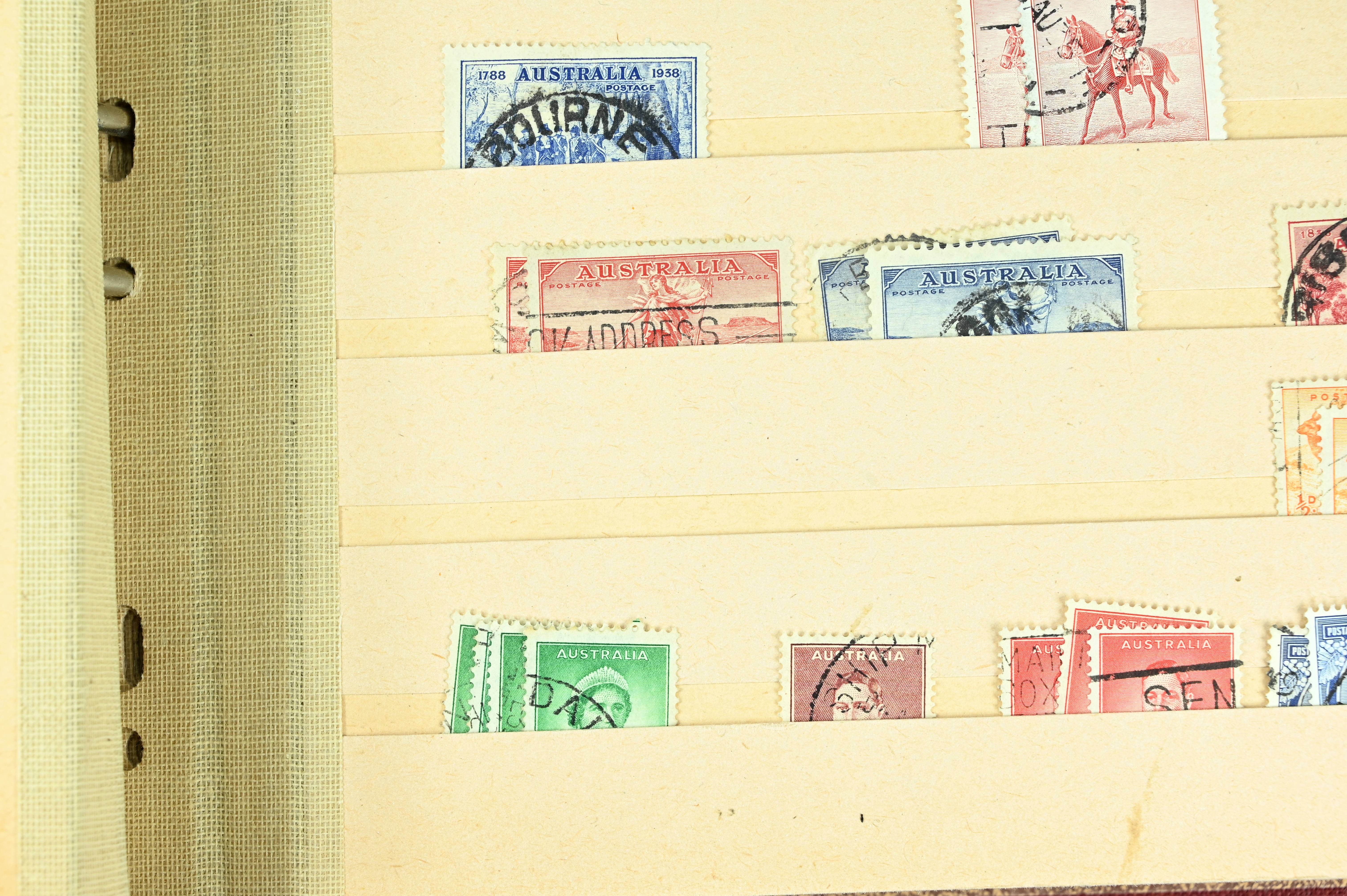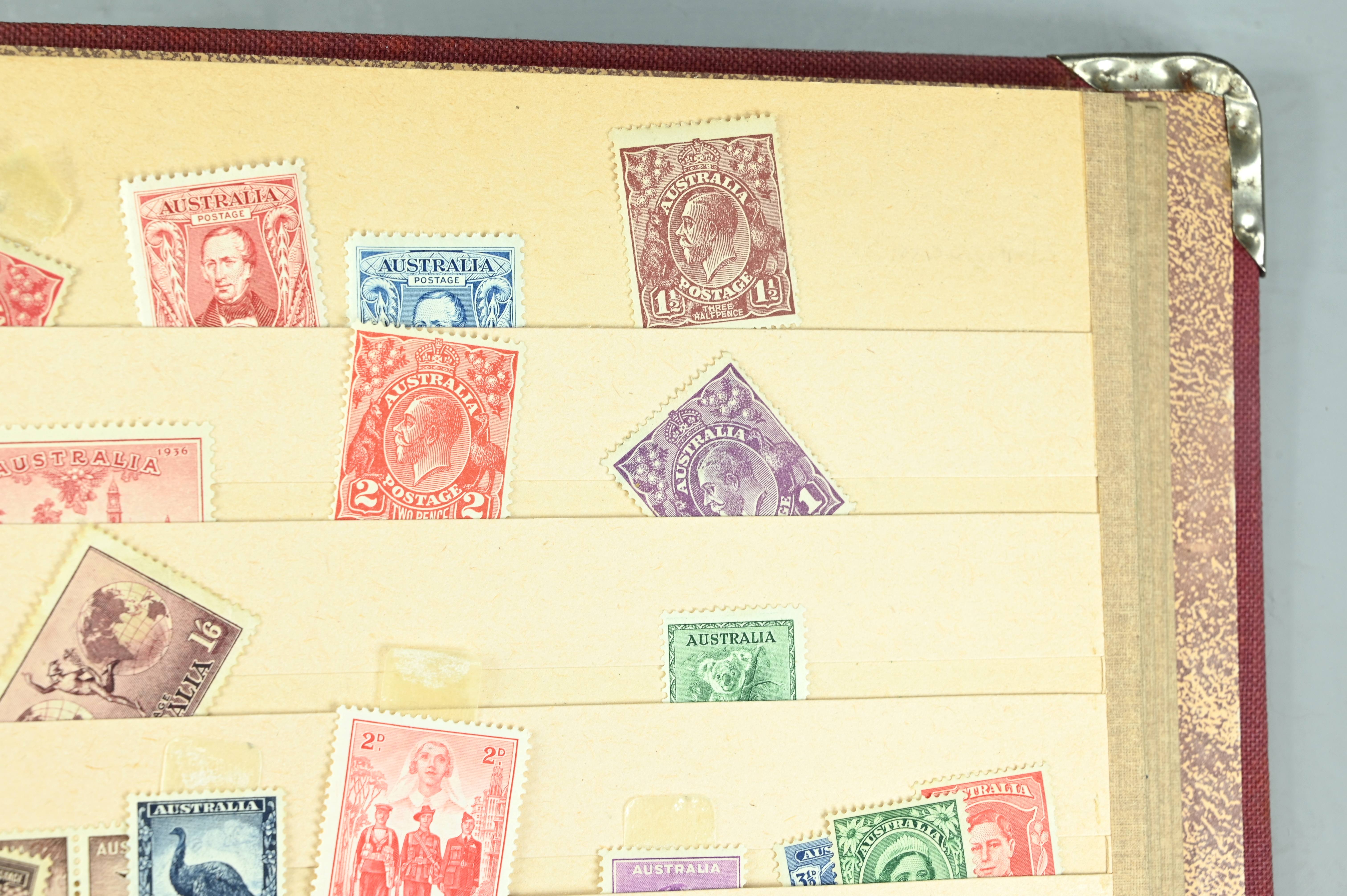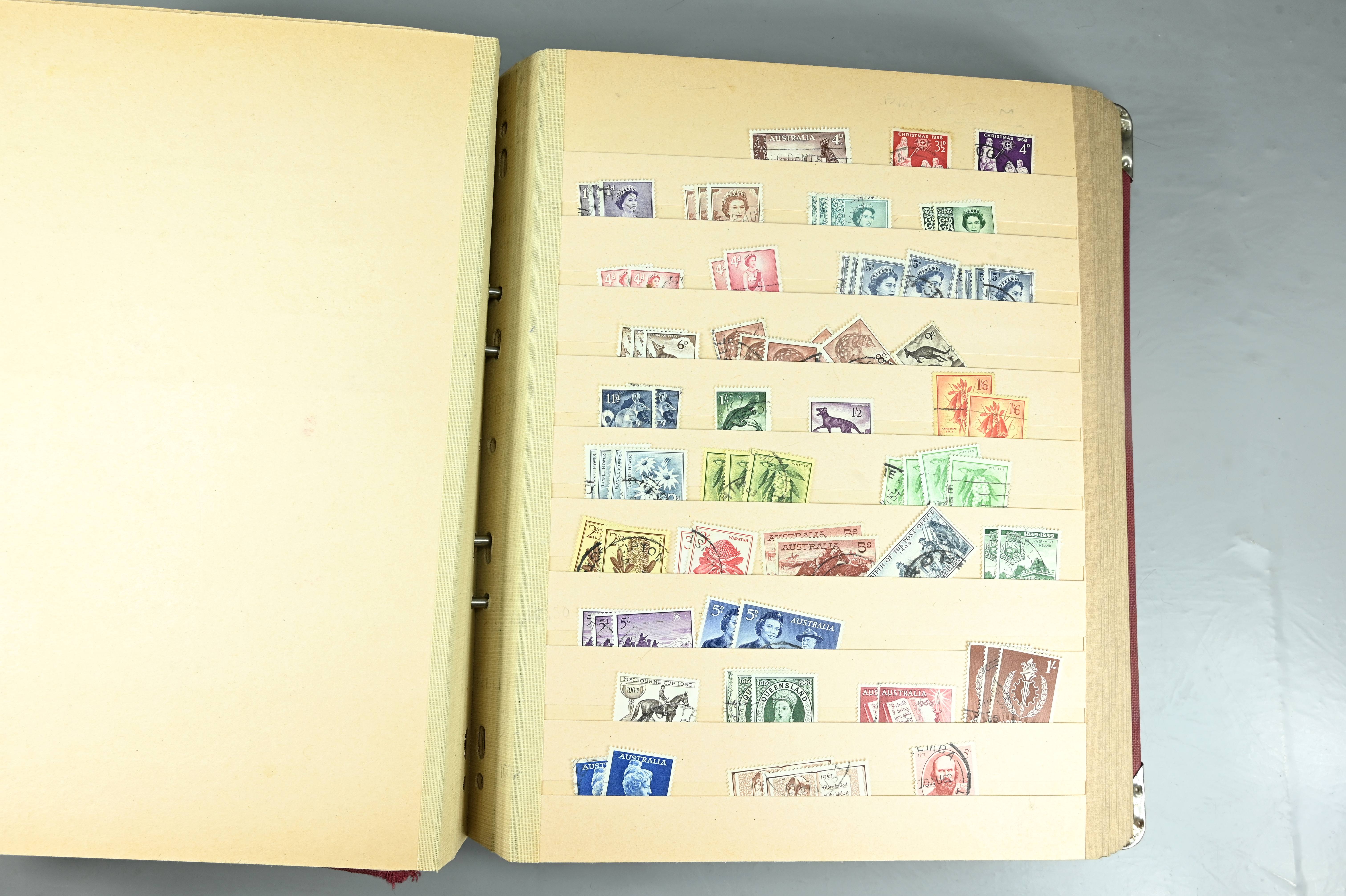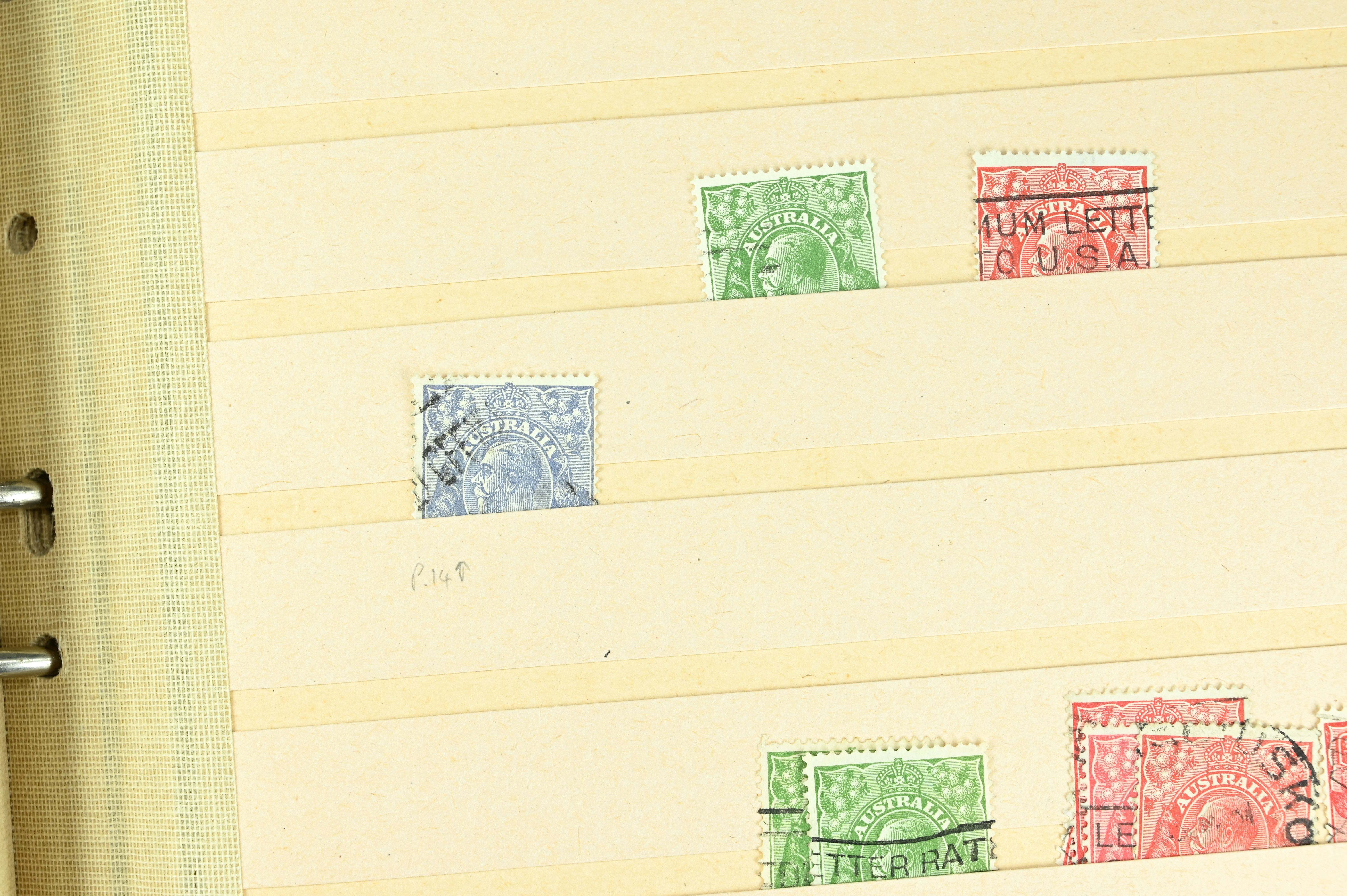 Extensive dealer stock book containing Commonwealth Of Asutralia stamps from SG1 onwards. Many Roos of various types, watermarks and dies. Strong mid range including sets, high values etc. The collection continues through to modern commemoratives, including sets, high values to $10. At the end of the collection contains a strong range of Postage Dues, and Mint stamps from KGV heads onwards, including 2s Roo. This collection has not been checked and is sold as is. |