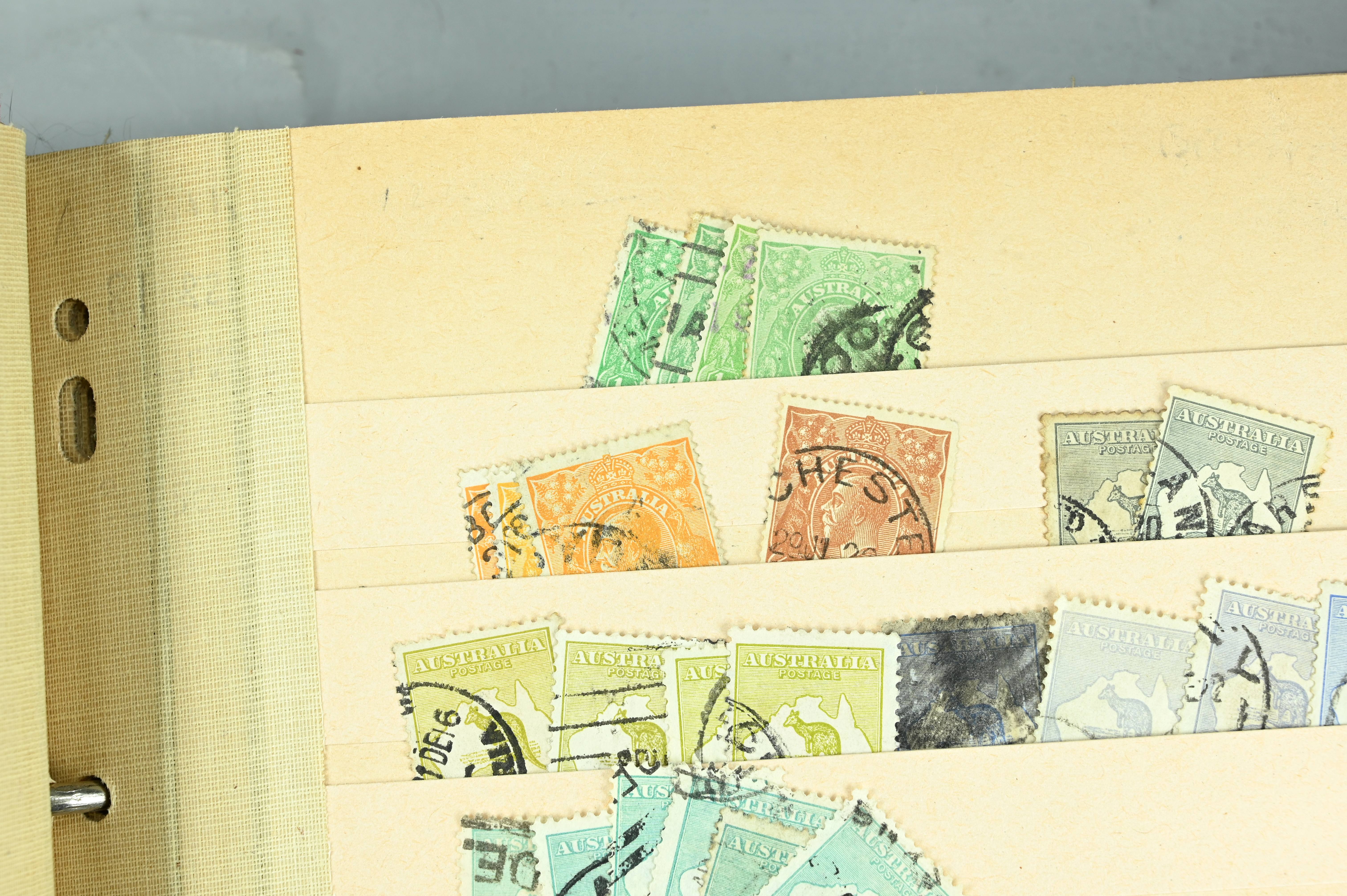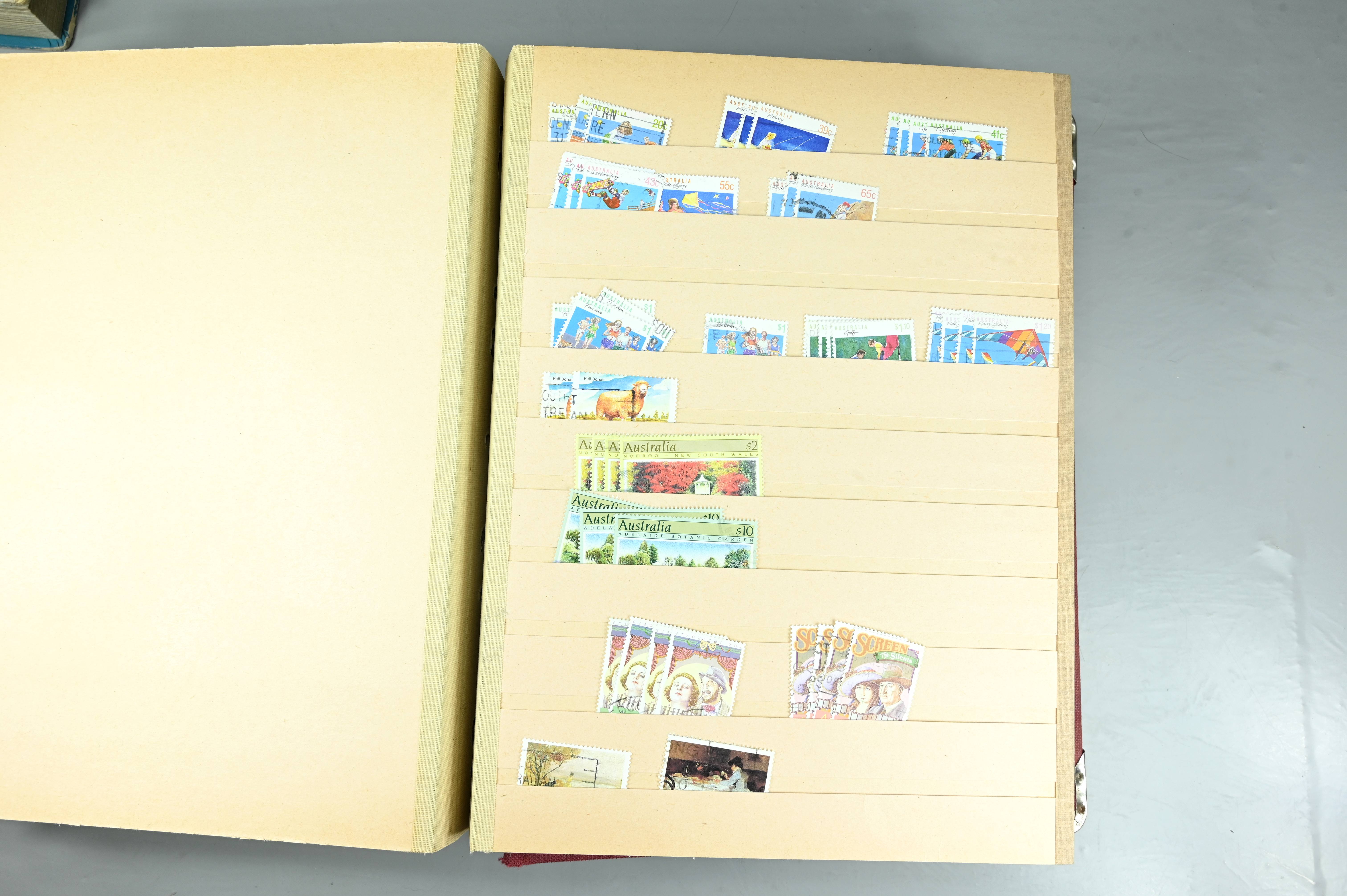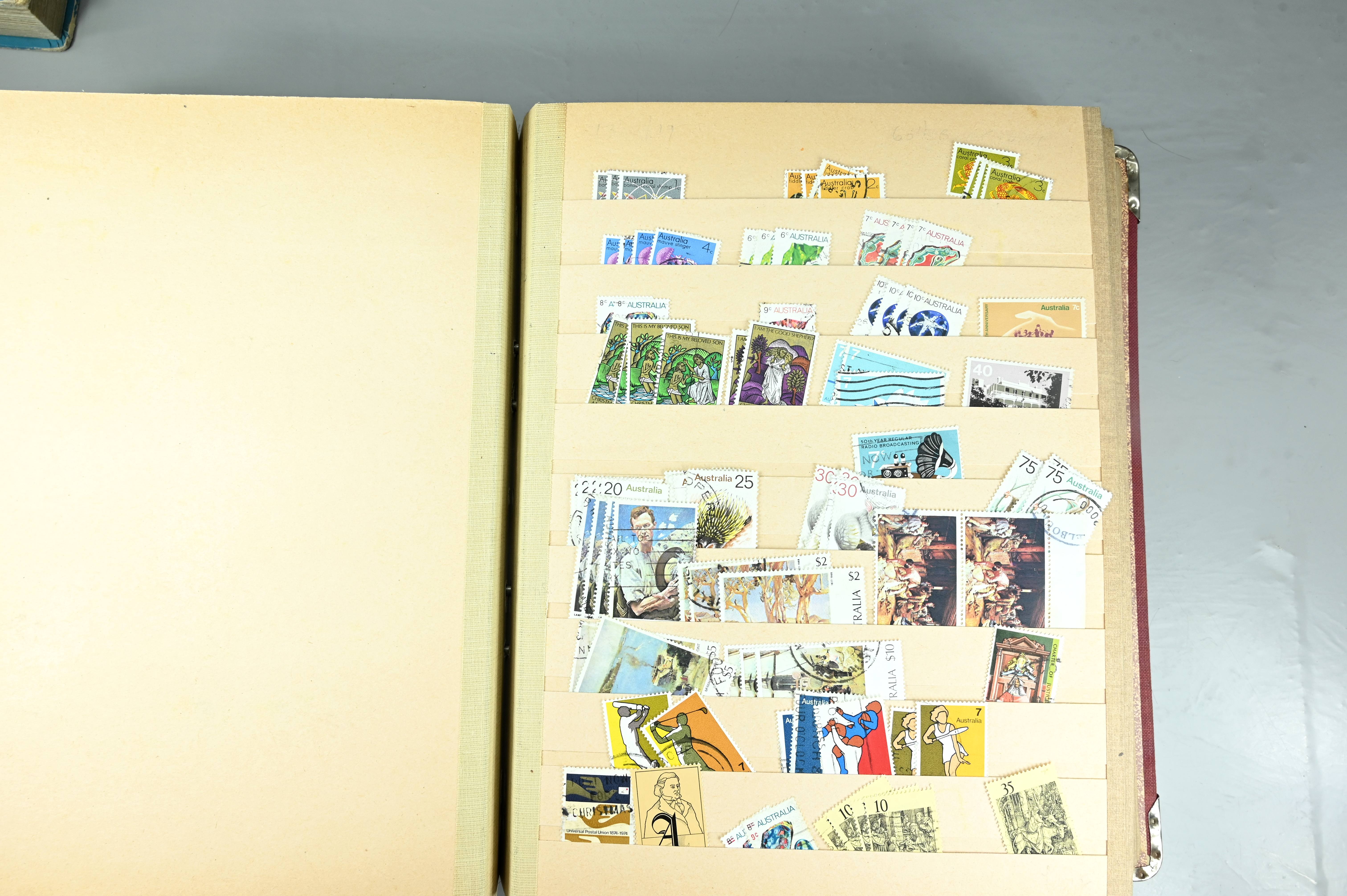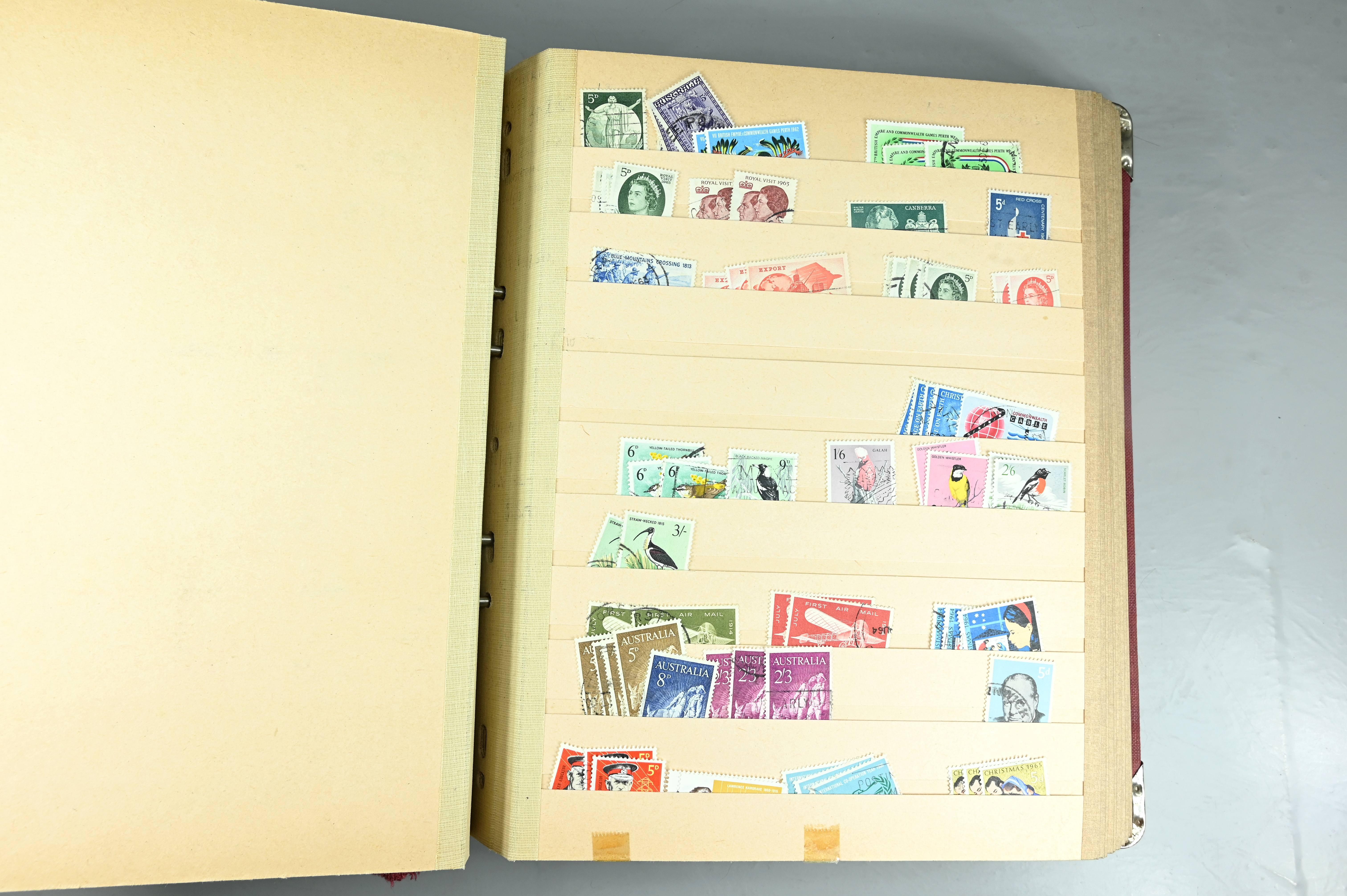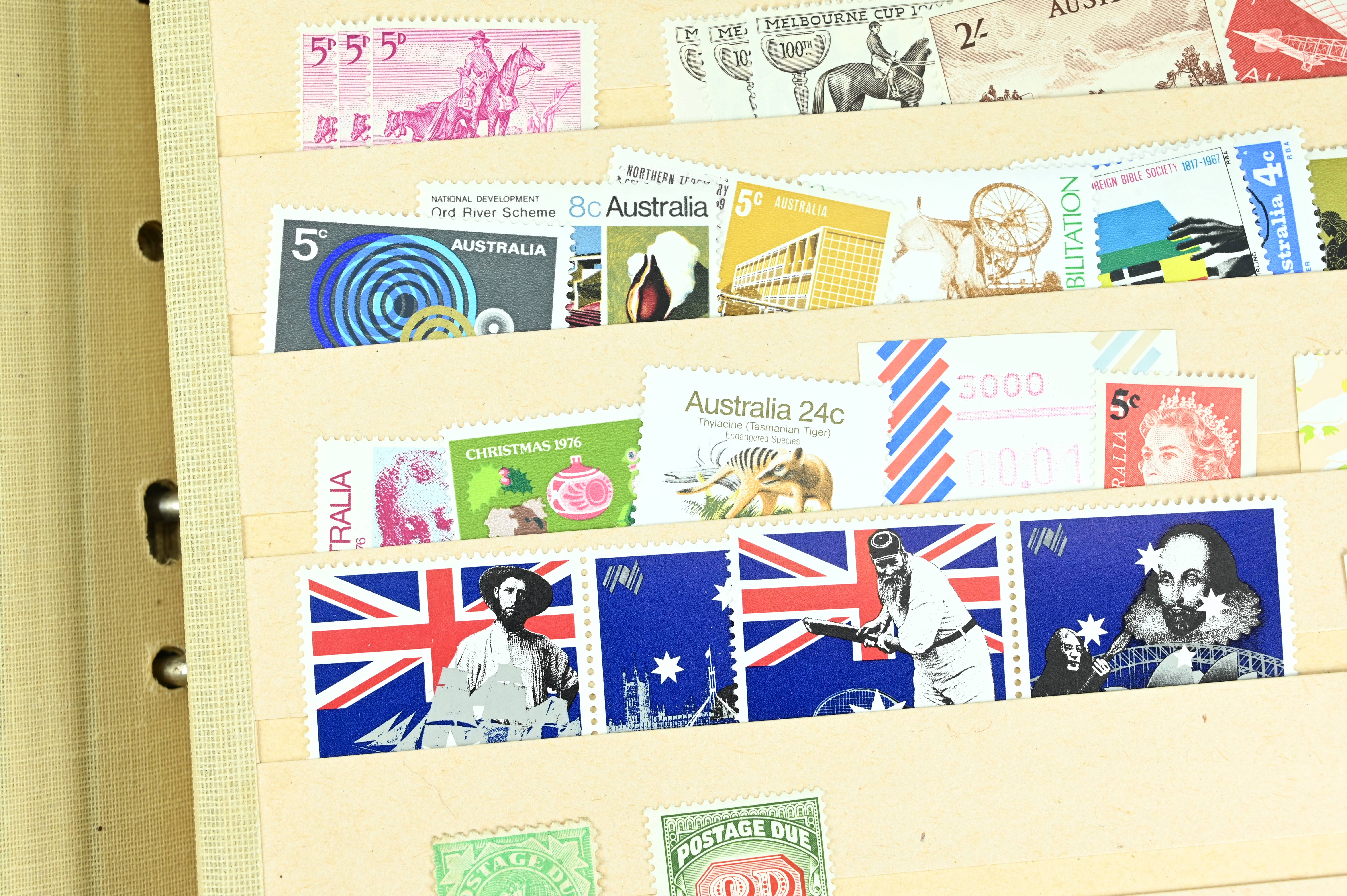 Extensive dealer stock book containing Commonwealth Of Asutralia stamps from SG1 onwards. Many Roos of various types, watermarks and dies. Strong mid range including sets, high values etc. The collection continues through to modern commemoratives, including sets, high values to $10. At the end of the collection contains a strong range of Postage Dues, and Mint stamps from KGV heads onwards, including 2s Roo. This collection has not been checked and is sold as is. |