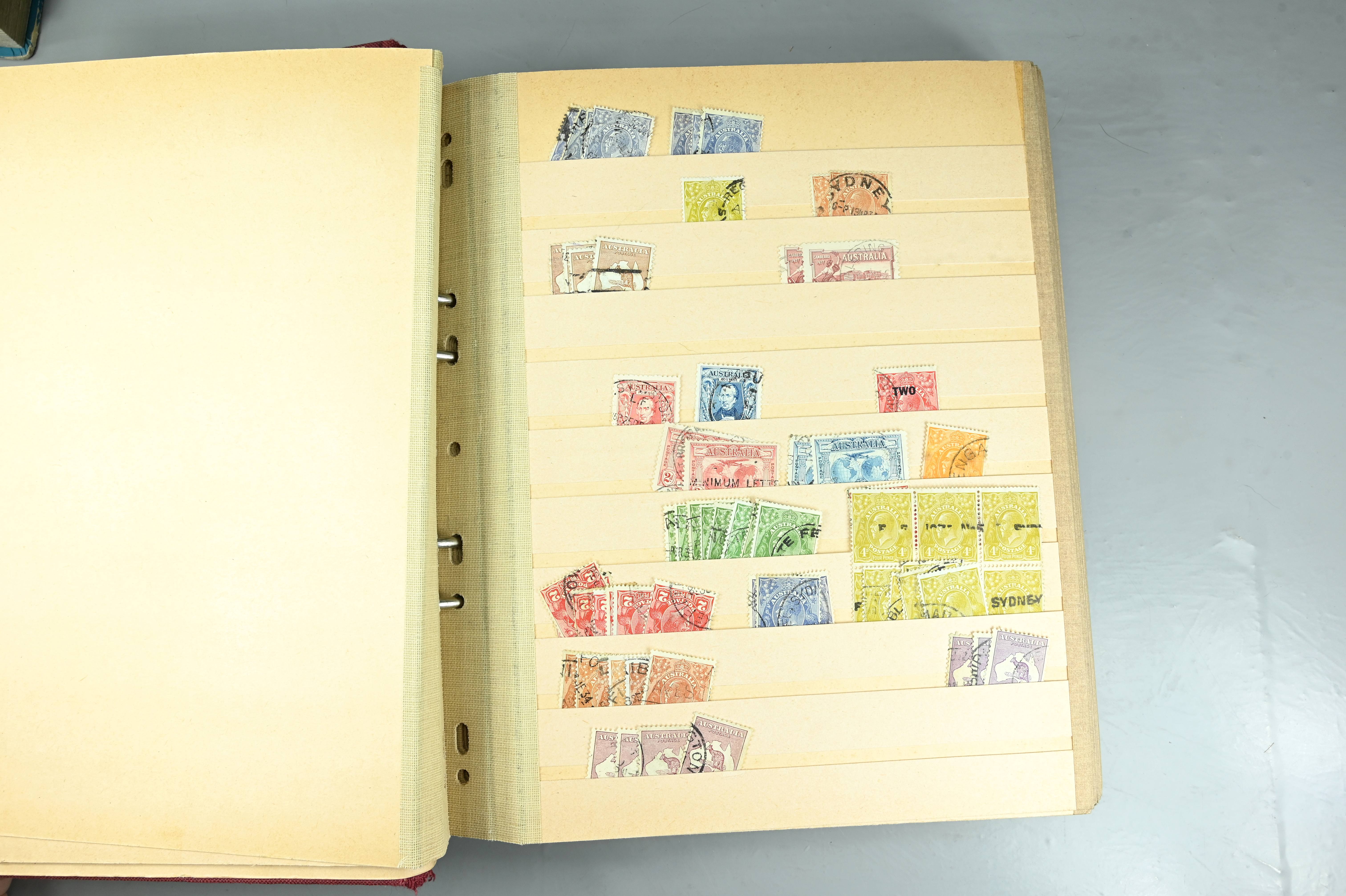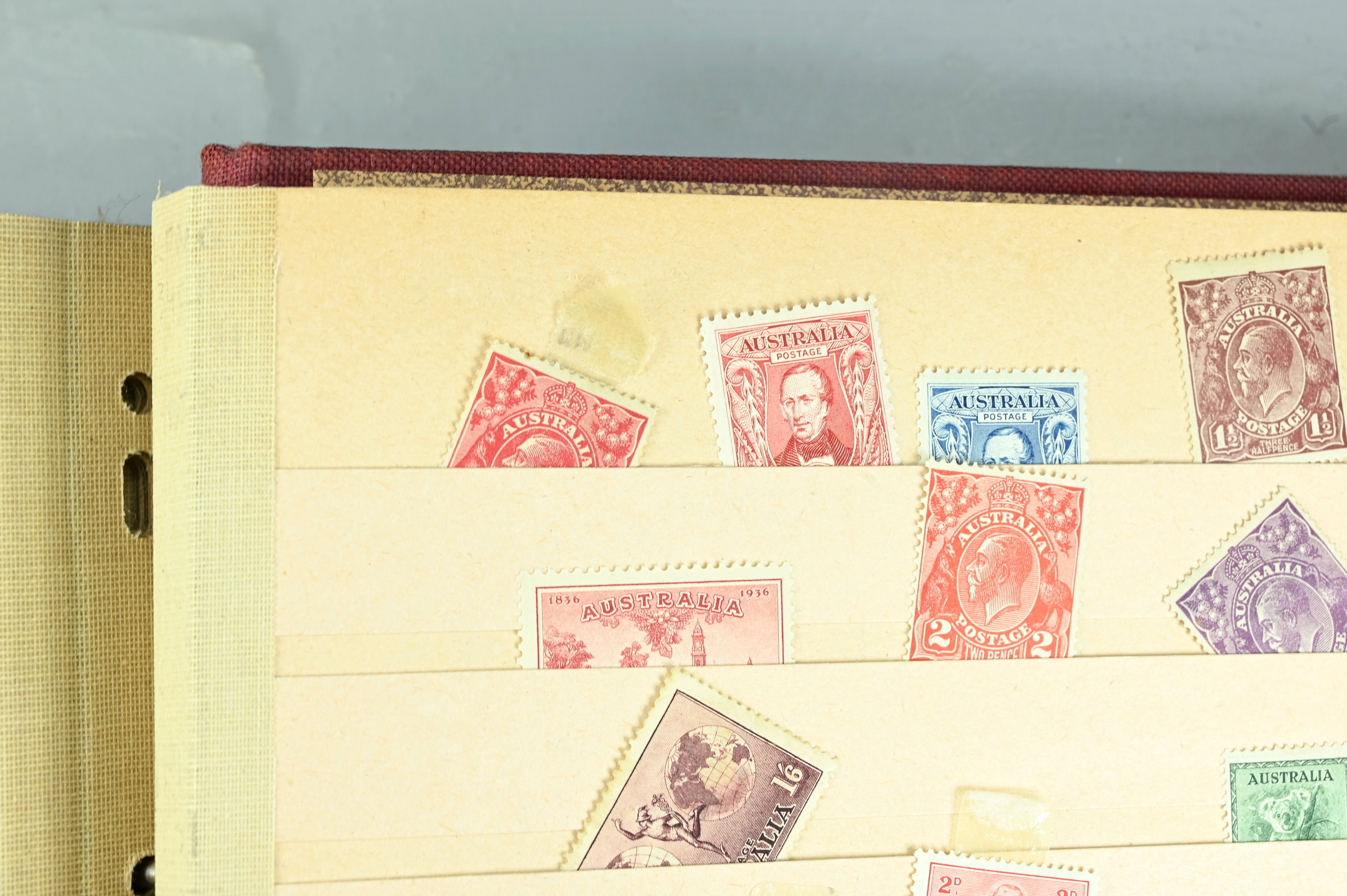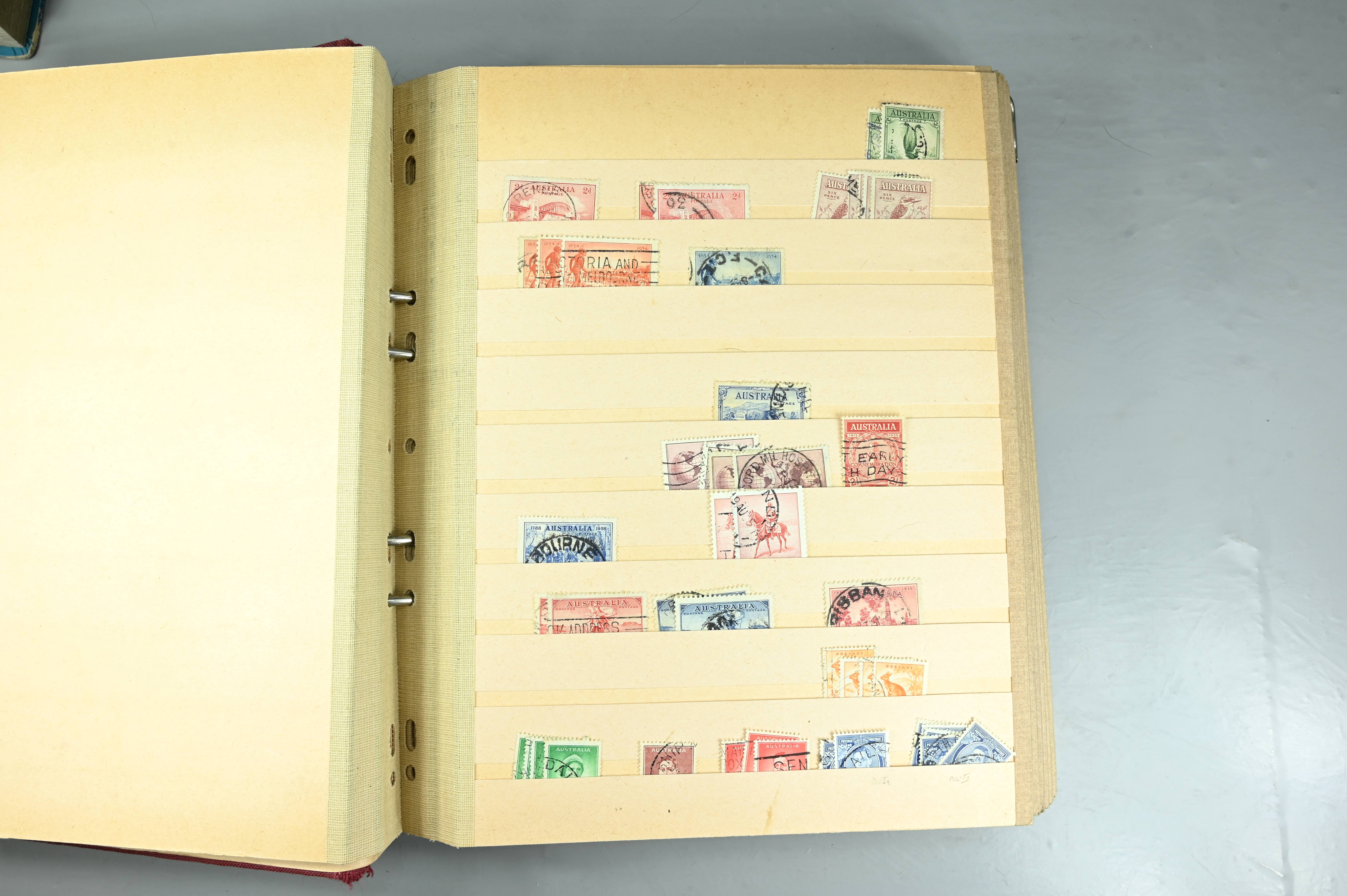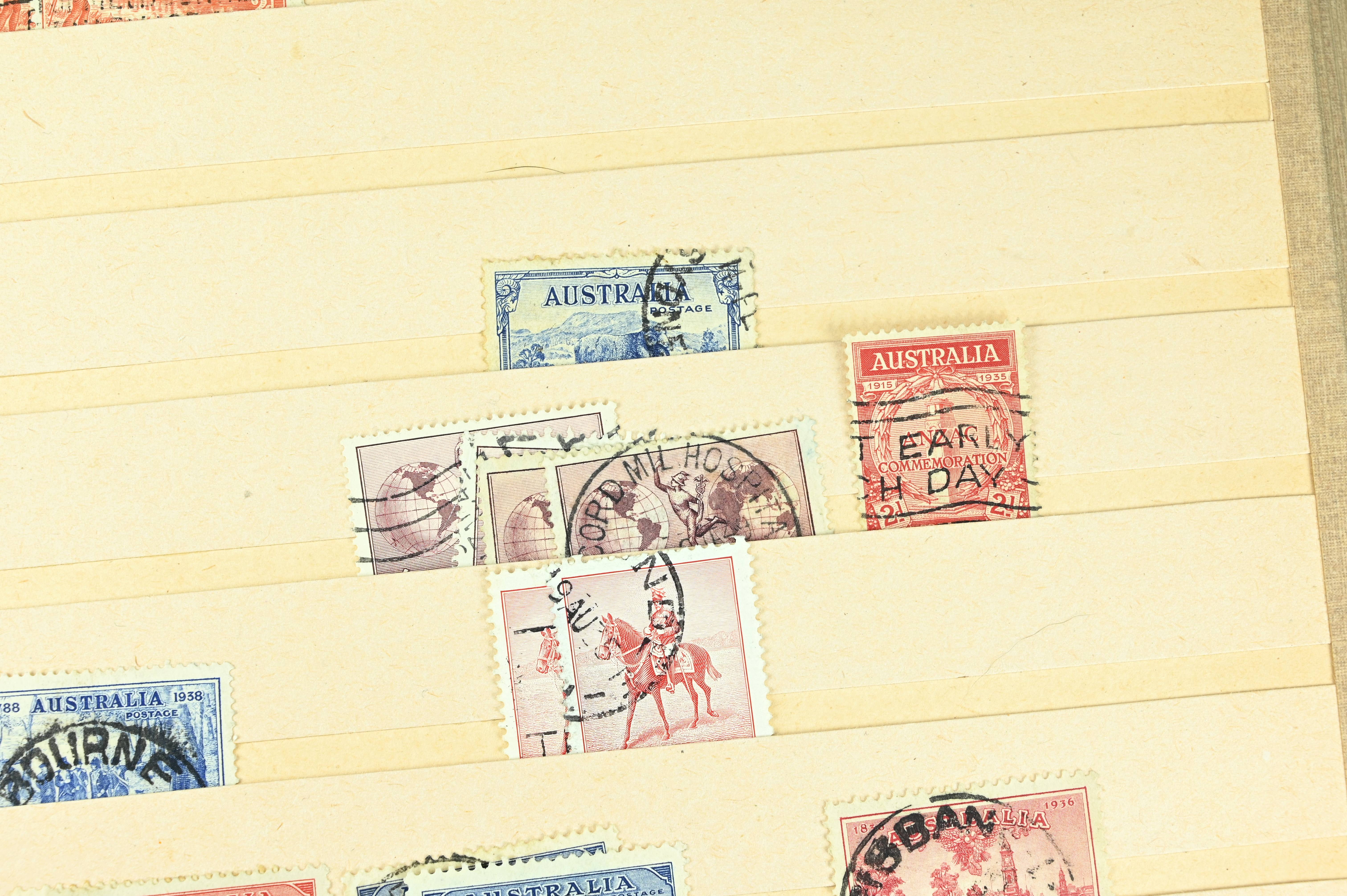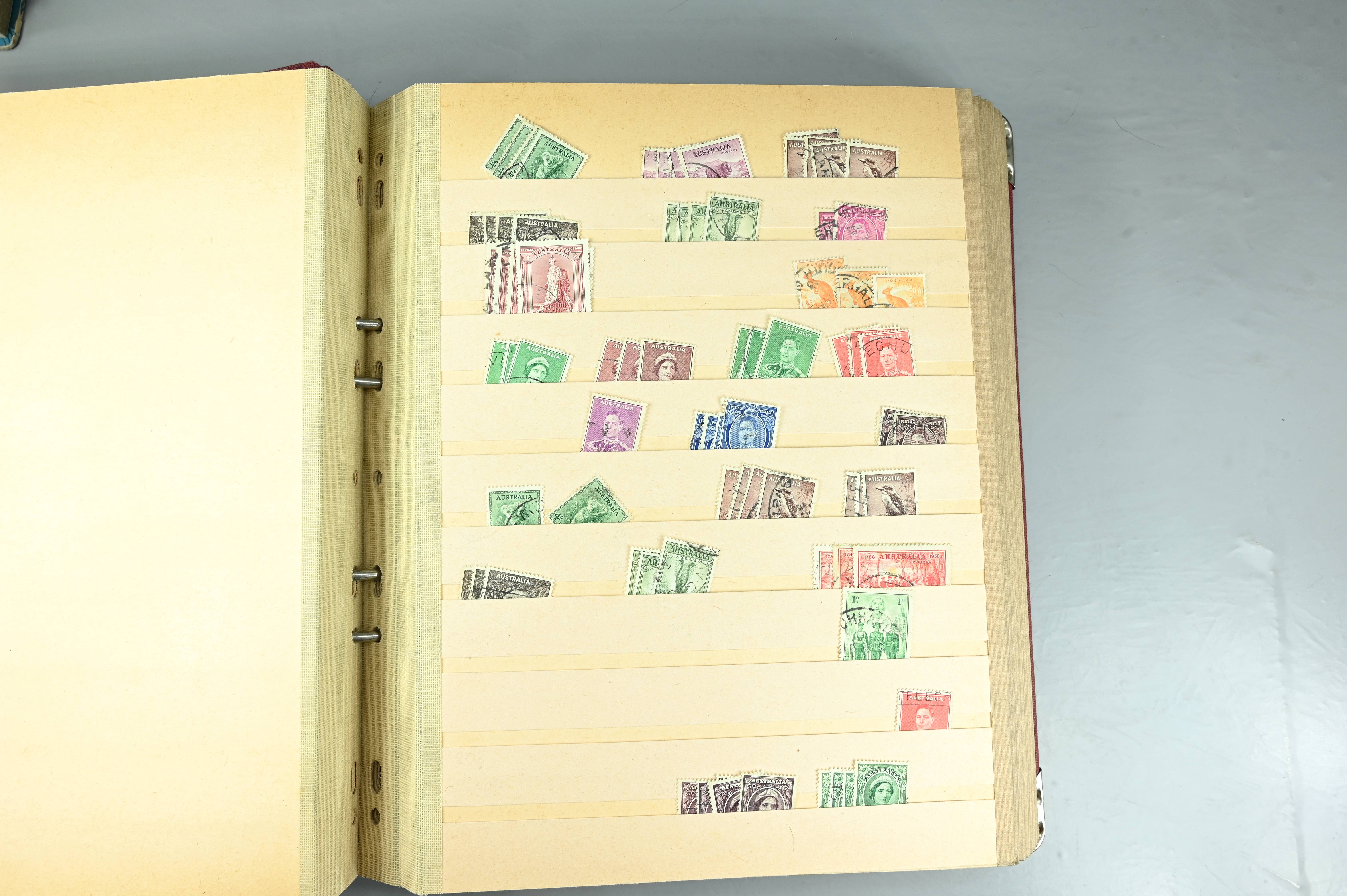 Extensive dealer stock book containing Commonwealth Of Asutralia stamps from SG1 onwards. Many Roos of various types, watermarks and dies. Strong mid range including sets, high values etc. The collection continues through to modern commemoratives, including sets, high values to $10. At the end of the collection contains a strong range of Postage Dues, and Mint stamps from KGV heads onwards, including 2s Roo. This collection has not been checked and is sold as is. |