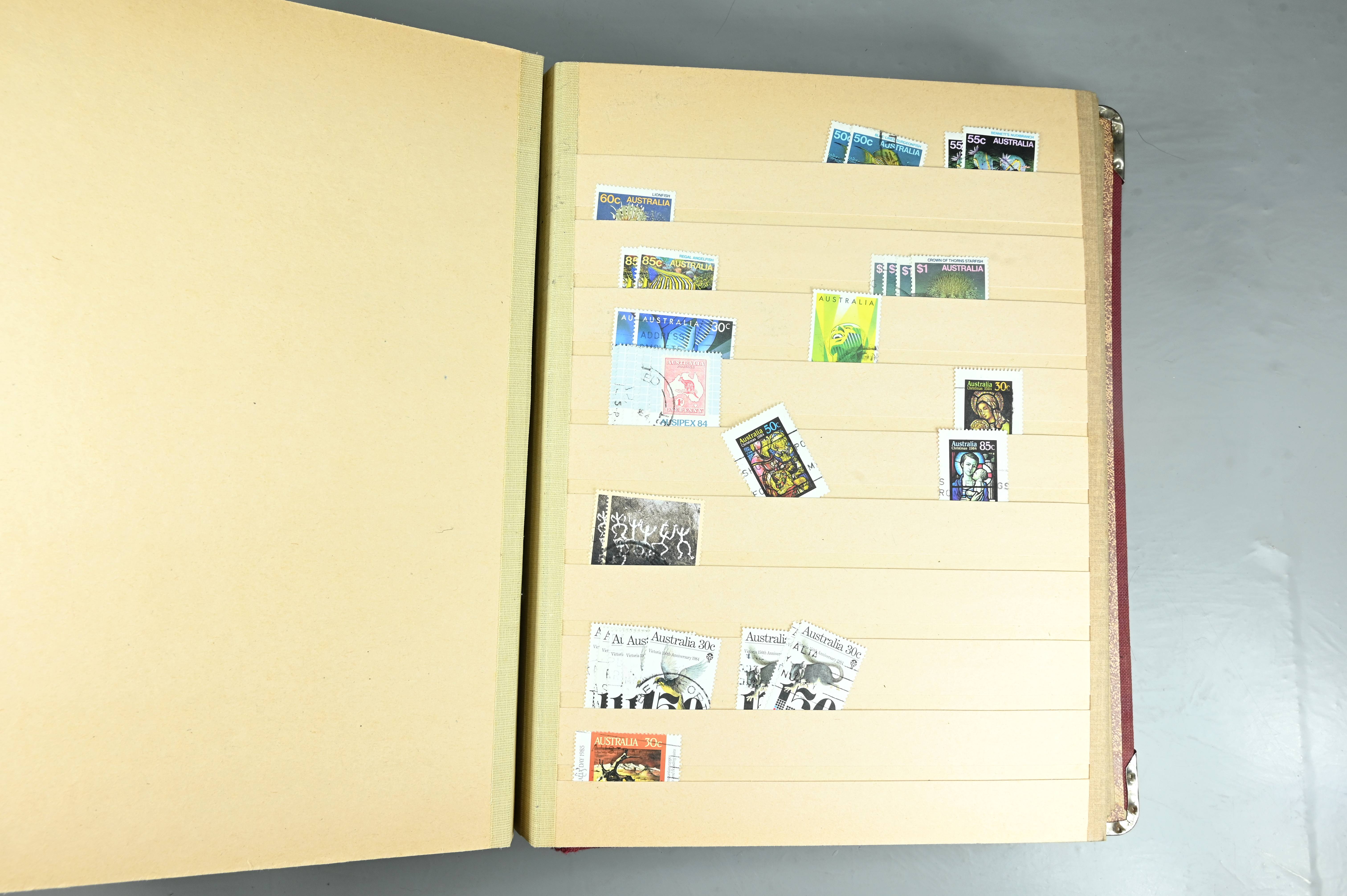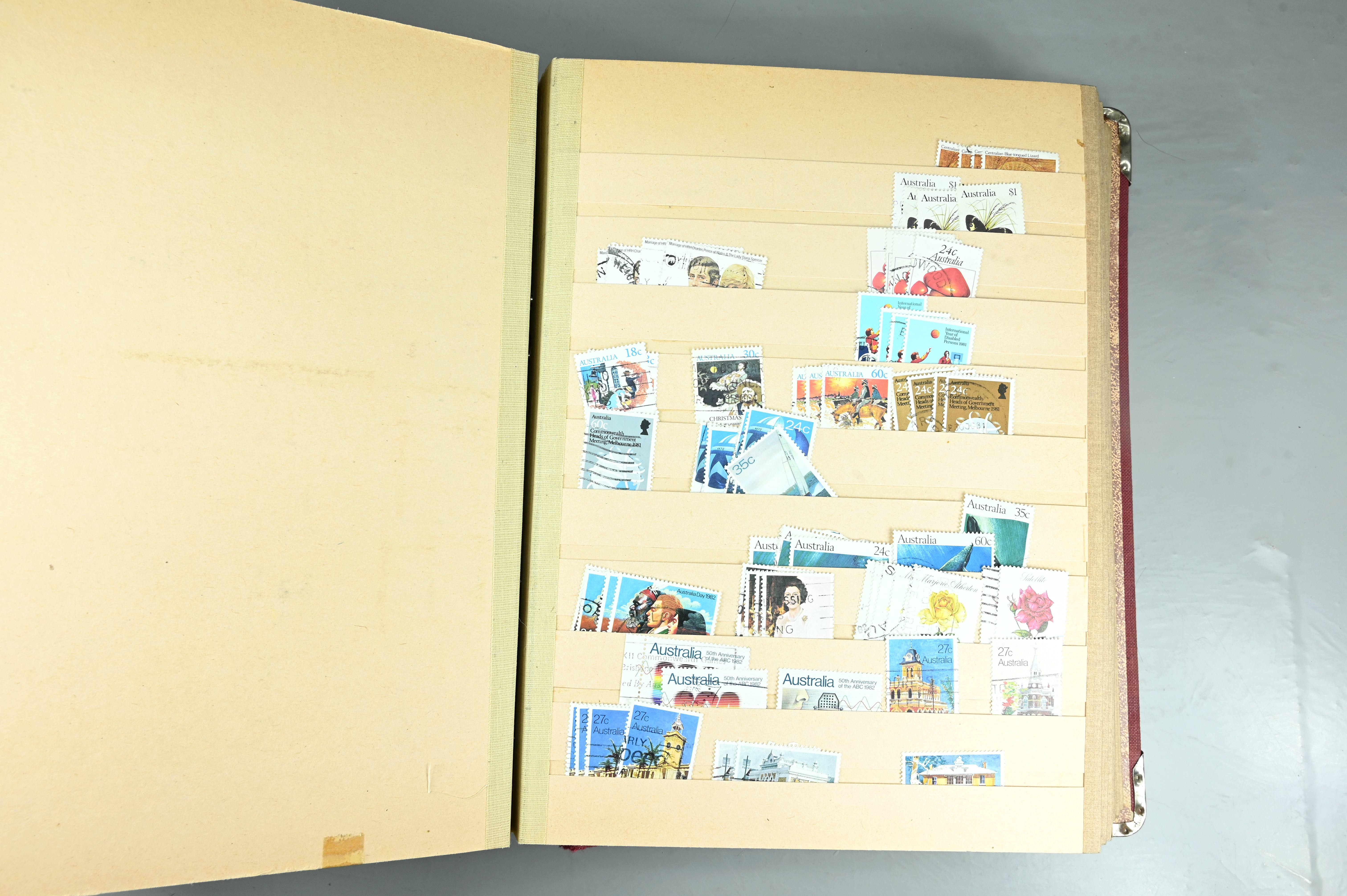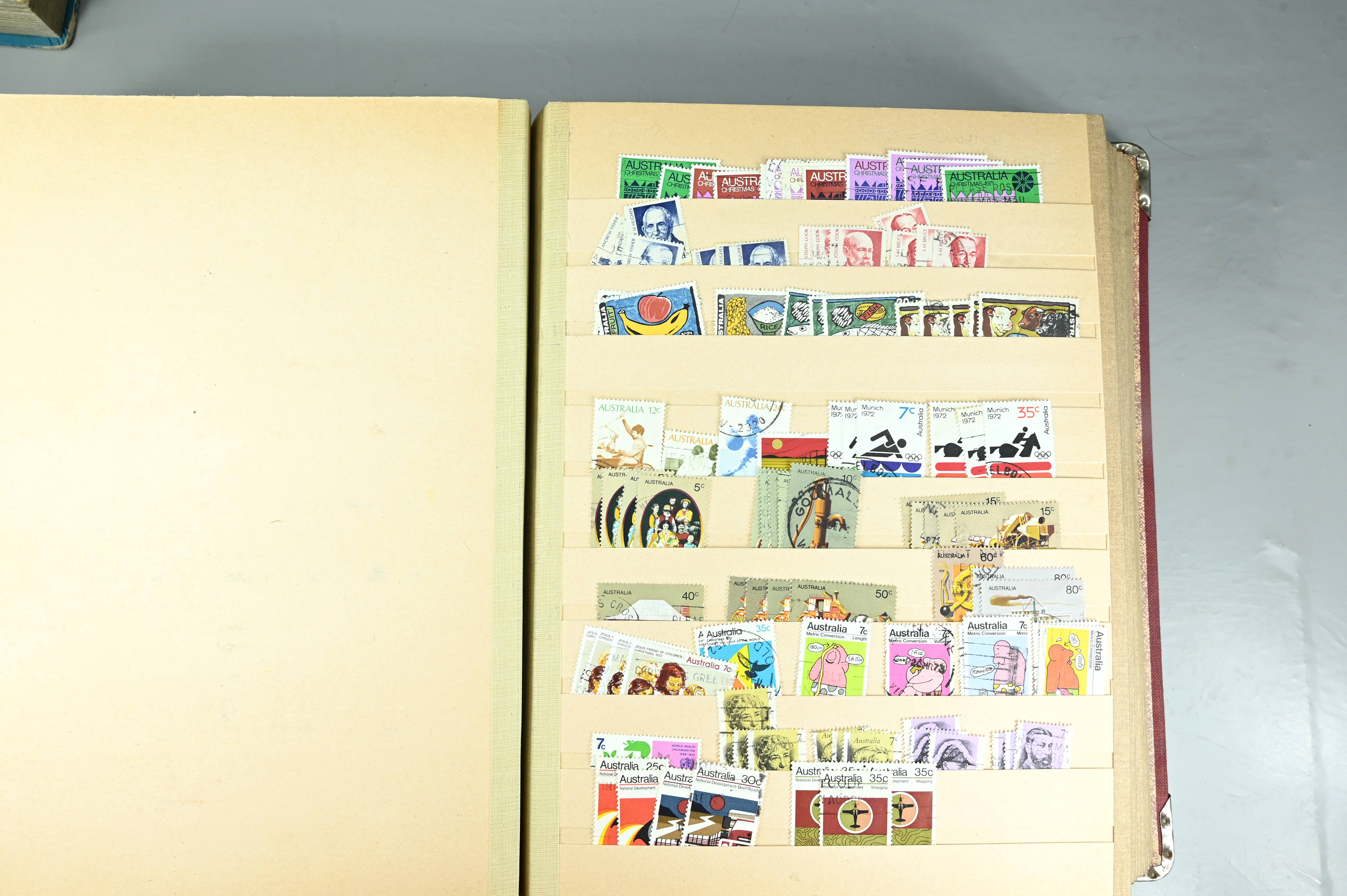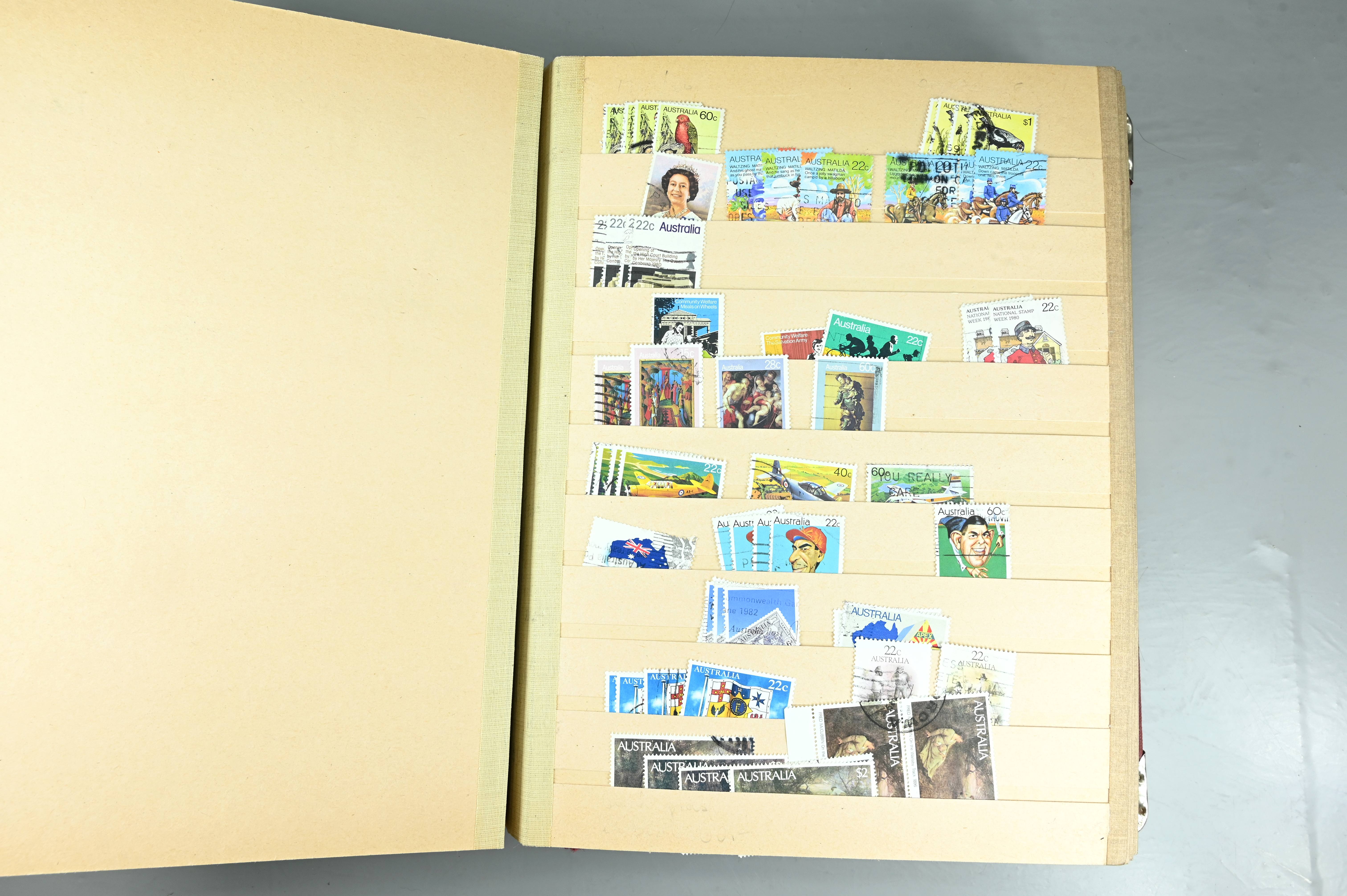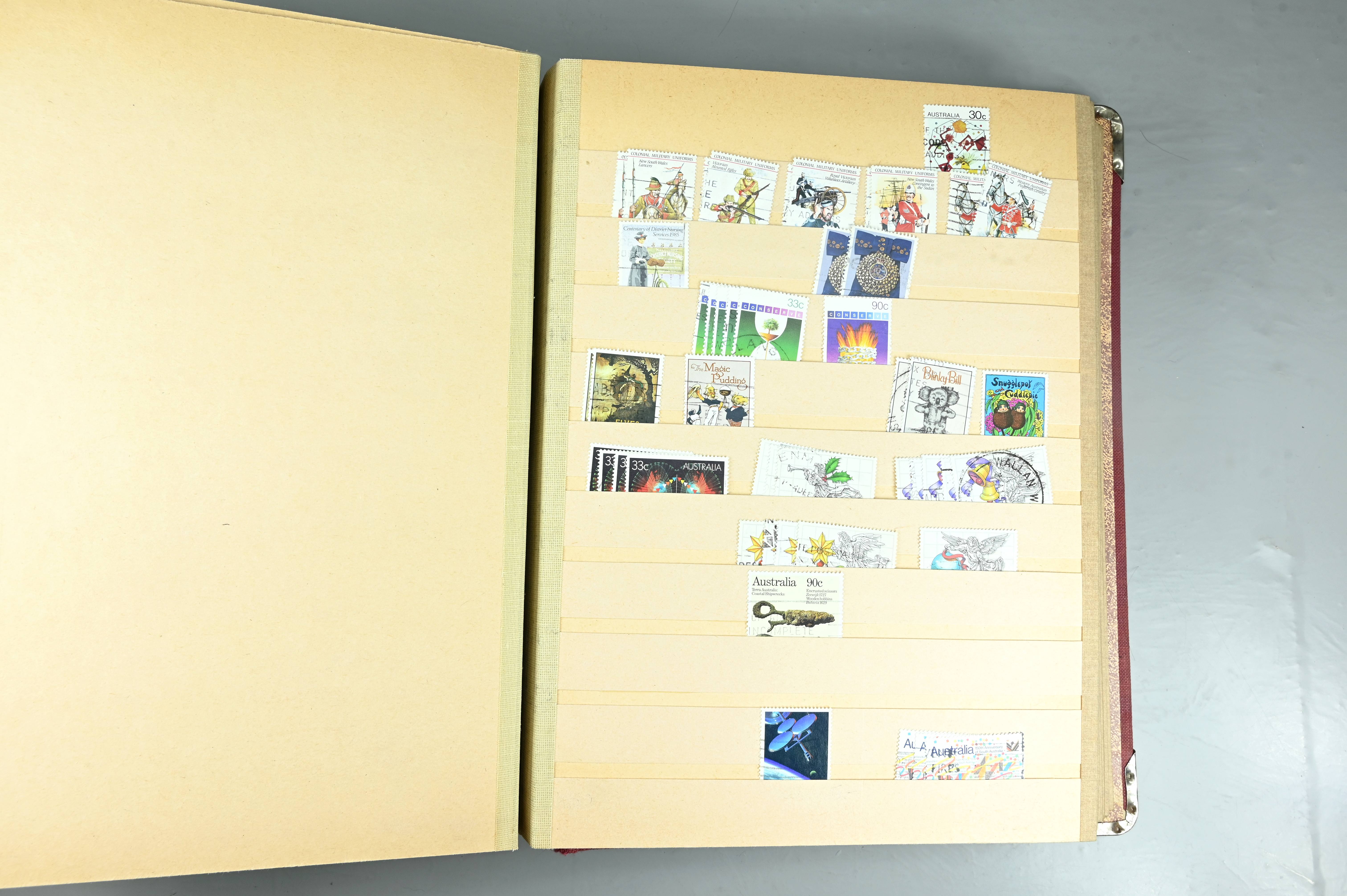 Extensive dealer stock book containing Commonwealth Of Asutralia stamps from SG1 onwards. Many Roos of various types, watermarks and dies. Strong mid range including sets, high values etc. The collection continues through to modern commemoratives, including sets, high values to $10. At the end of the collection contains a strong range of Postage Dues, and Mint stamps from KGV heads onwards, including 2s Roo. This collection has not been checked and is sold as is. |