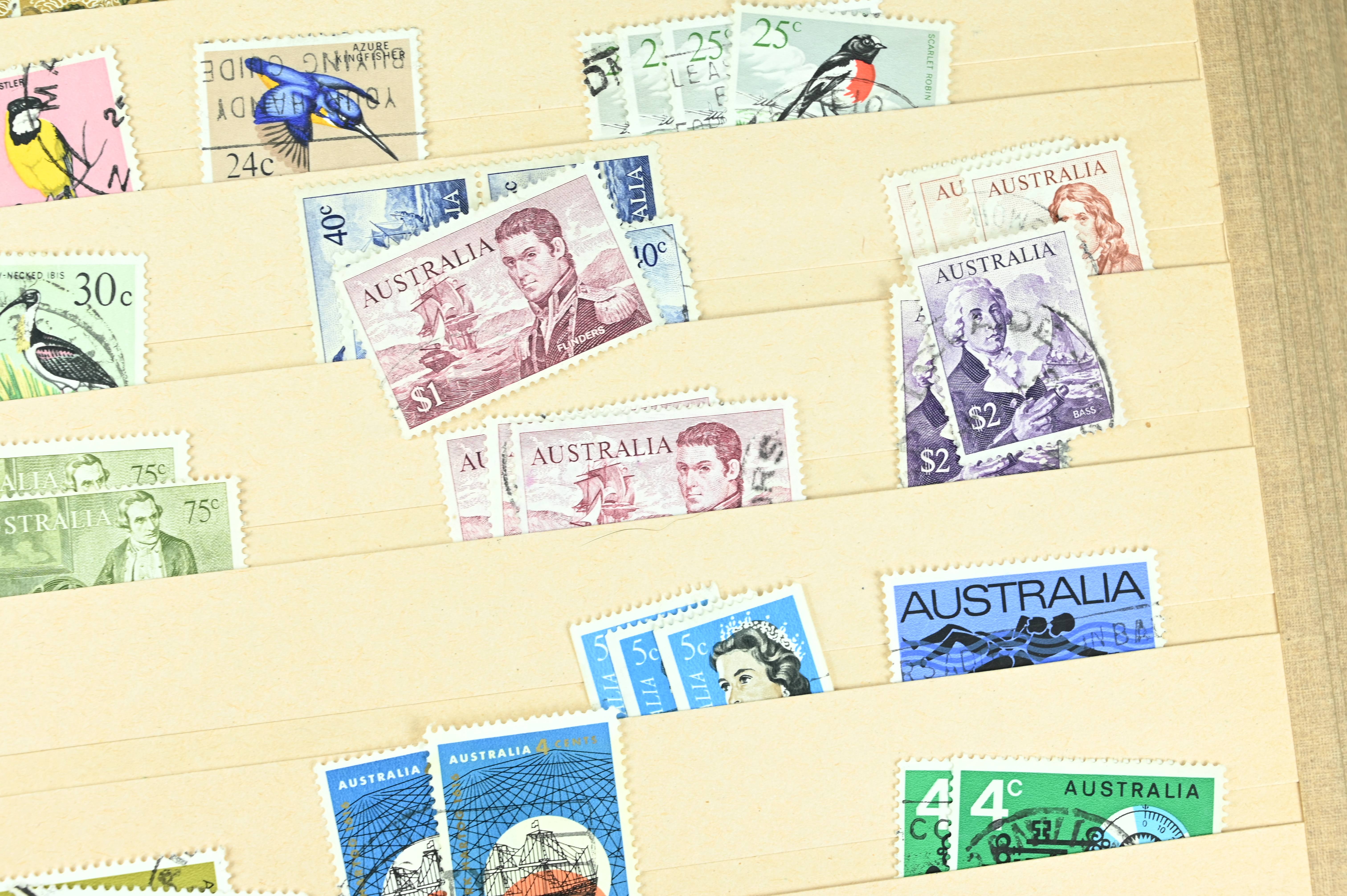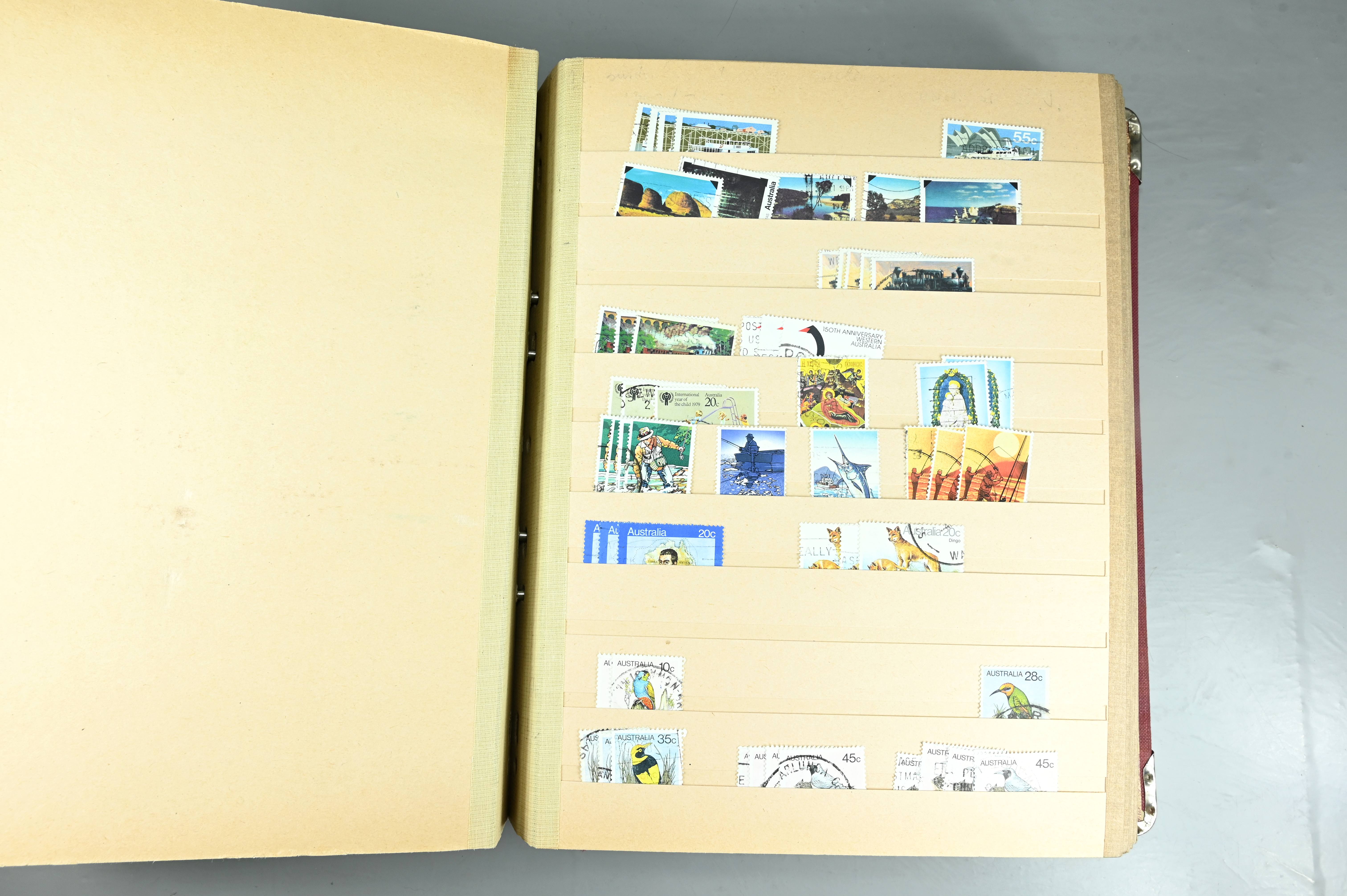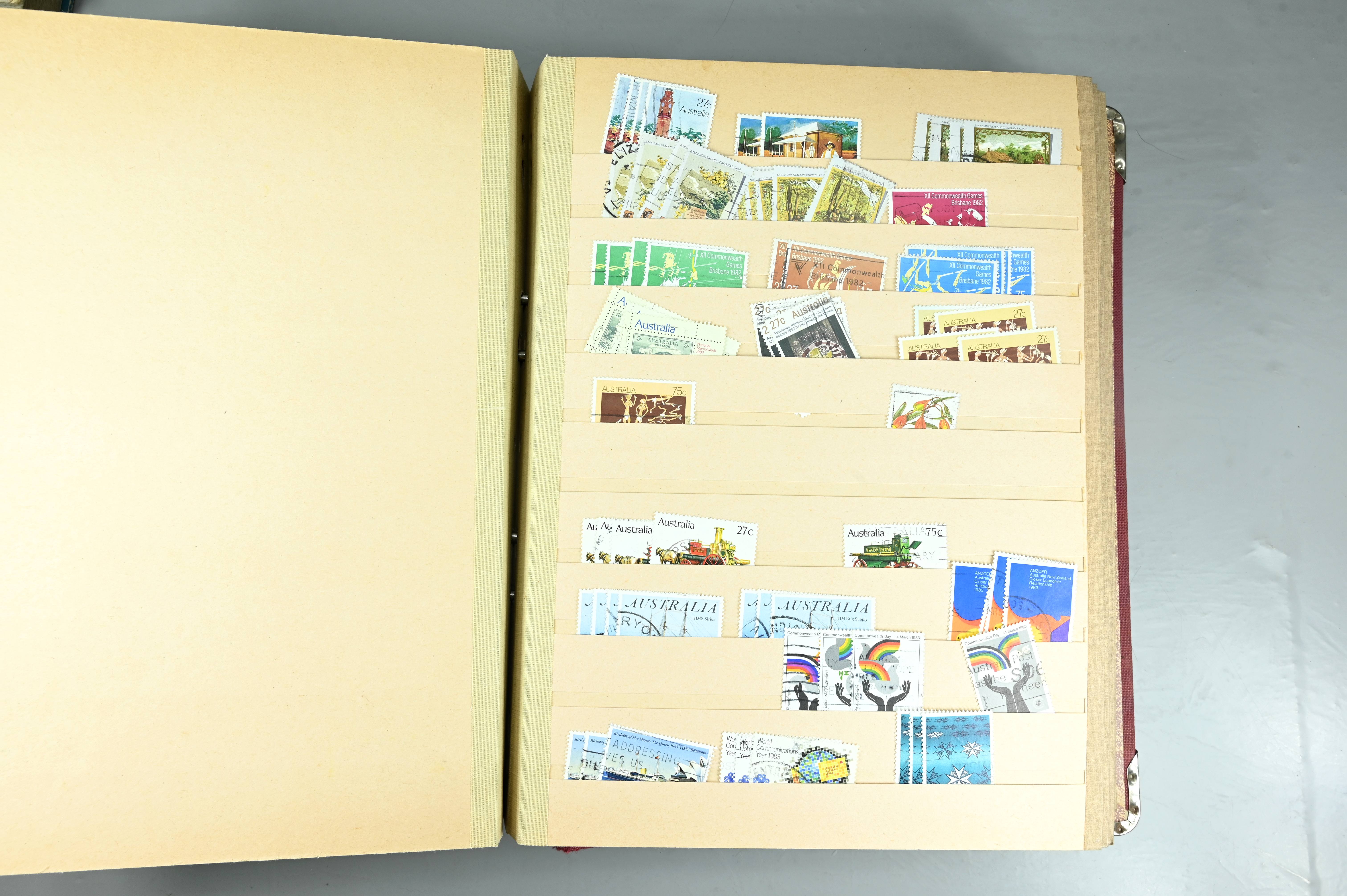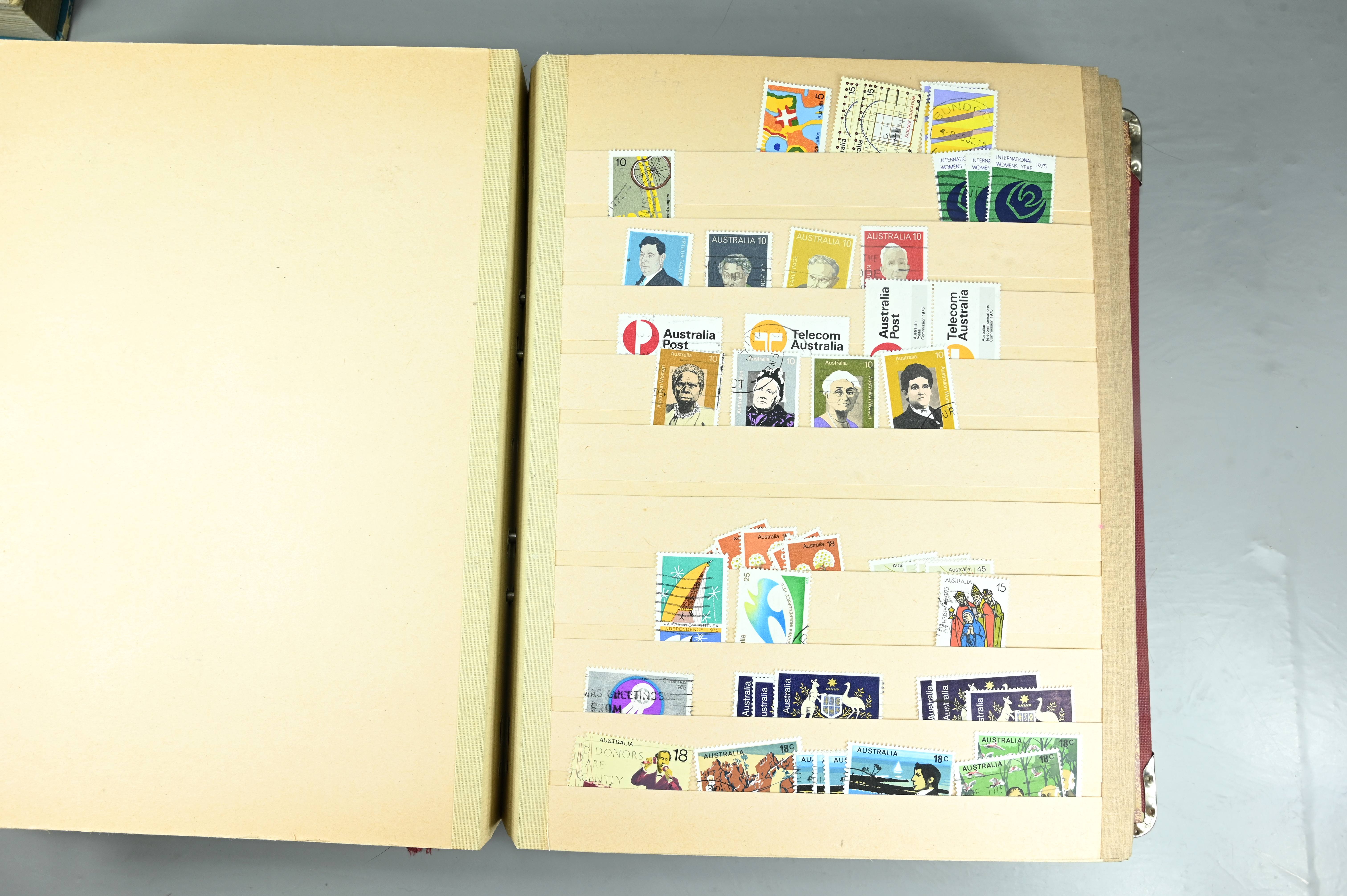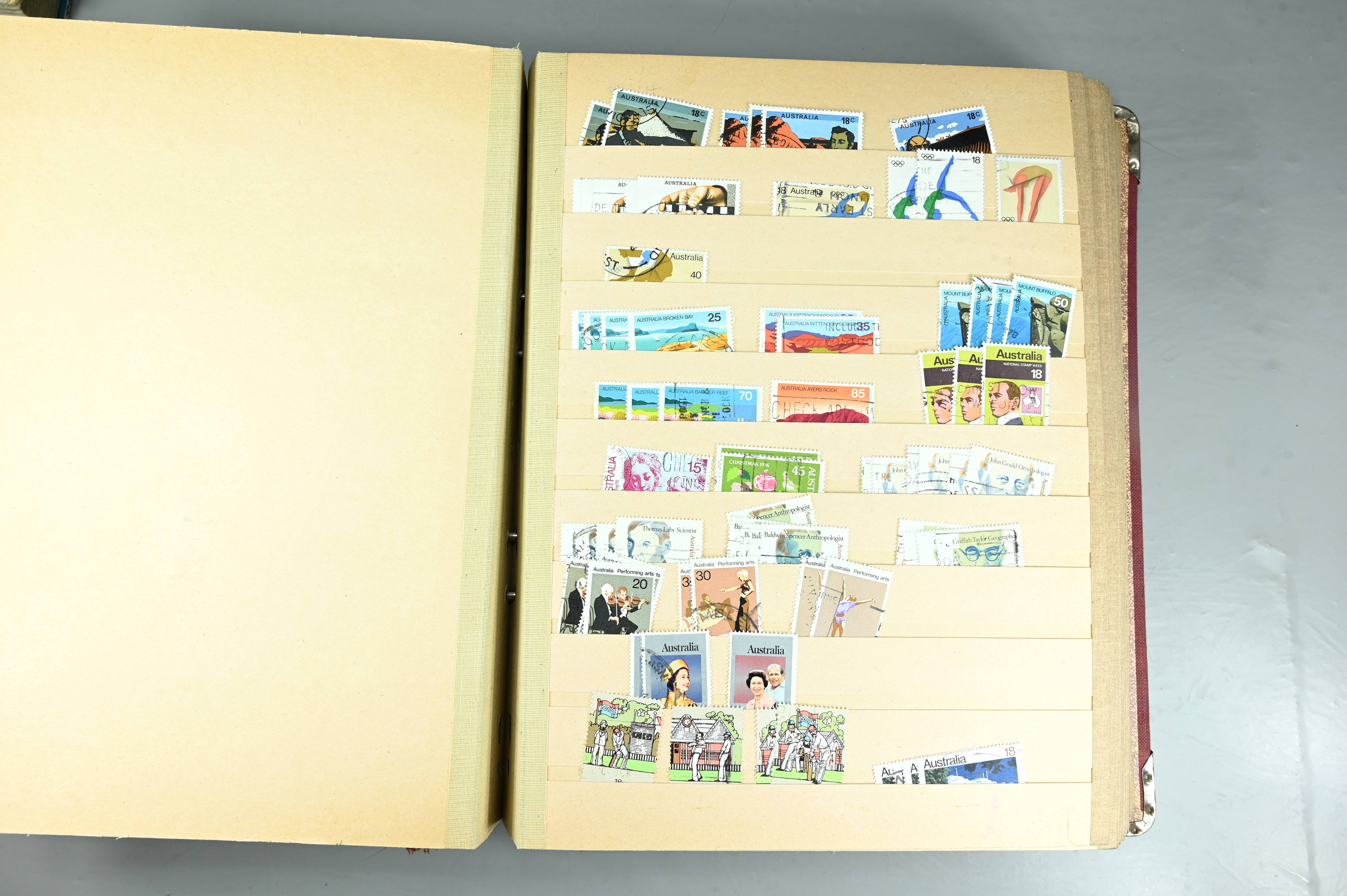 Extensive dealer stock book containing Commonwealth Of Asutralia stamps from SG1 onwards. Many Roos of various types, watermarks and dies. Strong mid range including sets, high values etc. The collection continues through to modern commemoratives, including sets, high values to $10. At the end of the collection contains a strong range of Postage Dues, and Mint stamps from KGV heads onwards, including 2s Roo. This collection has not been checked and is sold as is. |