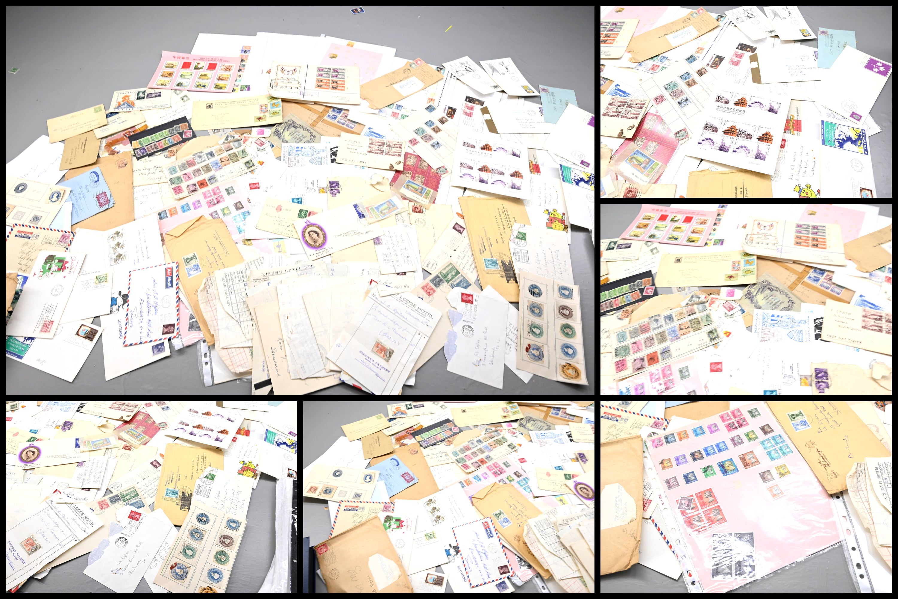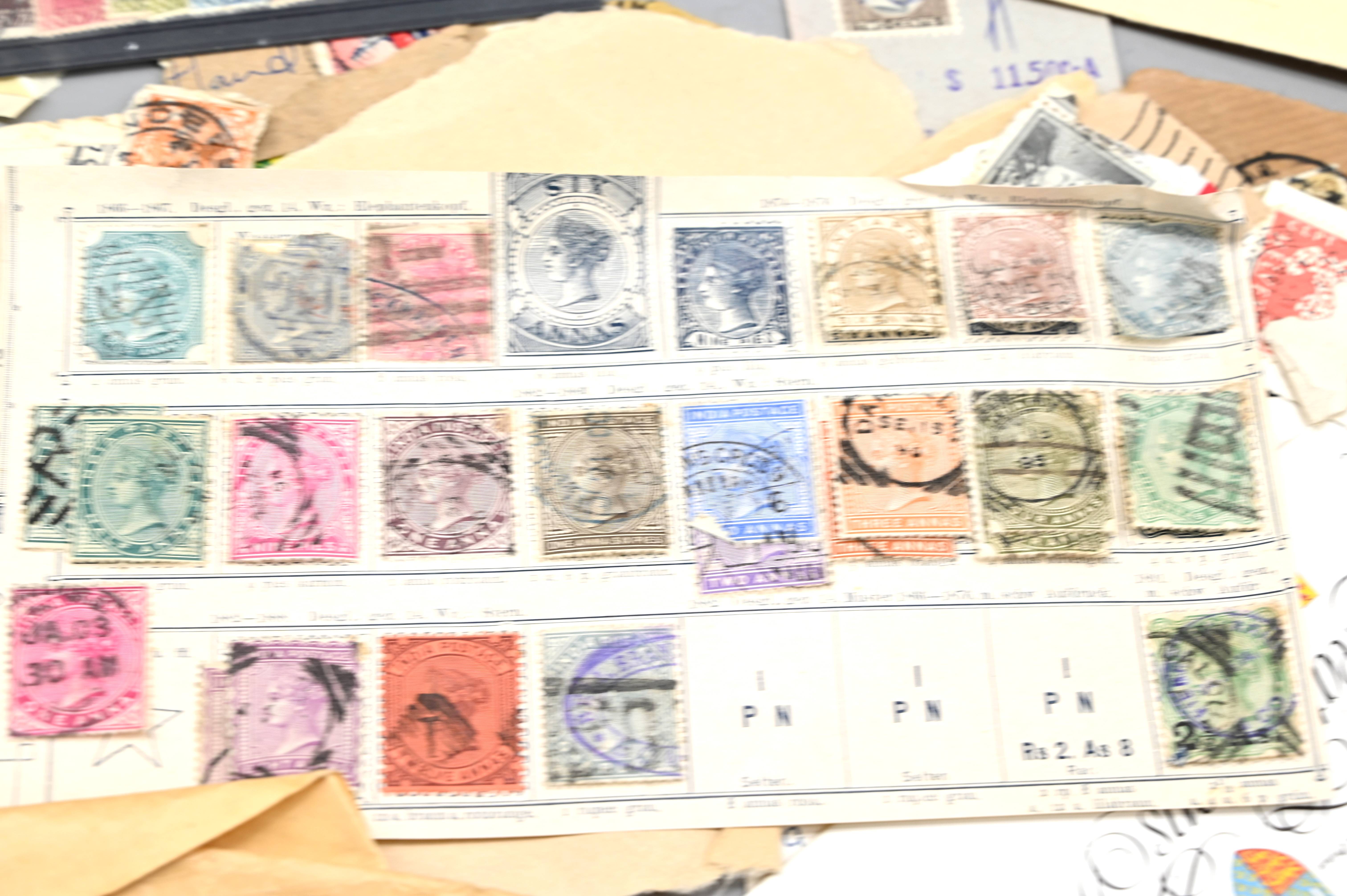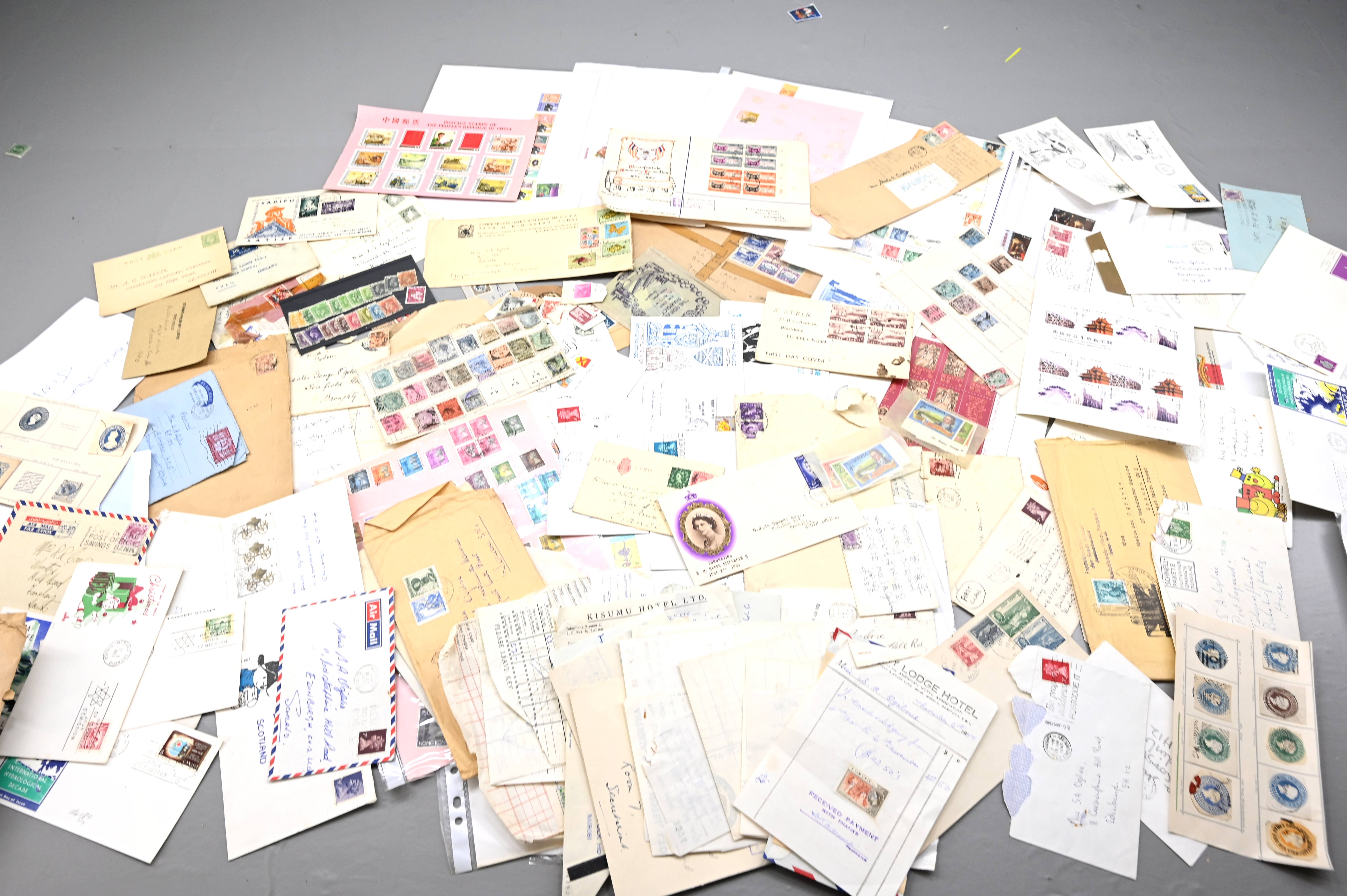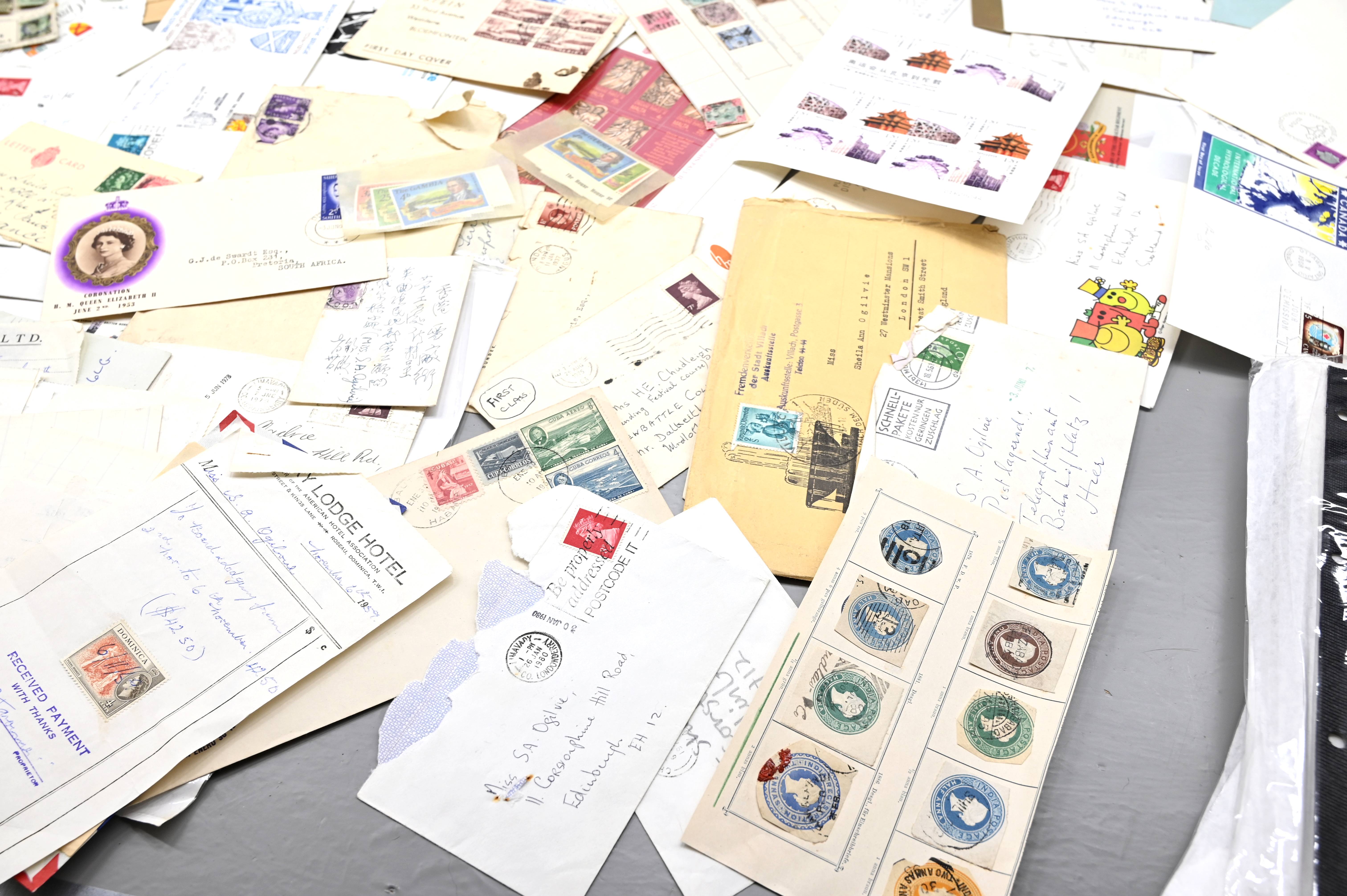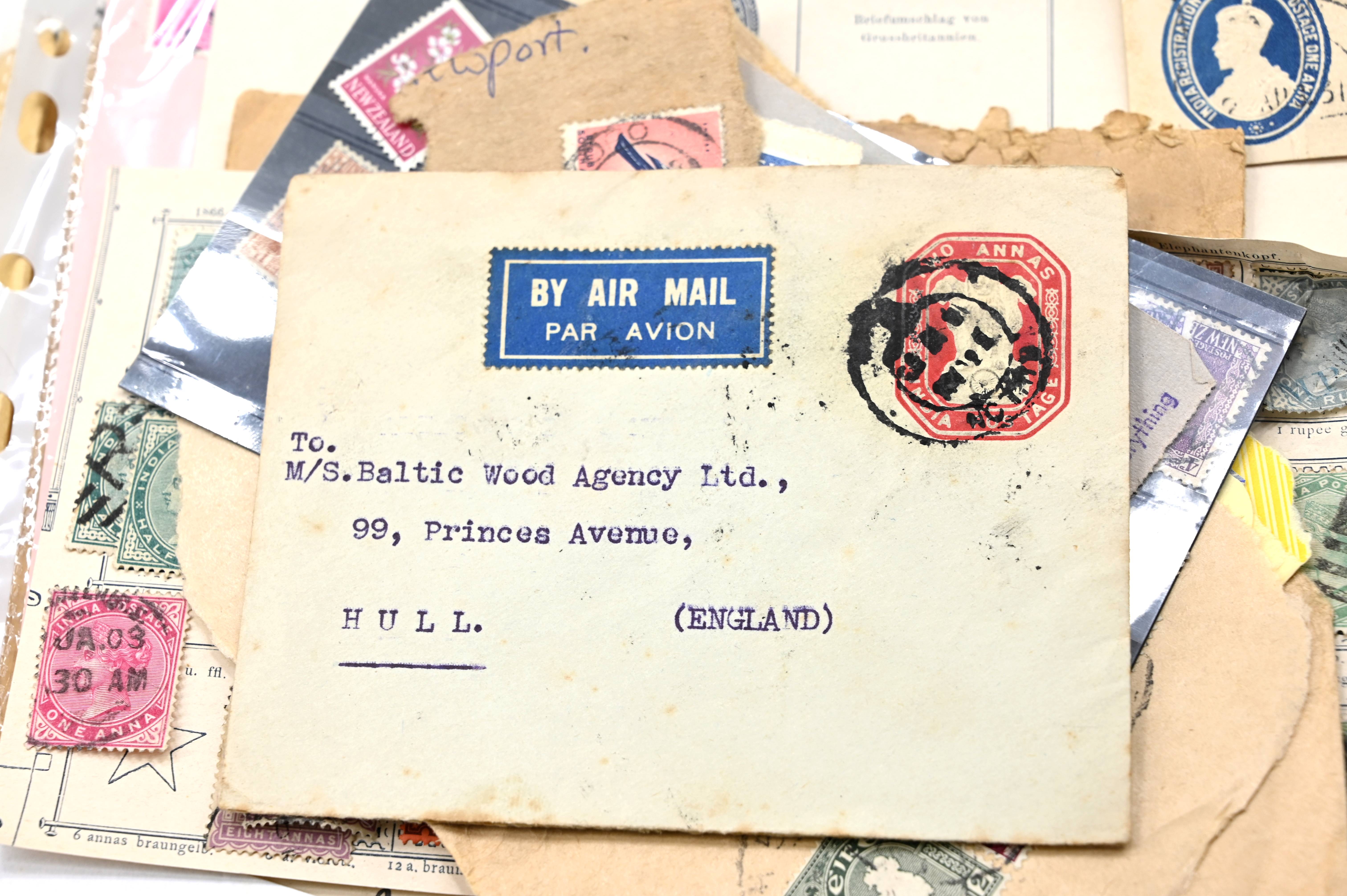 Interesting collection of stamps mainly consisting of covers, postcards, first day covers - early South Africa noted, fiscally uséd stamps, album pages including a good selection of early India, Kong Hong high values to $50 block of 4. This collection is completely unsorted. |
