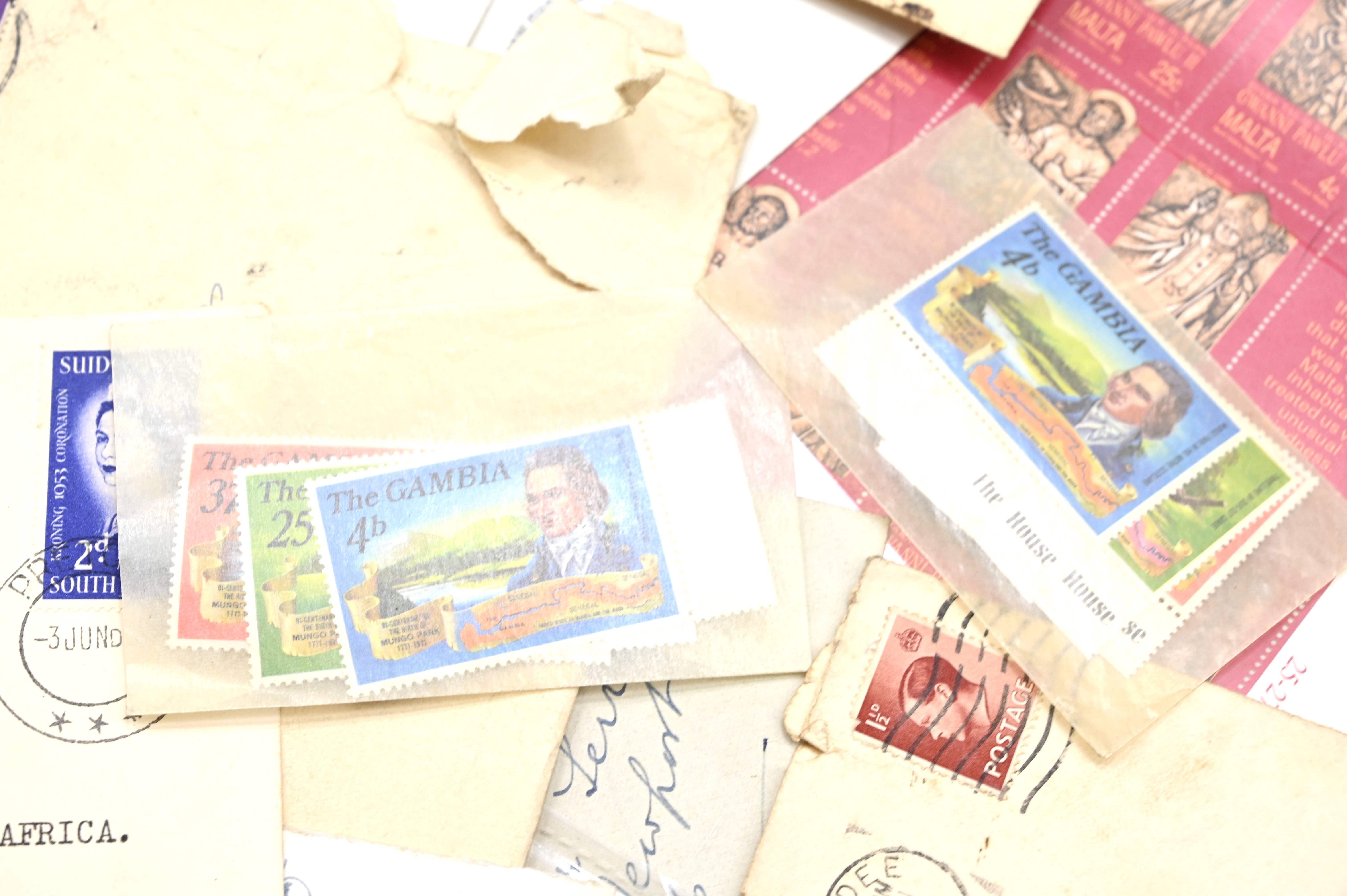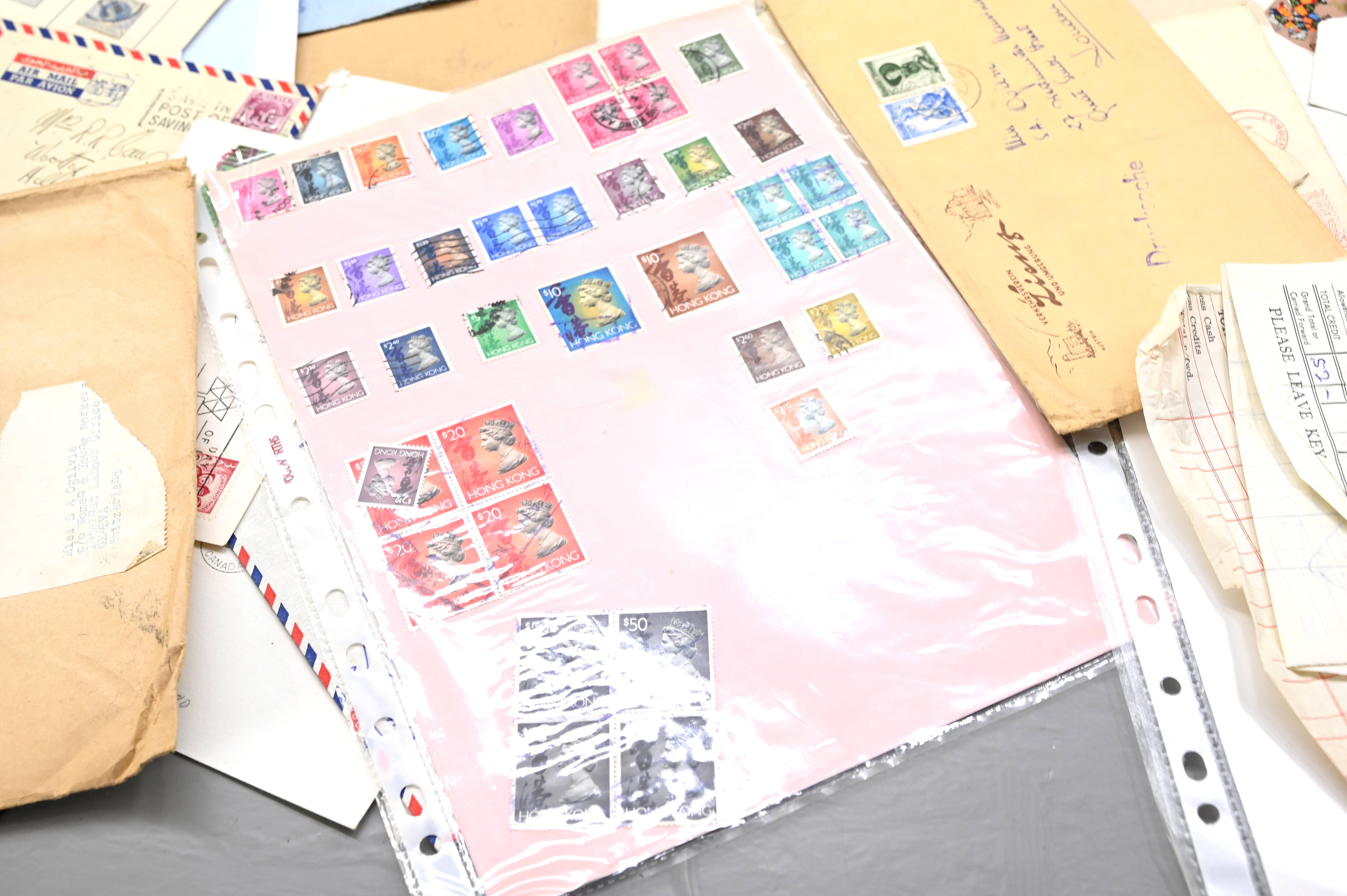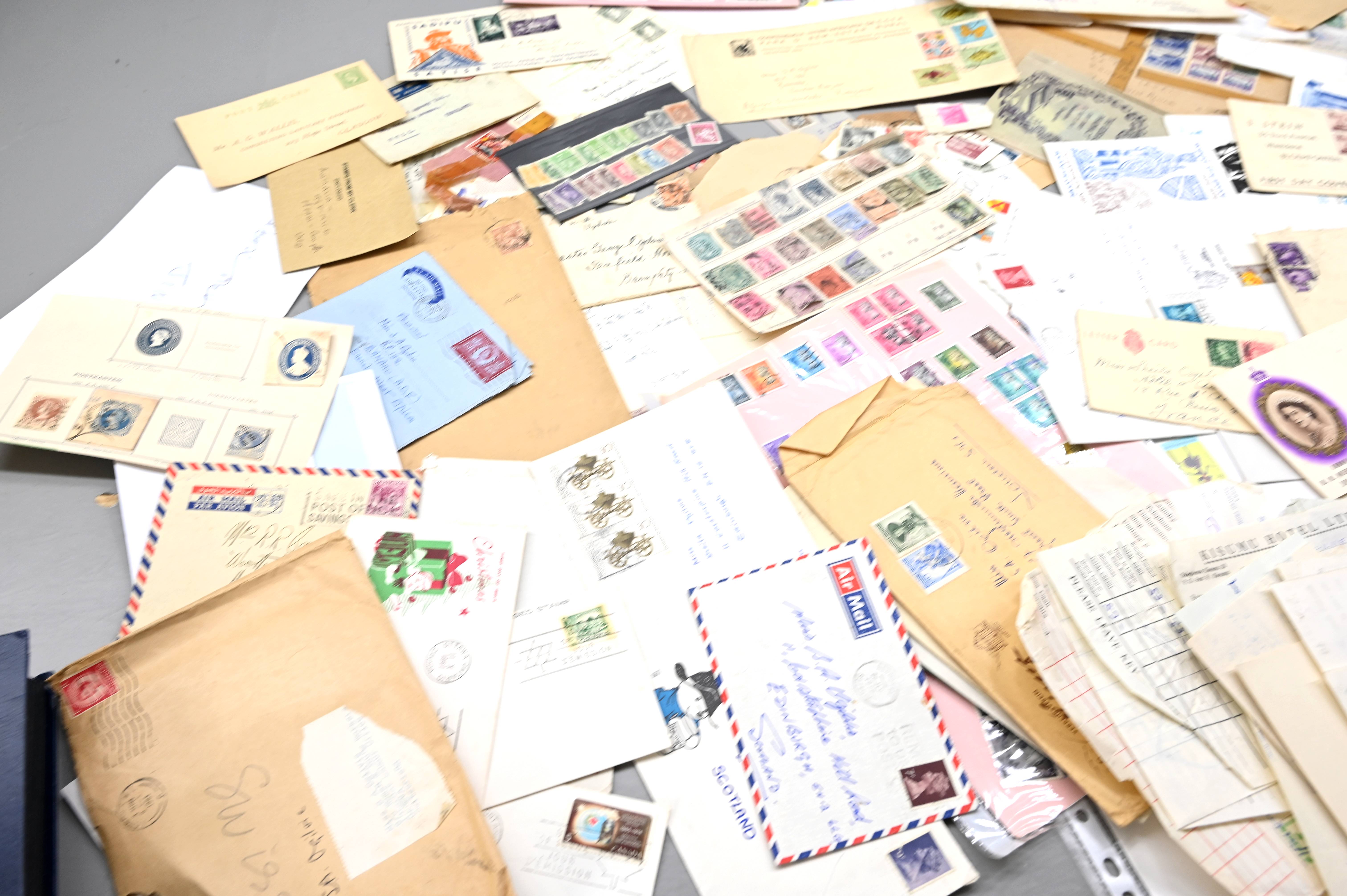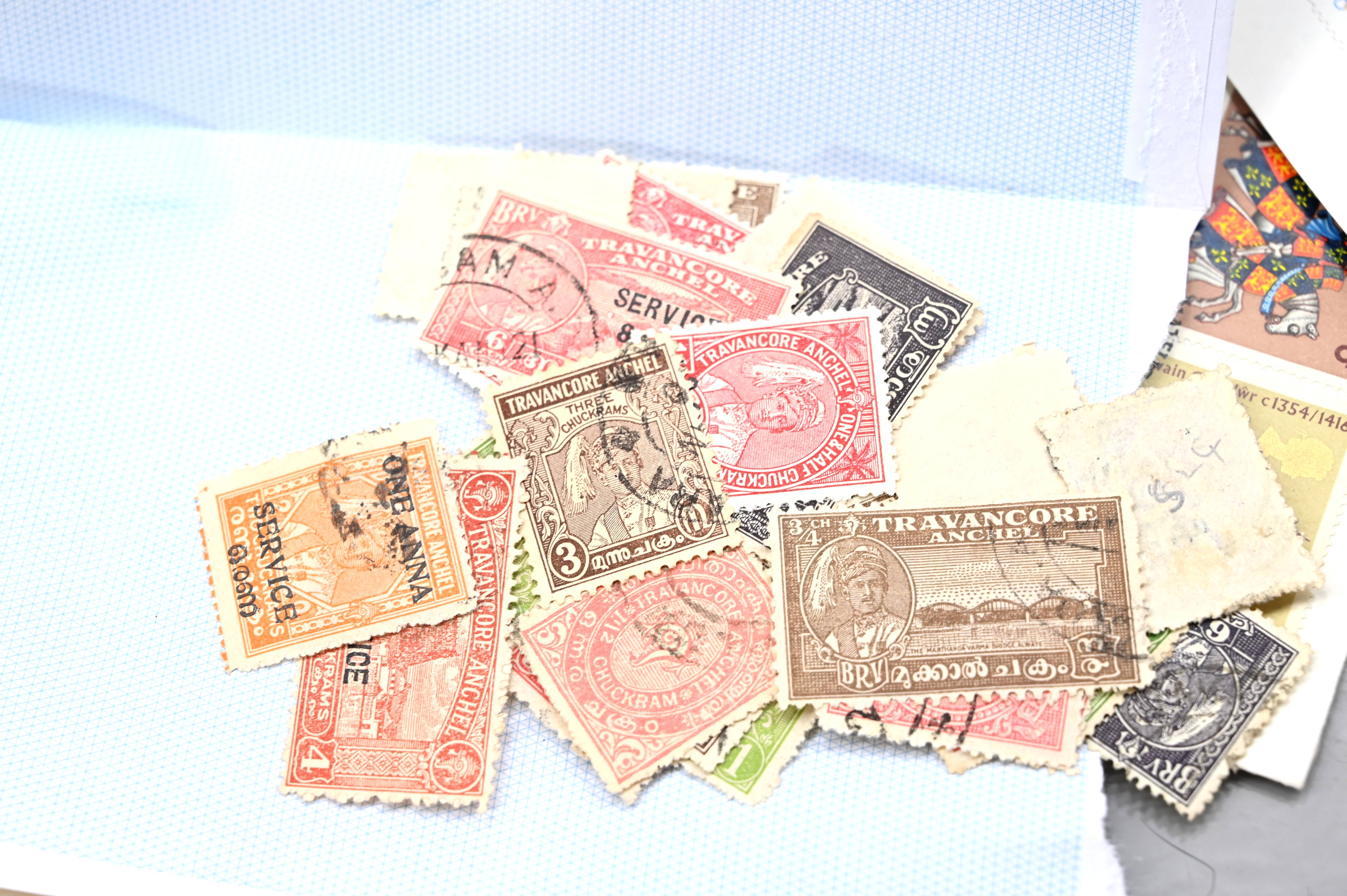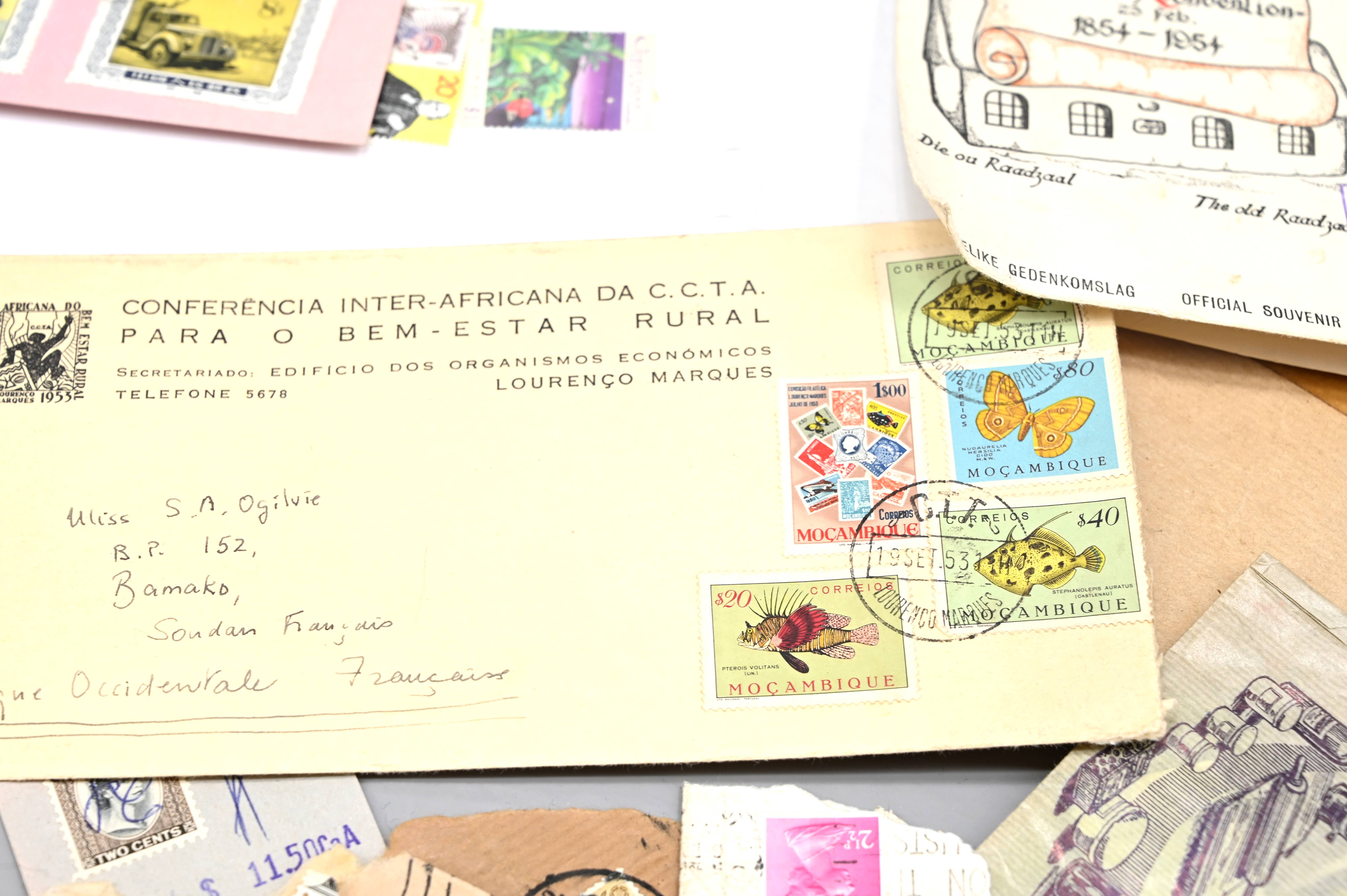 Interesting collection of stamps mainly consisting of covers, postcards, first day covers - early South Africa noted, fiscally uséd stamps, album pages including a good selection of early India, Kong Hong high values to $50 block of 4. This collection is completely unsorted. |