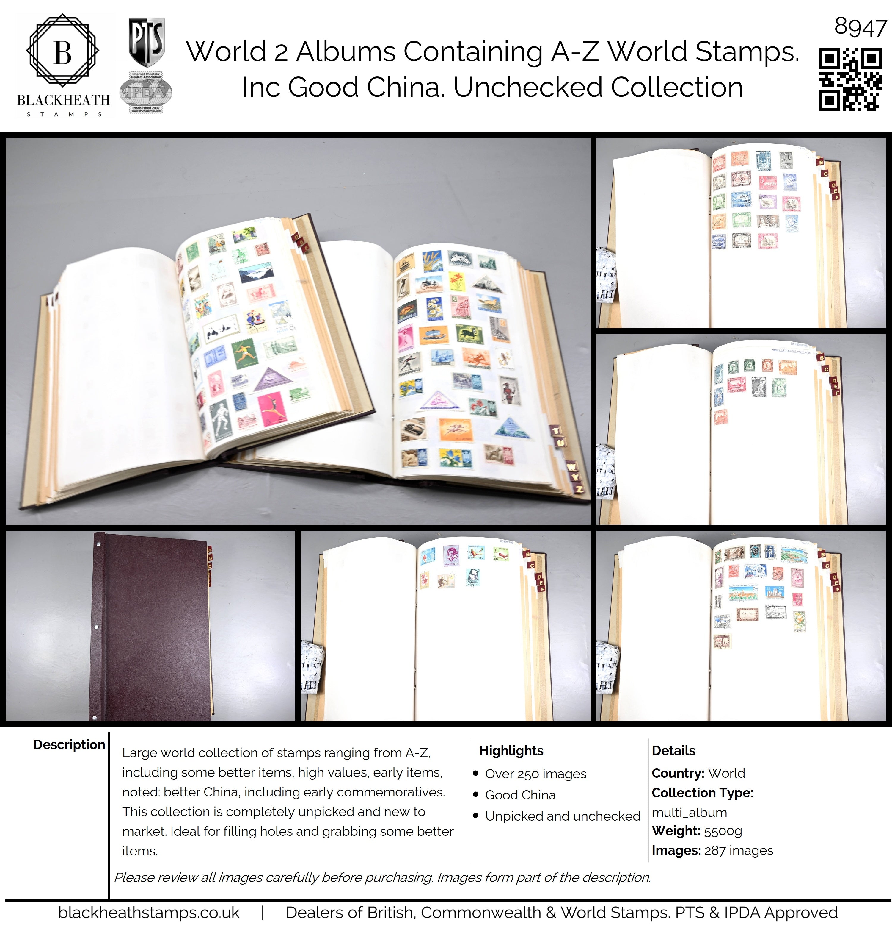 8947 World : 2 Albums Containing A-Z World Stamps. Inc Good China. Unchecked. 289 Images: Country: World Description: Large world collection of stamps ranging from A-Z, including some better items, high values, early items, noted: better China, including early commemoratives. This collection is completely unpicked and new to market. Ideal for filling holes and grabbing some better items. Highlights: Over 250 images Good China Unpicked and unchecked Collection Type: multi_album Collection weight: 5500g