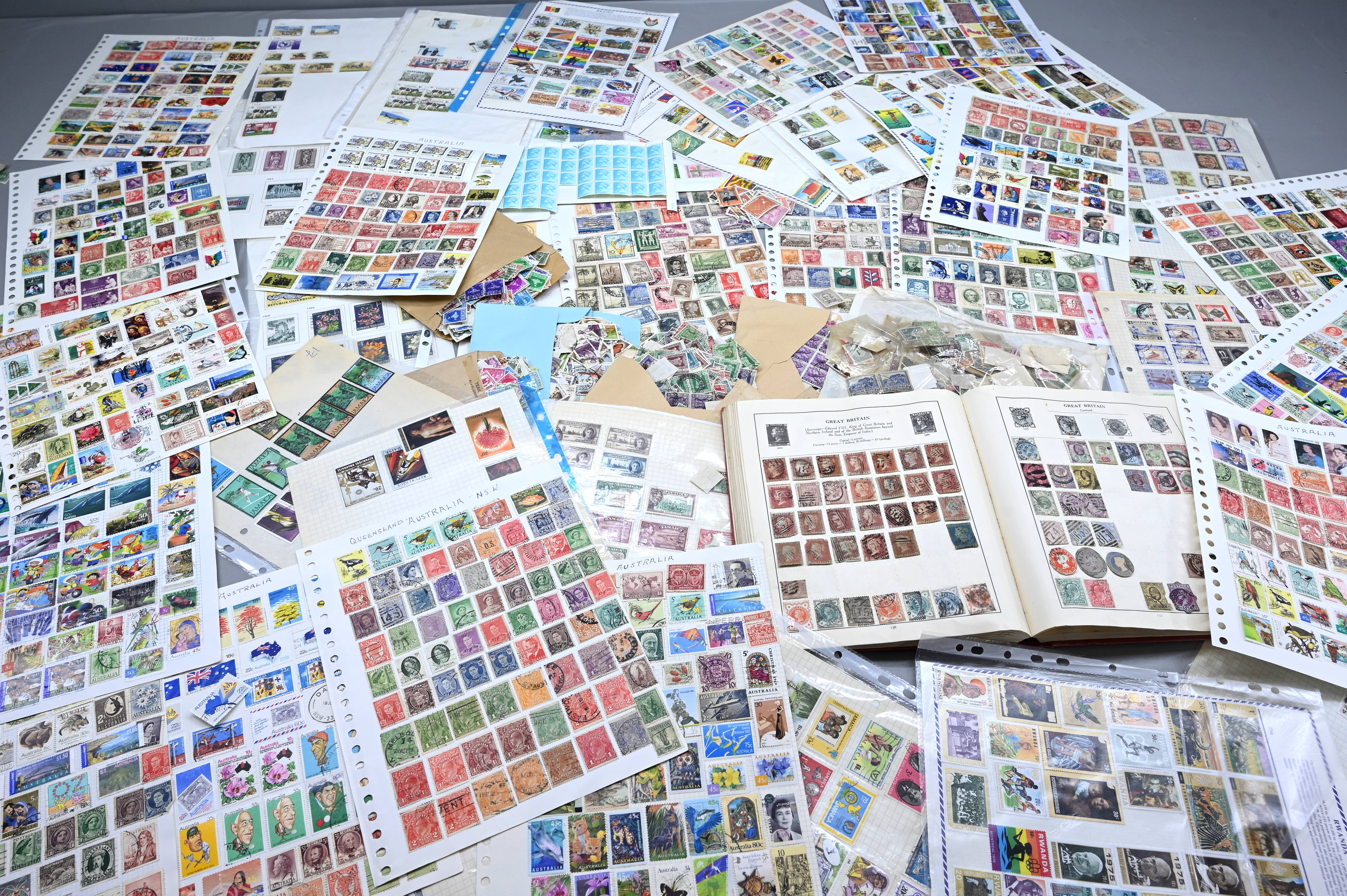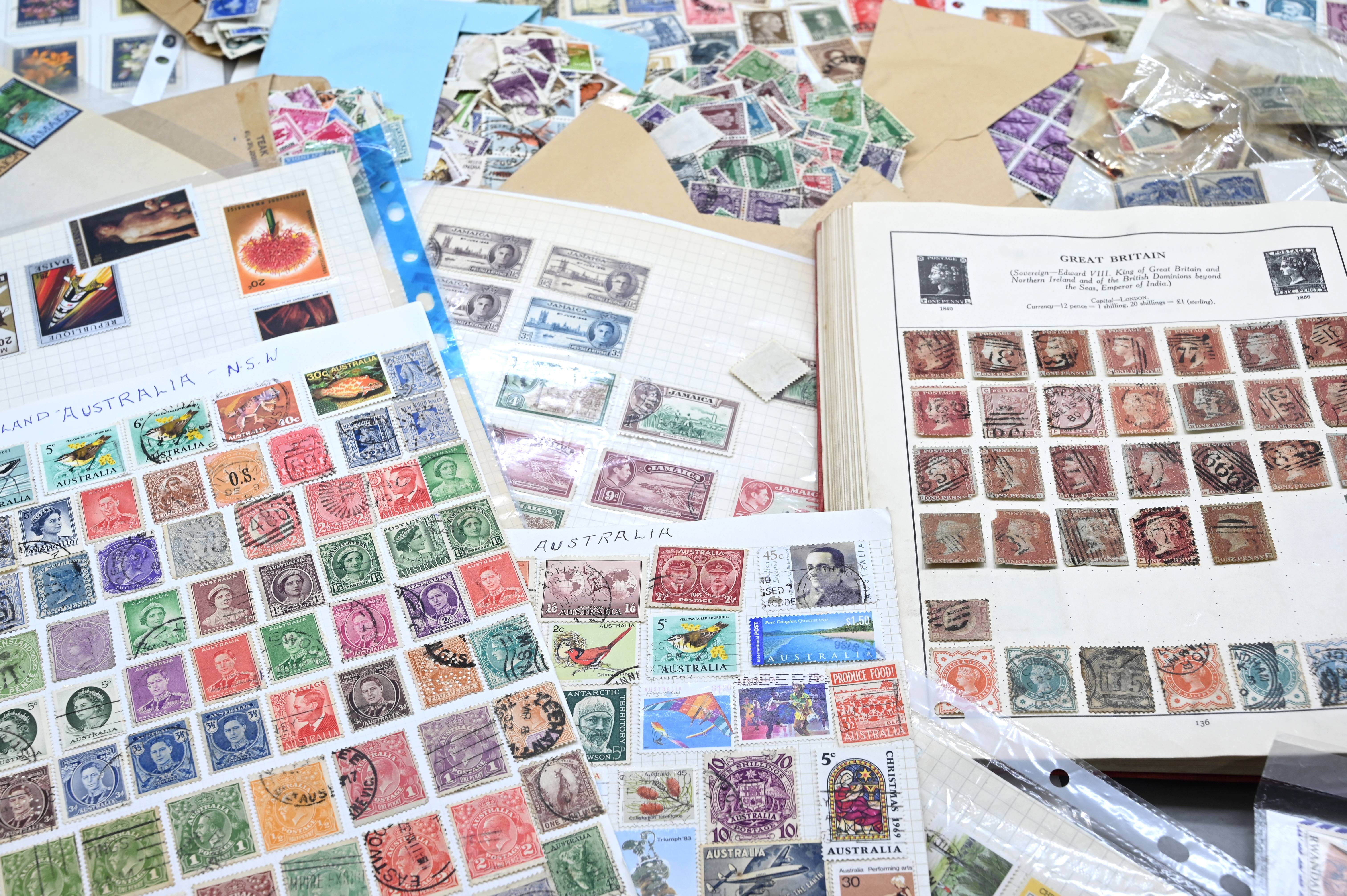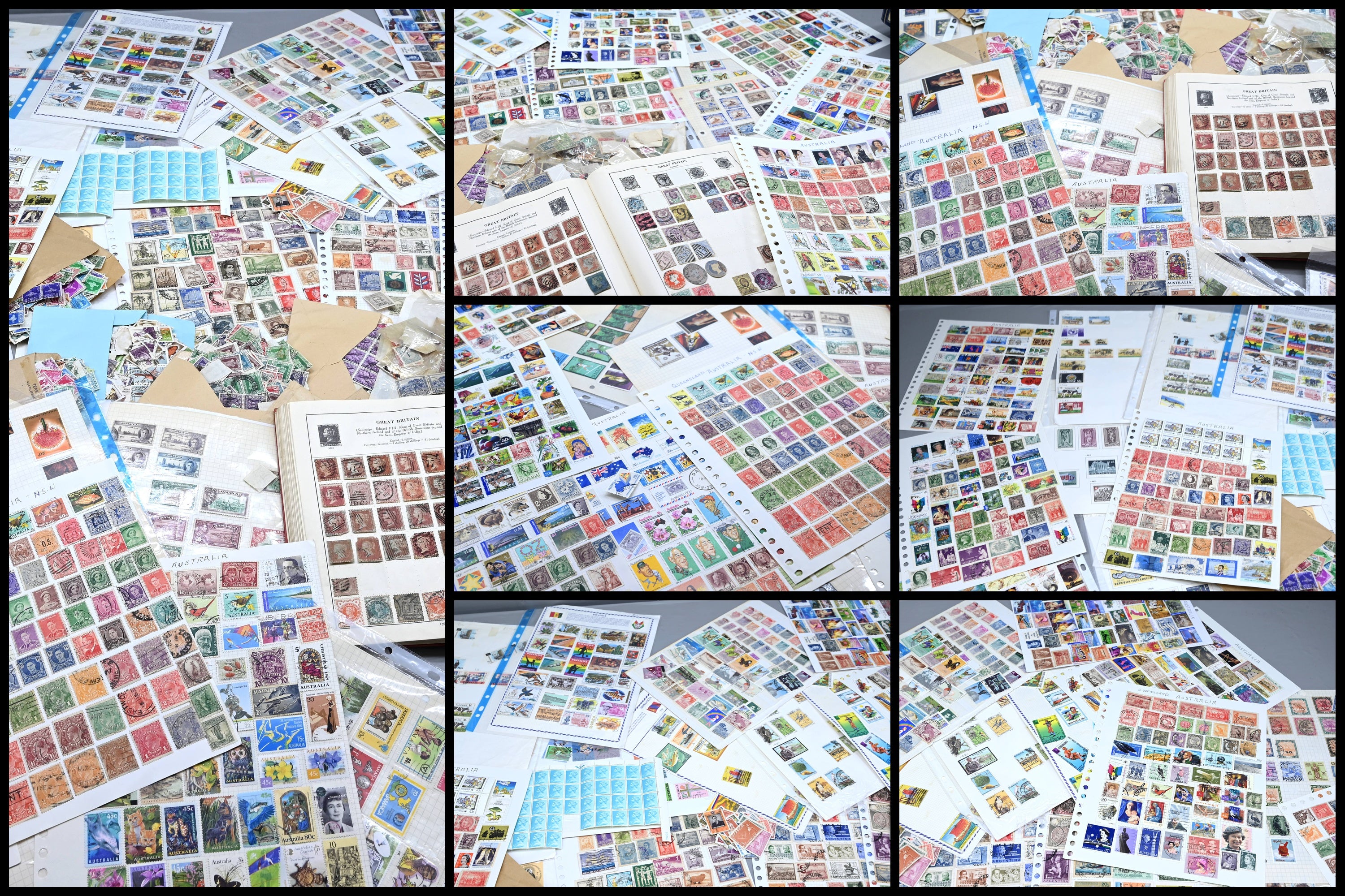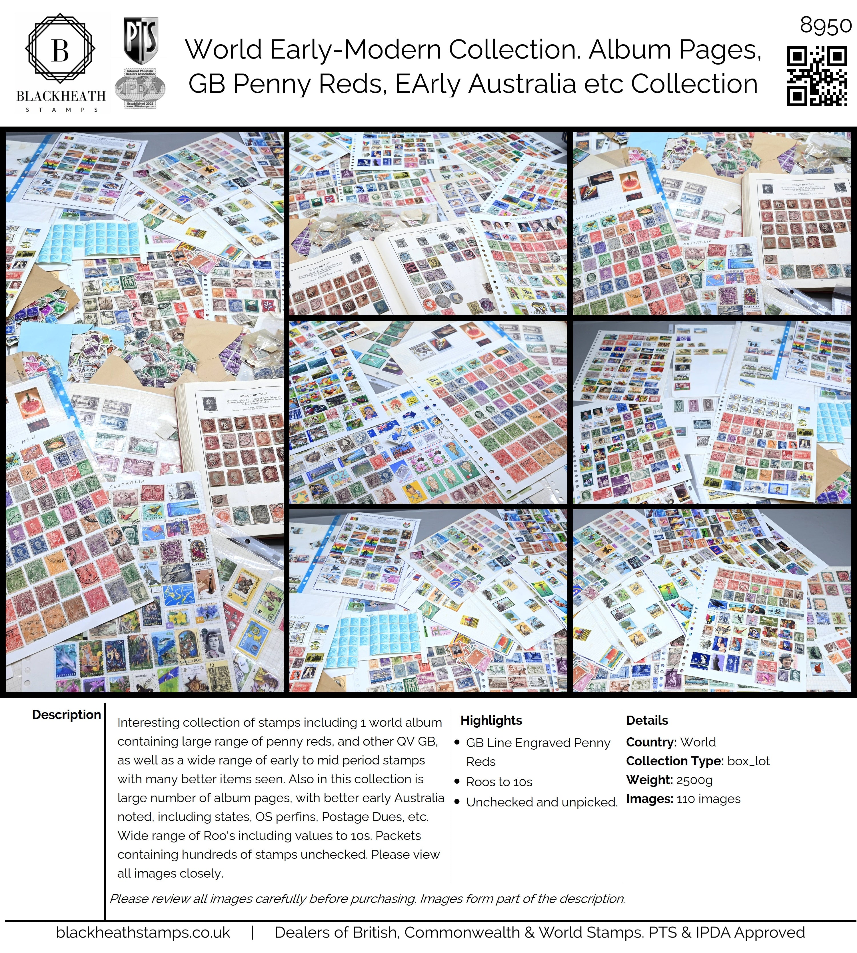 8950 World: Early-Modern Collection. Album Pages, GB Penny Reds, EArly Australia etc. 112 Images: Country: World Description: Interesting collection of stamps including 1 world album containing large range of penny reds, and other QV GB, as well as a wide range of early to mid period stamps with many better items seen. Also in this collection is large number of album pages, with better early Australia noted, including states, OS perfins, Postage Dues, etc. Wide range of Roo's including values to 10s. Packets containing hundreds of stamps unchecked. Please view all images closely. Highlights: GB Line Engraved Penny Reds Roos to 10s Unchecked and unpicked. Collection Type: box_lot Collection weight: 2500g